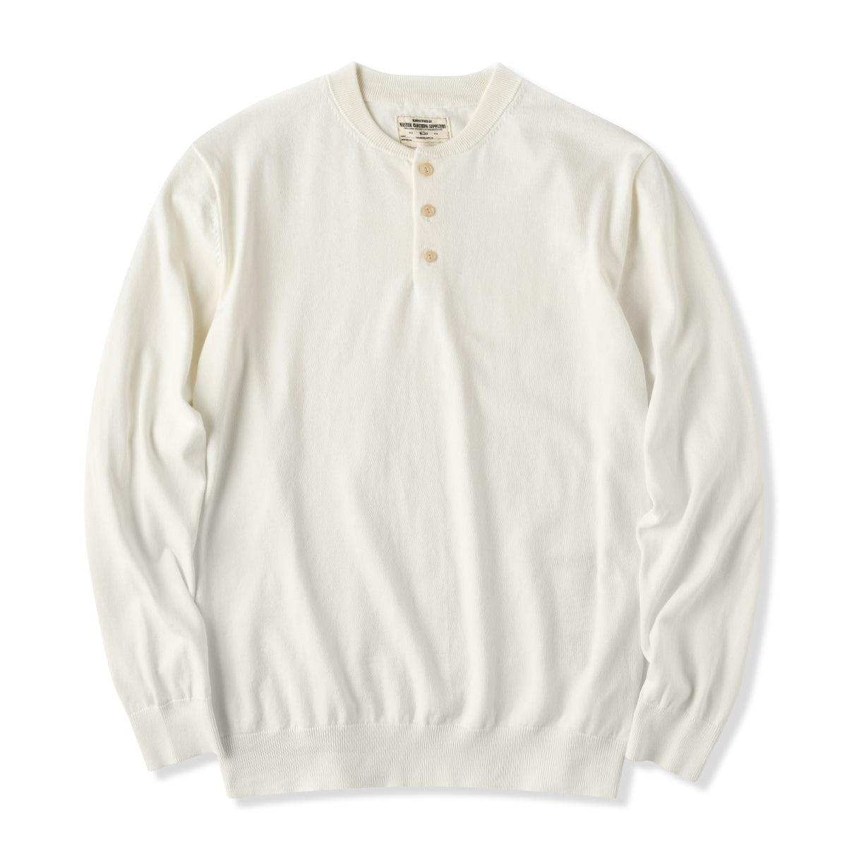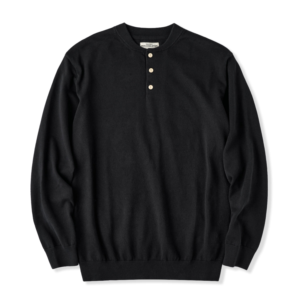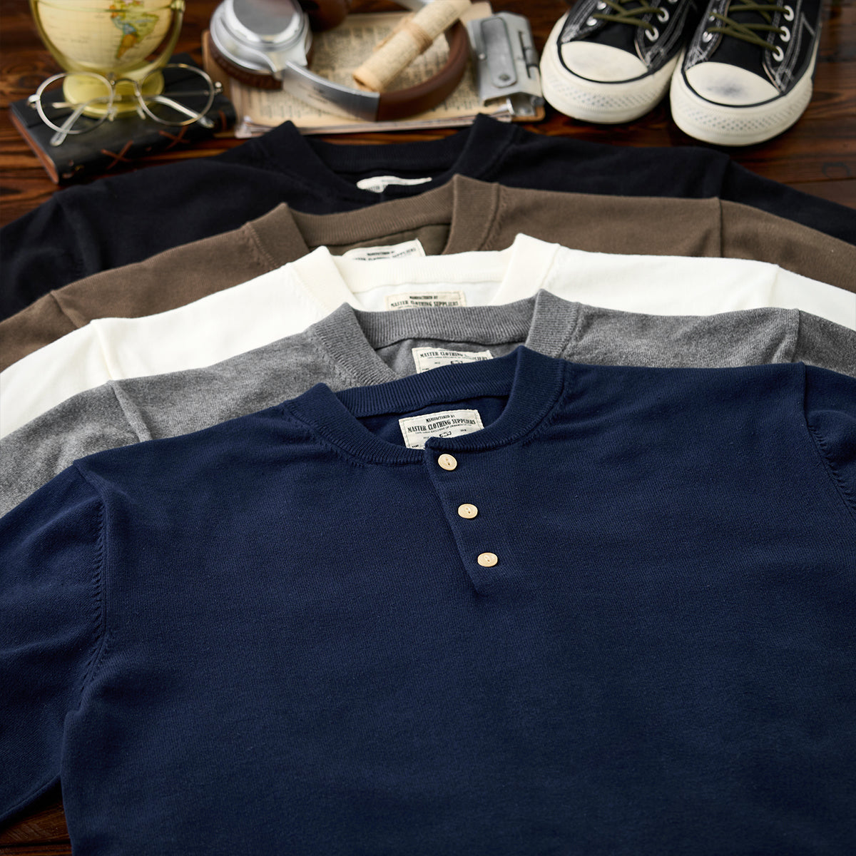 부드럽고 신축성 있는 코튼 니트 소재로 편안하게 착용할 수 있는 헨리넥 티셔츠입니다. 자개단추와 리브 마감으로 고급스럽고 단정한 분위기를 더했습니다.