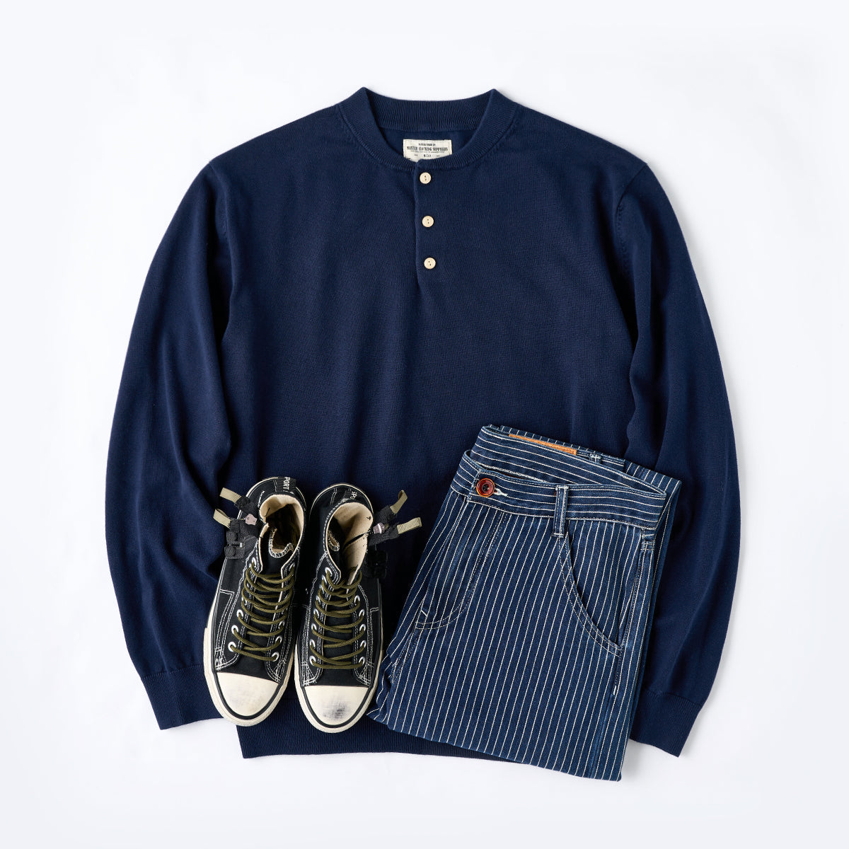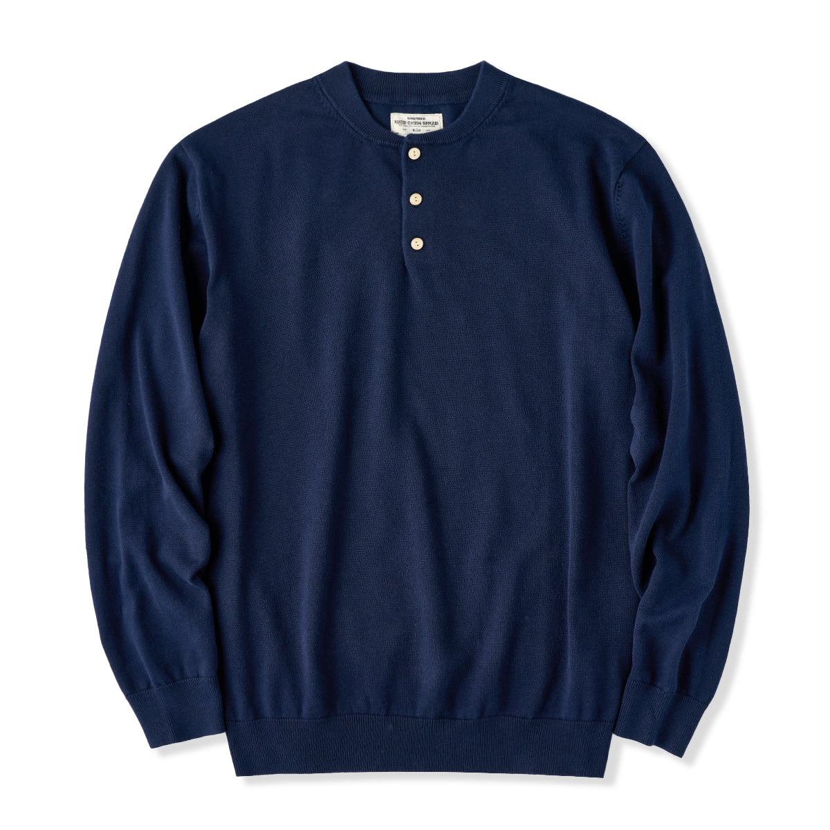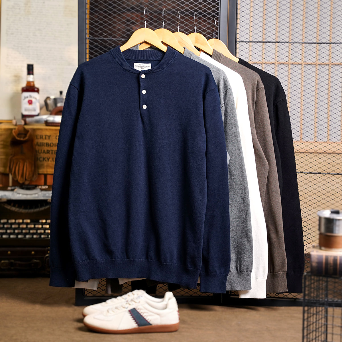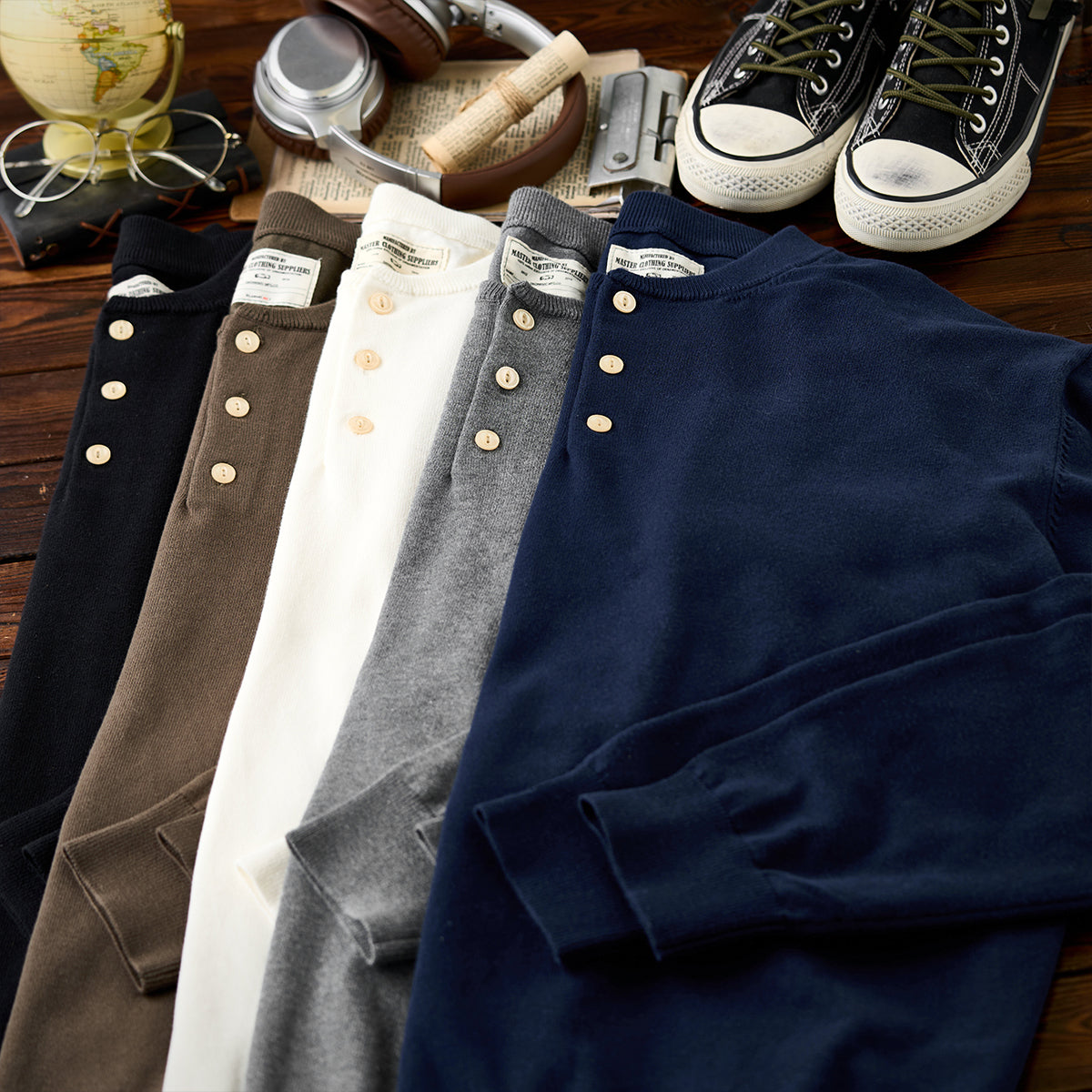 부드럽고 신축성 있는 코튼 니트 소재로 편안하게 착용할 수 있는 헨리넥 티셔츠입니다. 자개단추와 리브 마감으로 고급스럽고 단정한 분위기를 더했습니다.