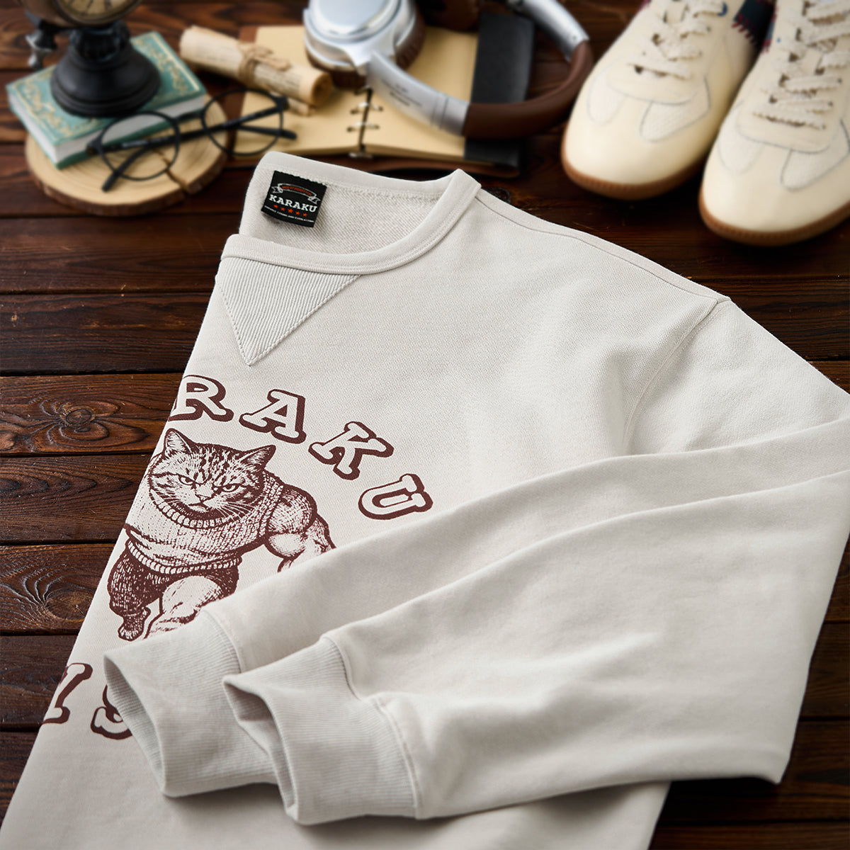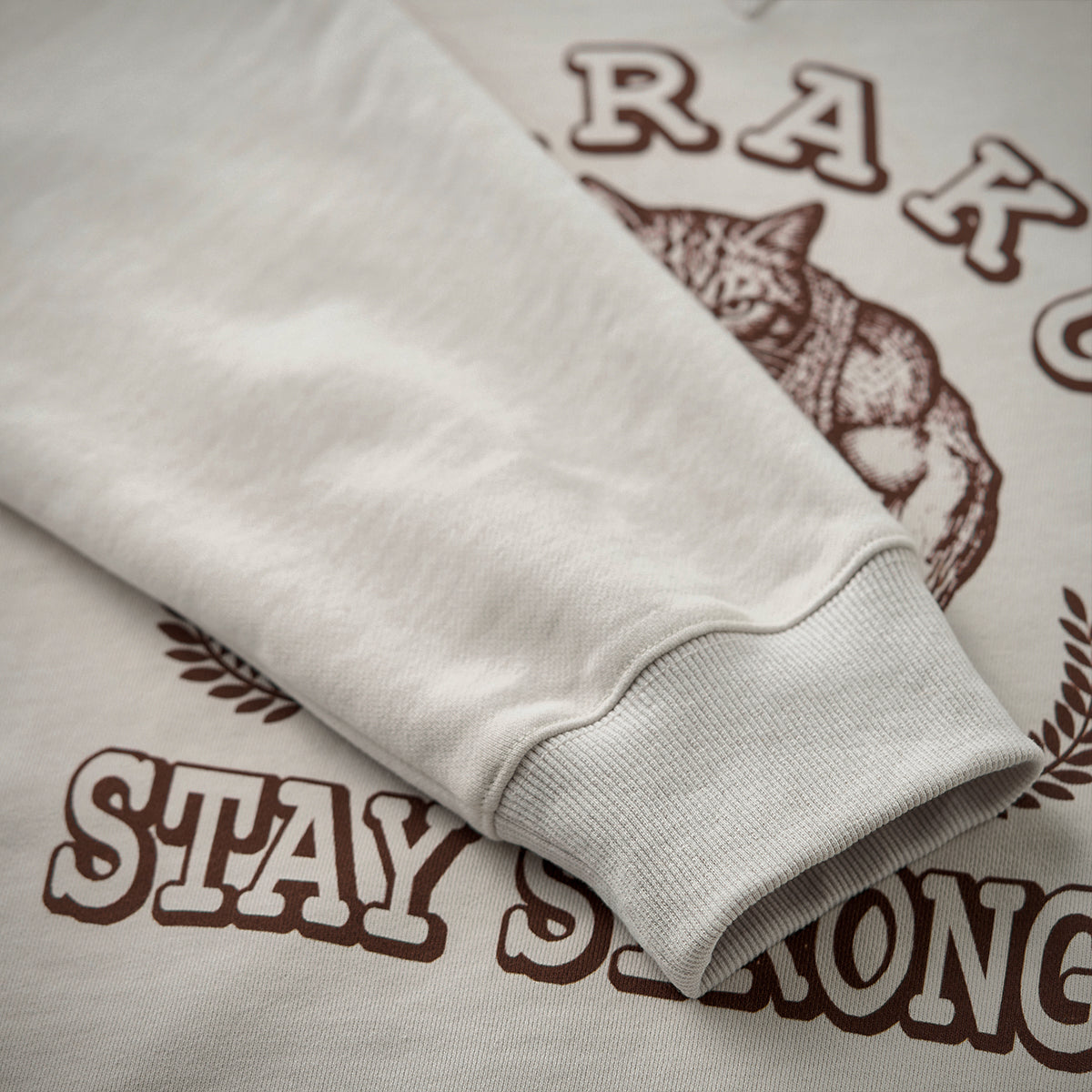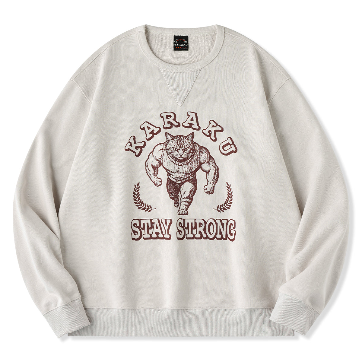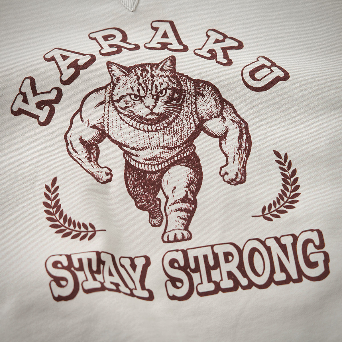 앞면에는 근육질 고양이 캐릭터가 프린트되어 힘과 유머를 동시에 표현하며, “KARAKU”와 “STAY STRONG” 문구는 굵은 빈티지 스타일 글꼴로 디자인되어 클래식하면서도 강렬한 인상을 줍니다.