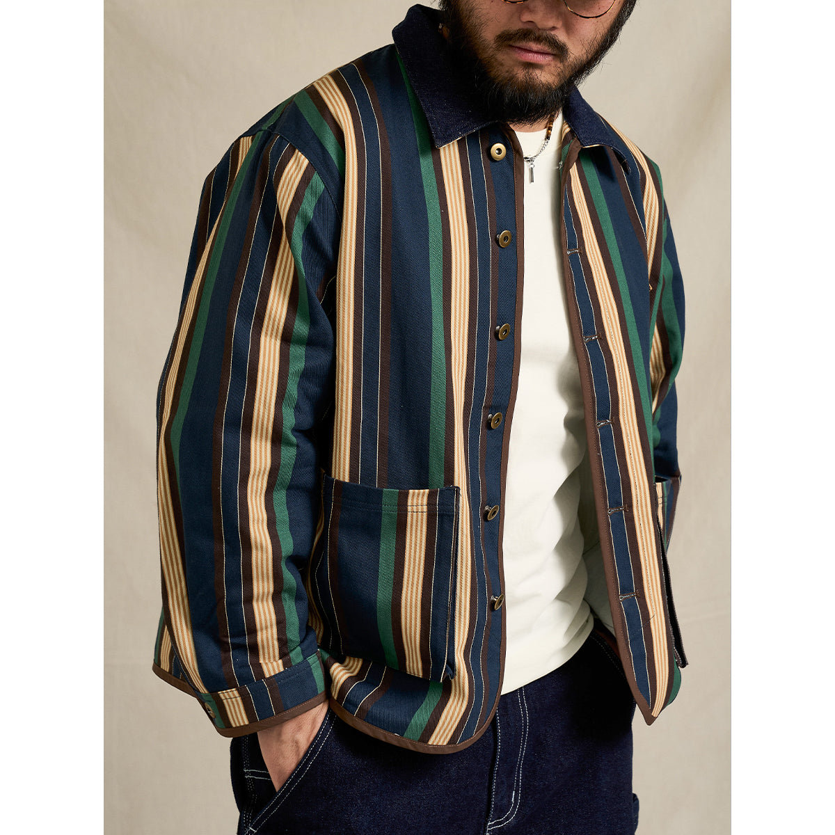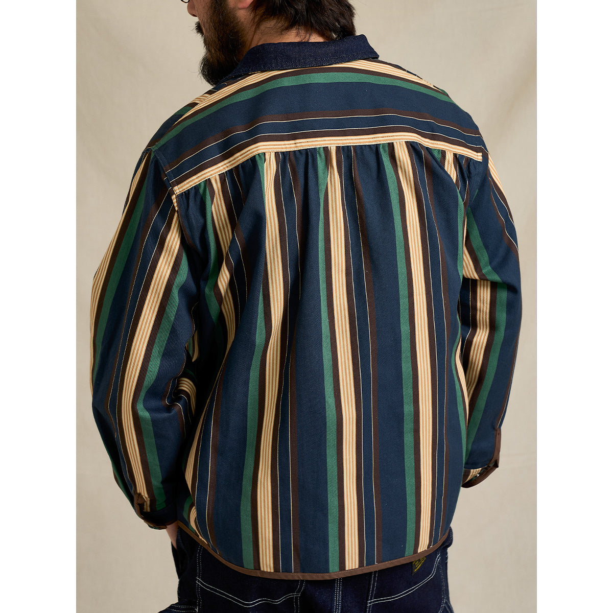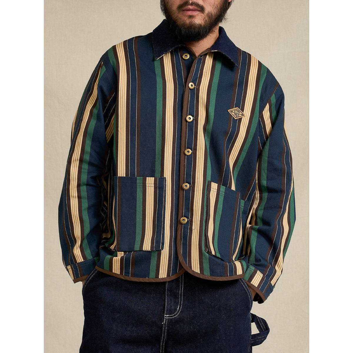 「STAY TRUE」자수 와펜 & 데님 칼라 배색 멀티 스트라이프 자켓