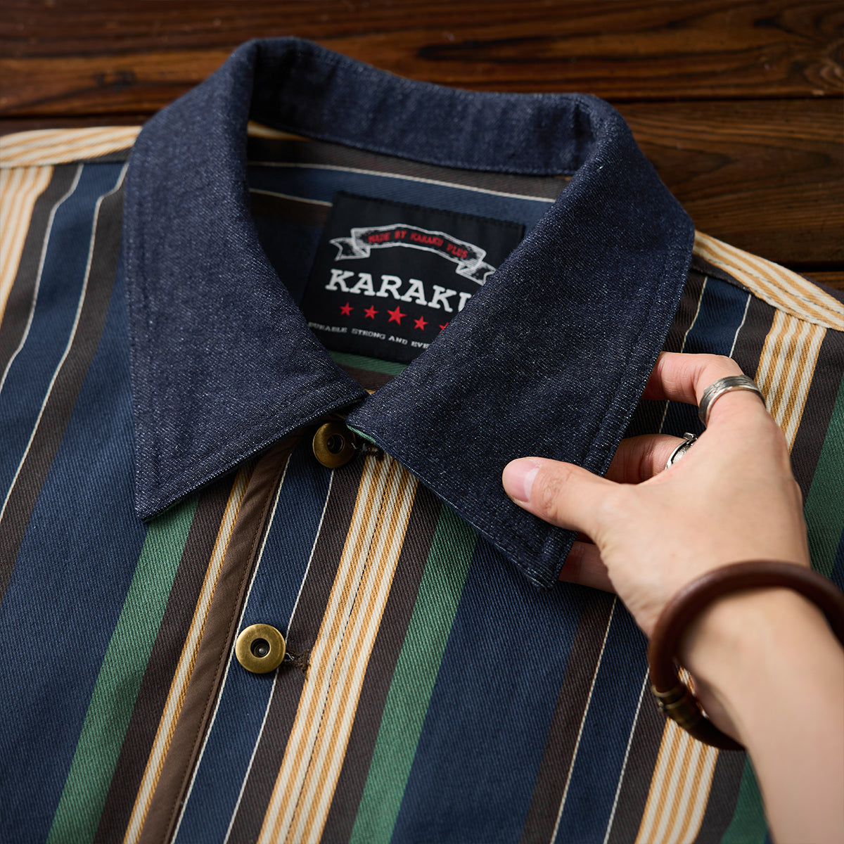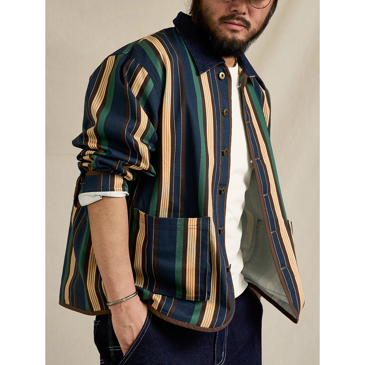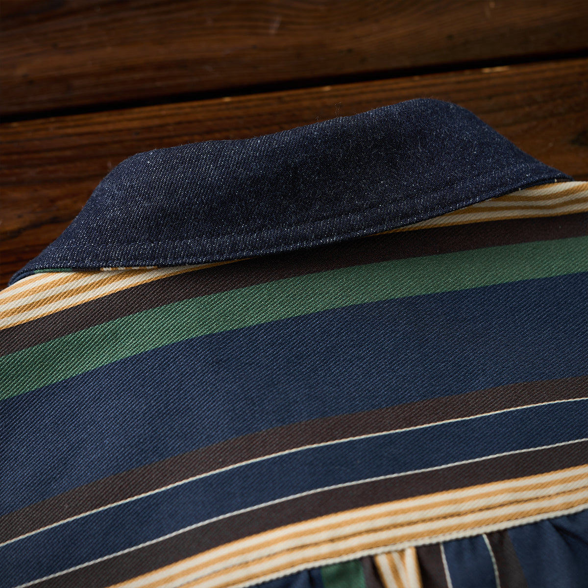 「STAY TRUE」자수 와펜 & 데님 칼라 배색 멀티 스트라이프 자켓