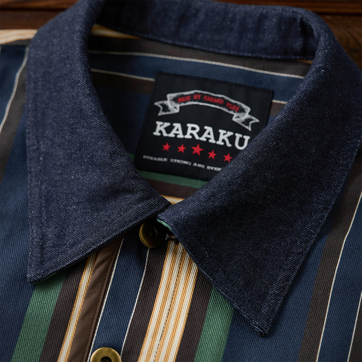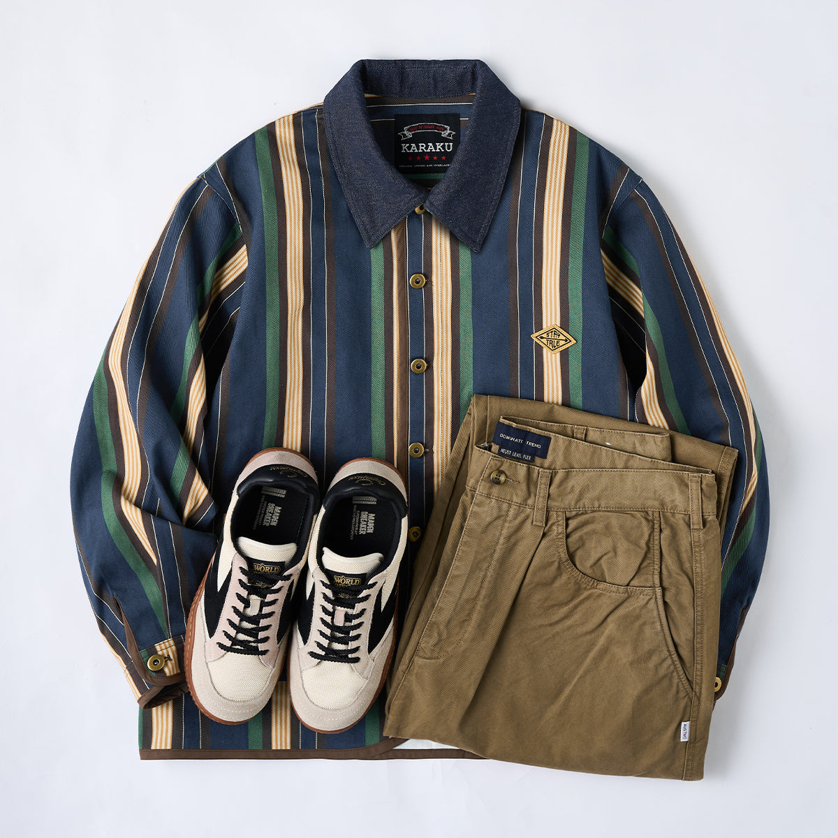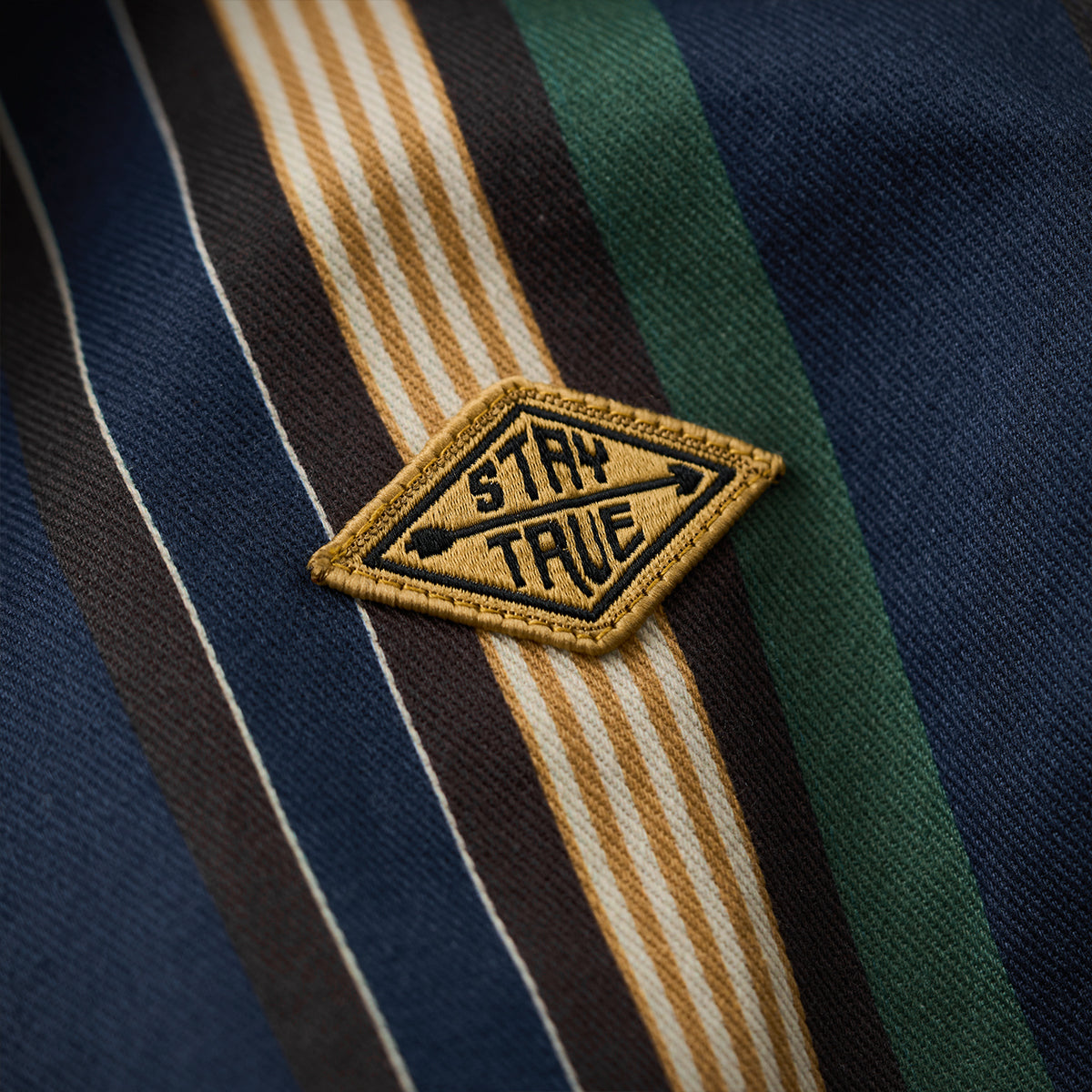 데님 칼라 배색과 멀티 스트라이프 패턴, “STAY TRUE” 자수 와펜이 포인트인 자켓입니다. 다양한 이너와 편하게 매치할 수 있으며 일상과 휴일 스타일 모두에 잘 어울립니다.