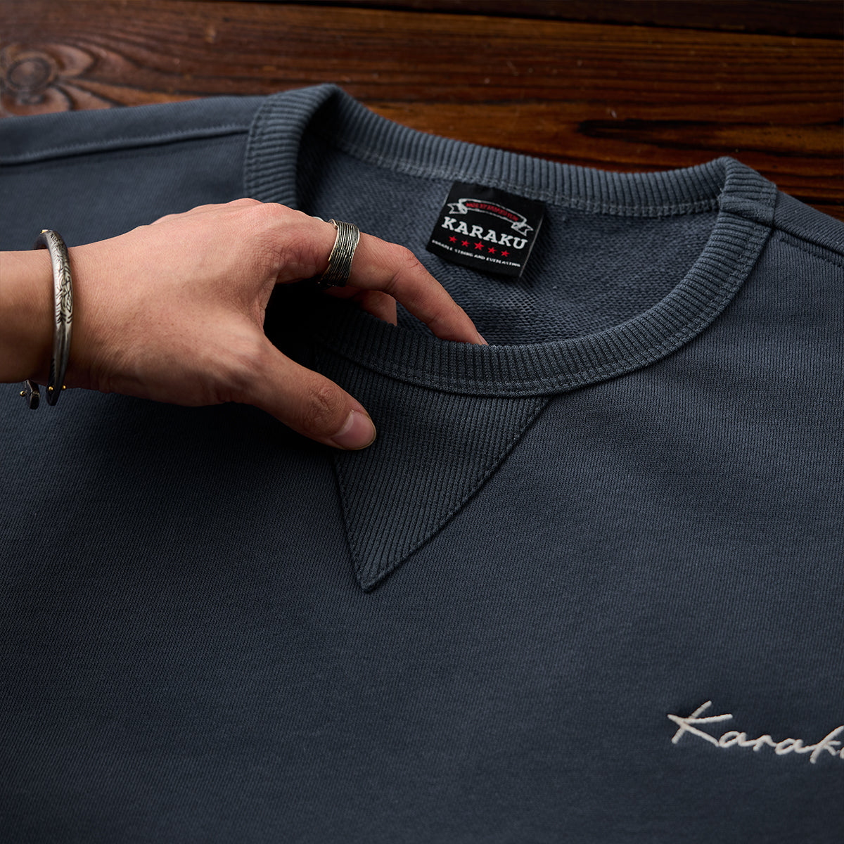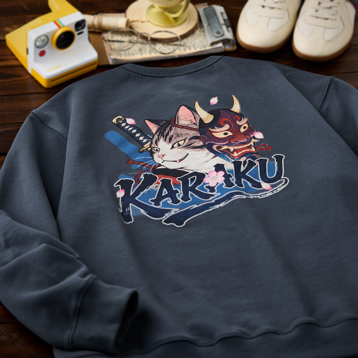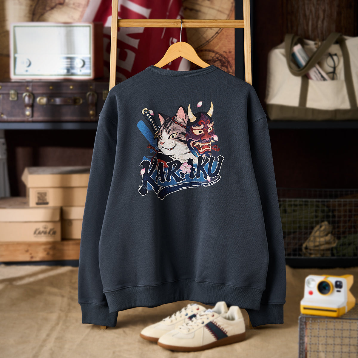 뒷면의 고양이·한냐면·칼 프린트, 벚꽃이 조화를 이루는 스웨트셔츠로, 손그림 느낌의 아트 스타일과 ‘KARAKU’ 로고가 레트로한 분위기를 완성합니다.