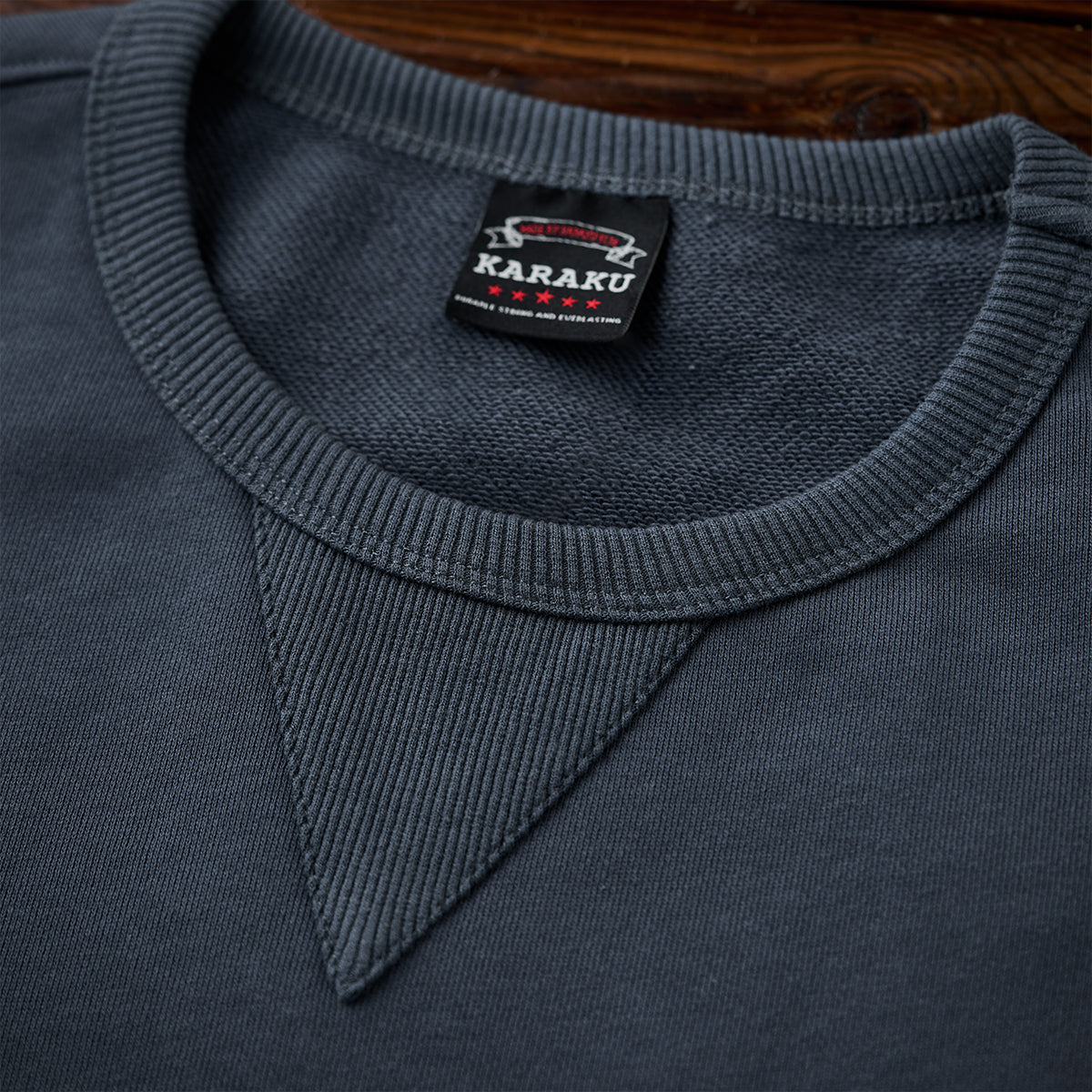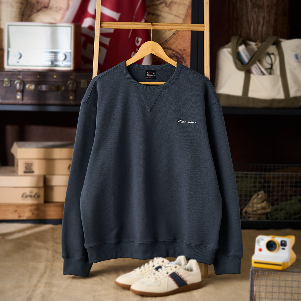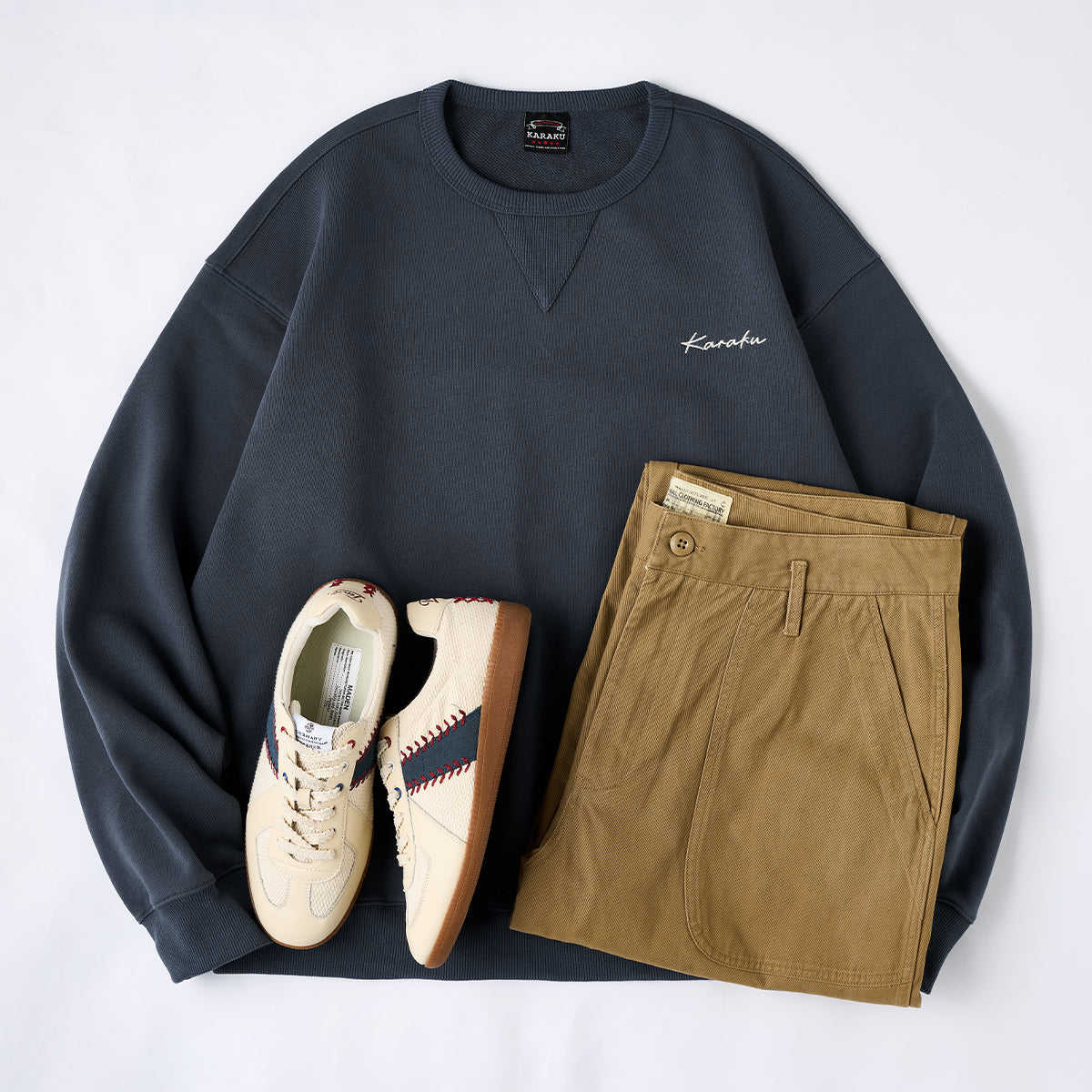 뒷면의 고양이·한냐면·칼 프린트, 벚꽃이 조화를 이루는 스웨트셔츠로, 손그림 느낌의 아트 스타일과 ‘KARAKU’ 로고가 레트로한 분위기를 완성합니다.