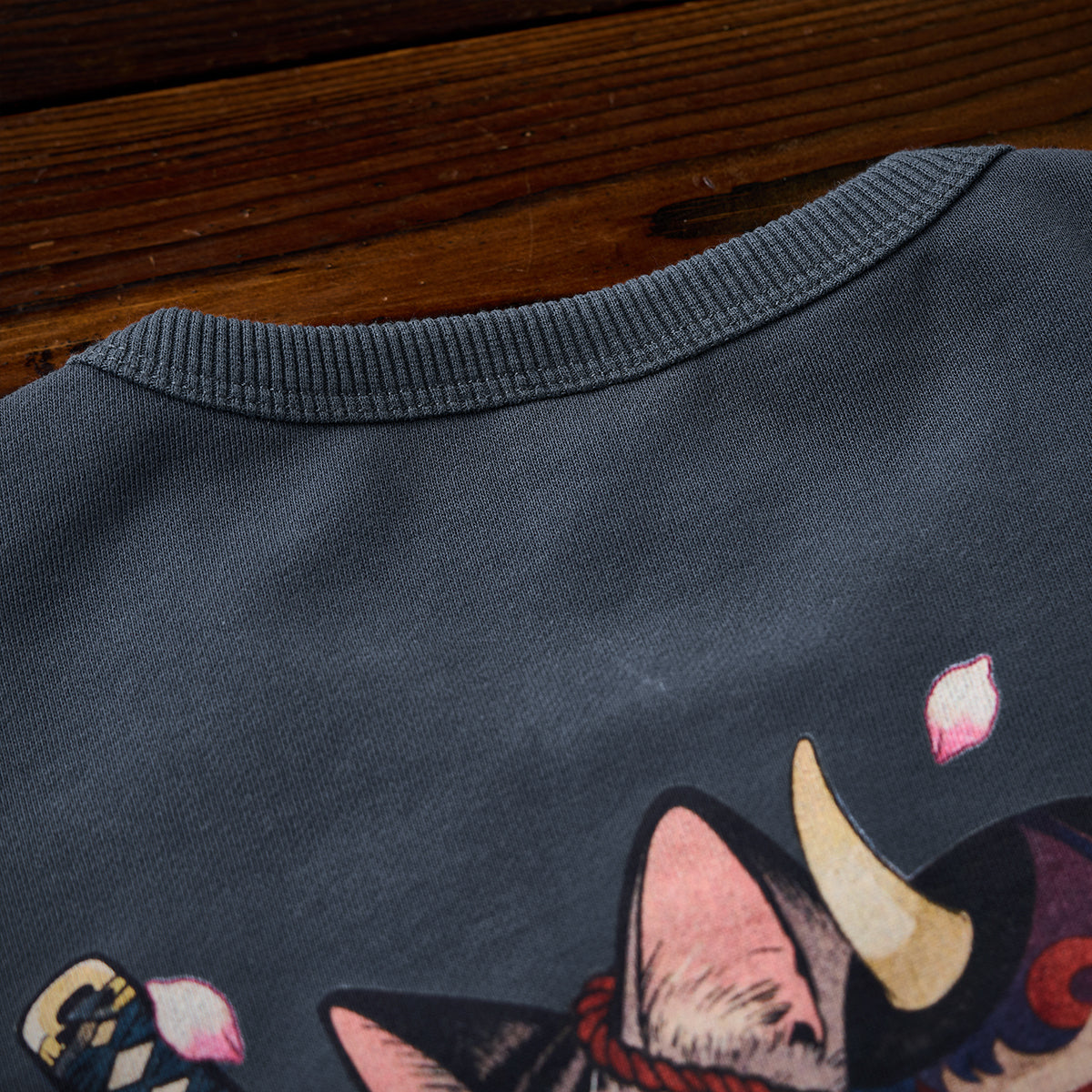 【사전예약】「KaraKu」자수&「반야 가면・무사 고양이」프린트 V 거셋 기모 스웨트셔츠