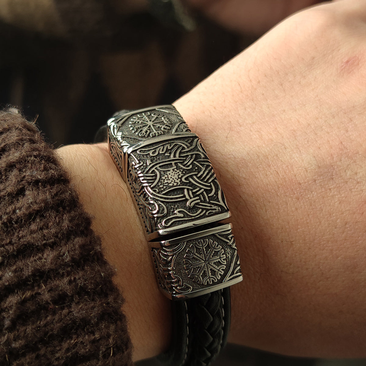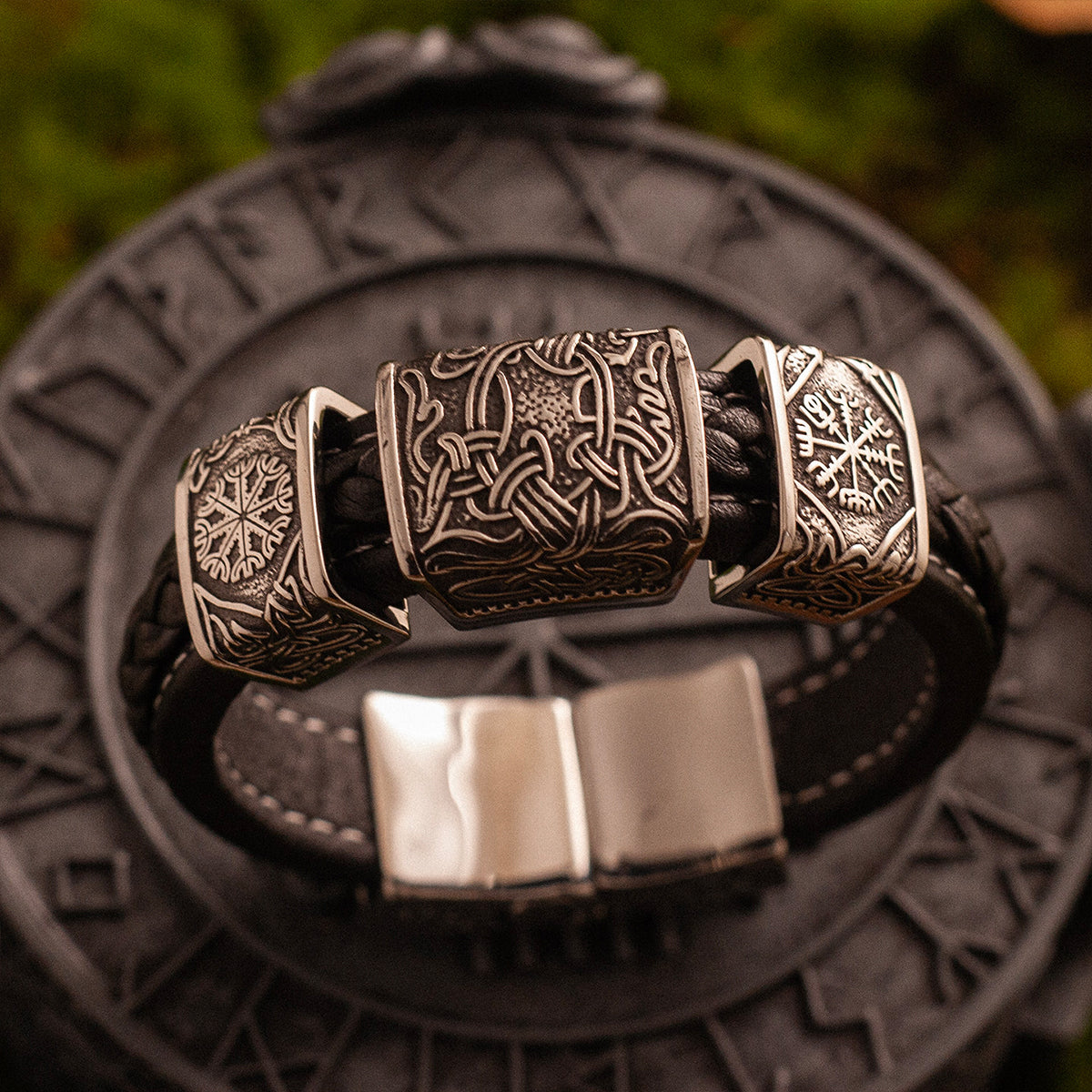 묵직한 존재감이 느껴지는 바이킹 스타일 가죽 팔찌로, 북유럽 신화에서 영감을 받은 메탈 버클이 포인트입니다. 투박하면서도 신비로운 분위기를 동시에 갖춘 아이템입니다.