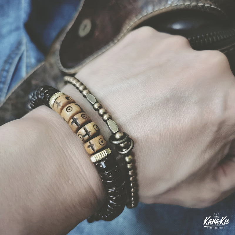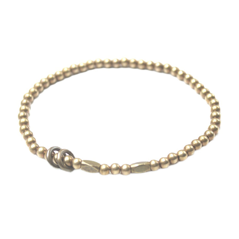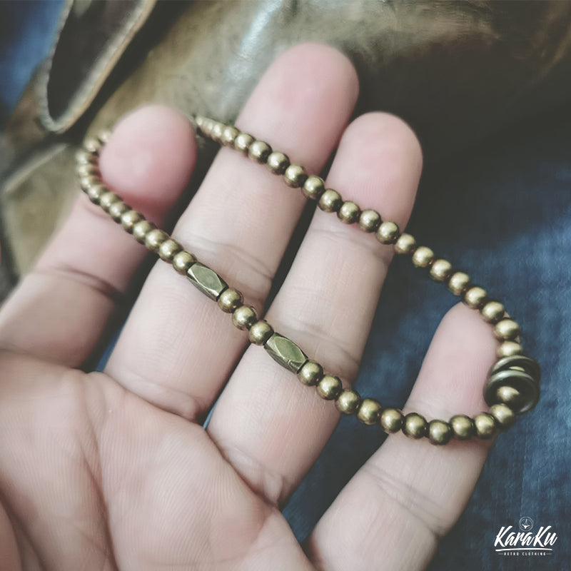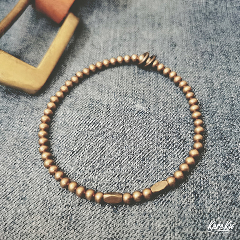 Brass is an alloy made of copper mixed with tin, zinc, nickel, etc., and in the past it was also called yuseok (鍮石), yucheol (鍮鐵), and jinyu (眞鍮). This product is a new-feeling bracelet woven with brass beads, brass polygonal beads, and brass rings. The antique atmosphere unique to brass gives it a rich and luxurious feel. The design can be used by both men and women. Brass changes over time, so you can enjoy the changes in the material.