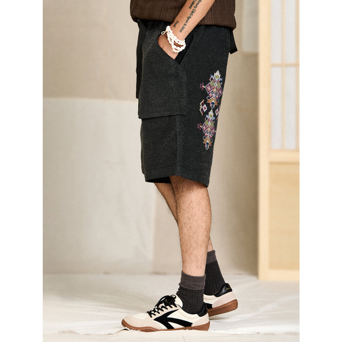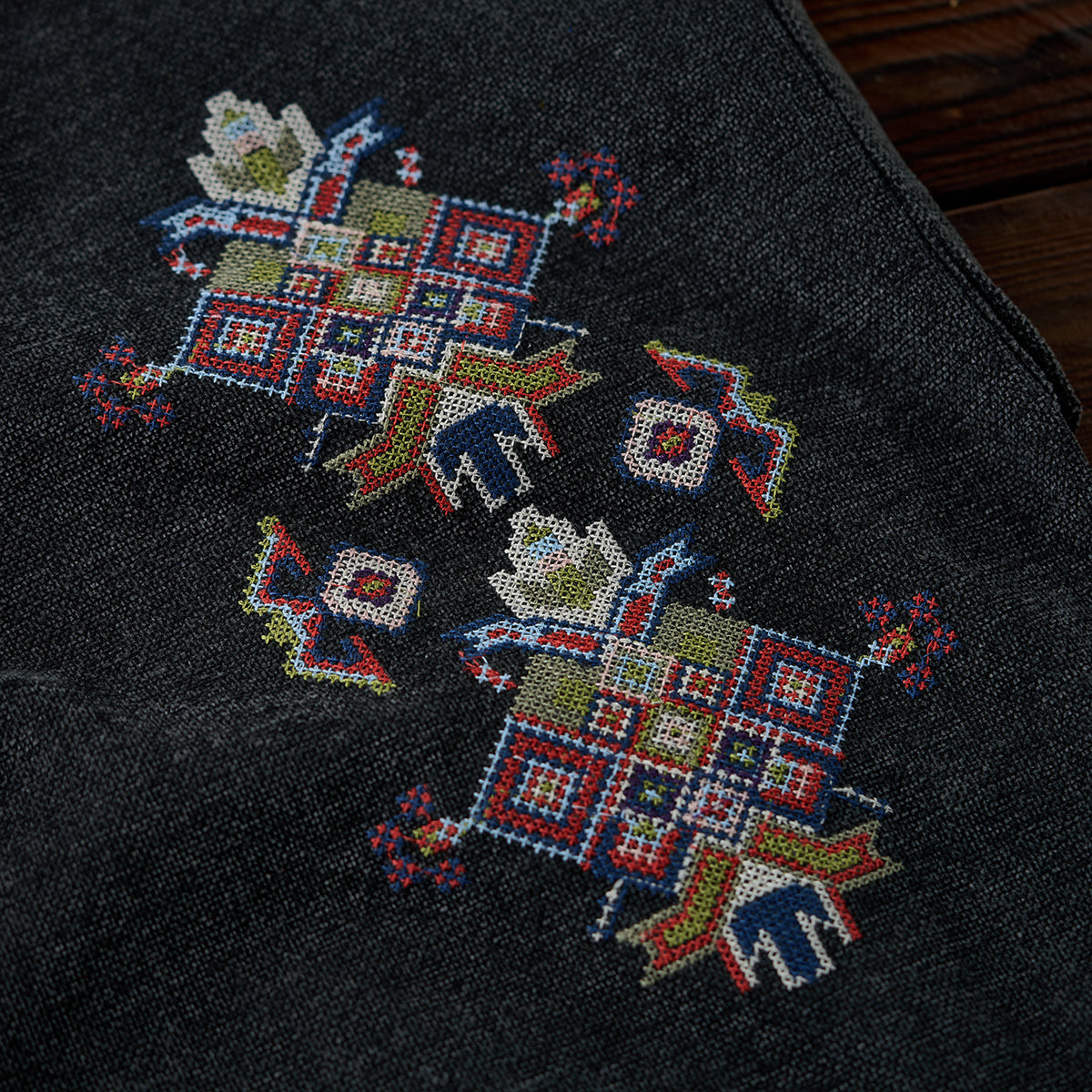 에스닉풍 자수와 입체 포켓은 기하학적인 무늬와 컬러풀한 디자인으로 시각적인 포인트를 주며, 좌우 대칭으로 균형감과 디자인성을 갖추고 있습니다.