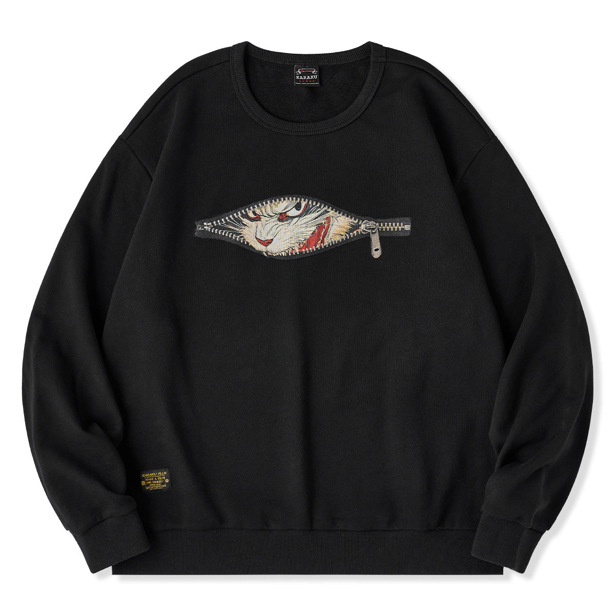 지퍼 틈새에서 바케네코가 얼굴을 내미는 그래픽 스웨트셔츠로, 섬세한 디테일과 편안한 실루엣이 특징입니다. 캐주얼 룩에 위트 있는 포인트를 더해 줍니다.