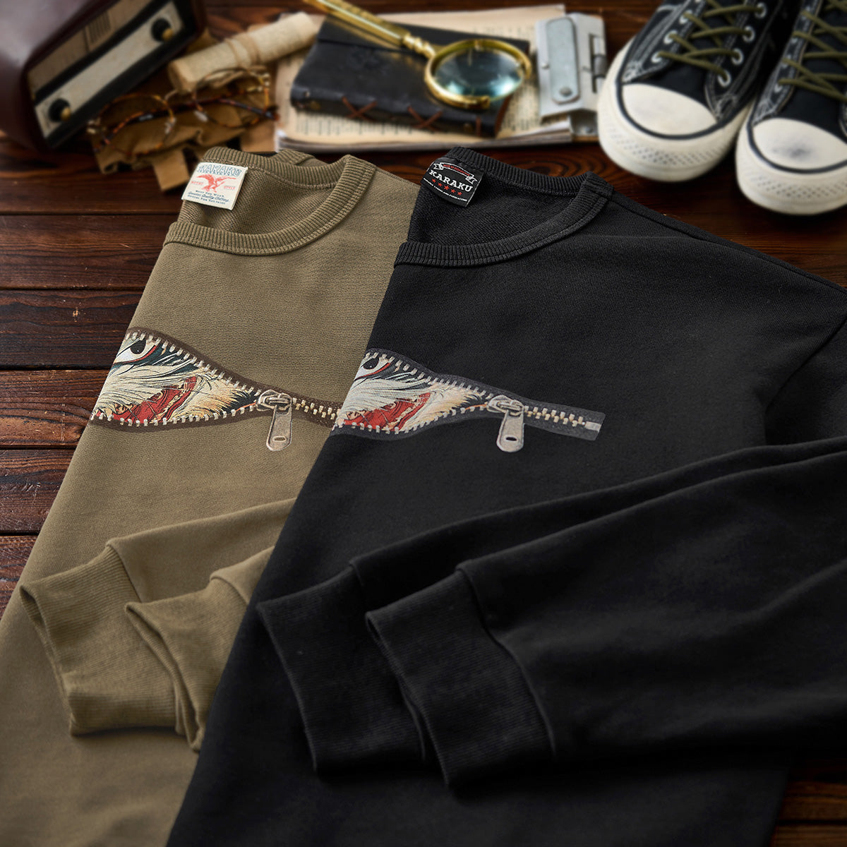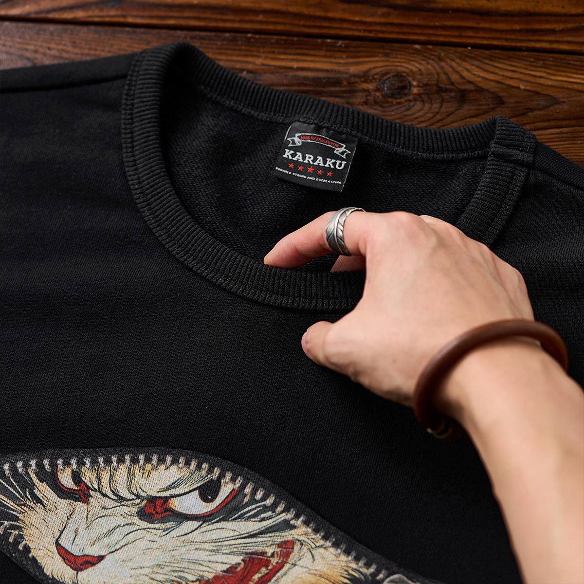【사전예약】「크로스 지퍼 틈새의 바케네코」우키요에 스타일 프린트 스웨트셔츠
