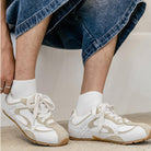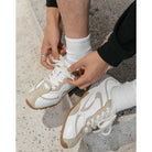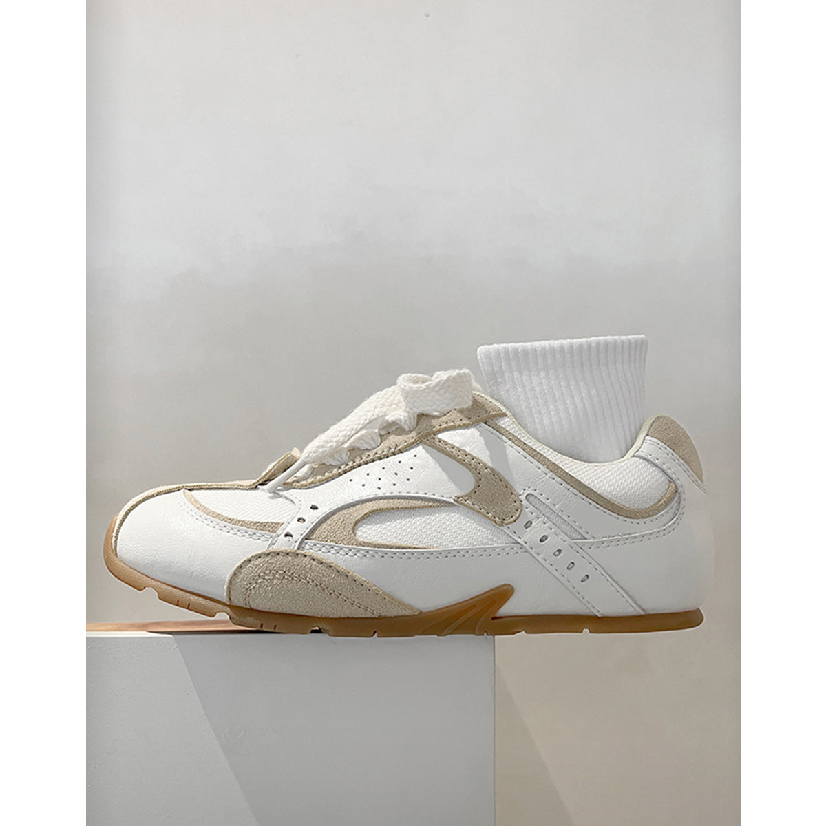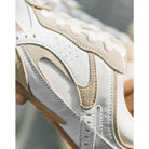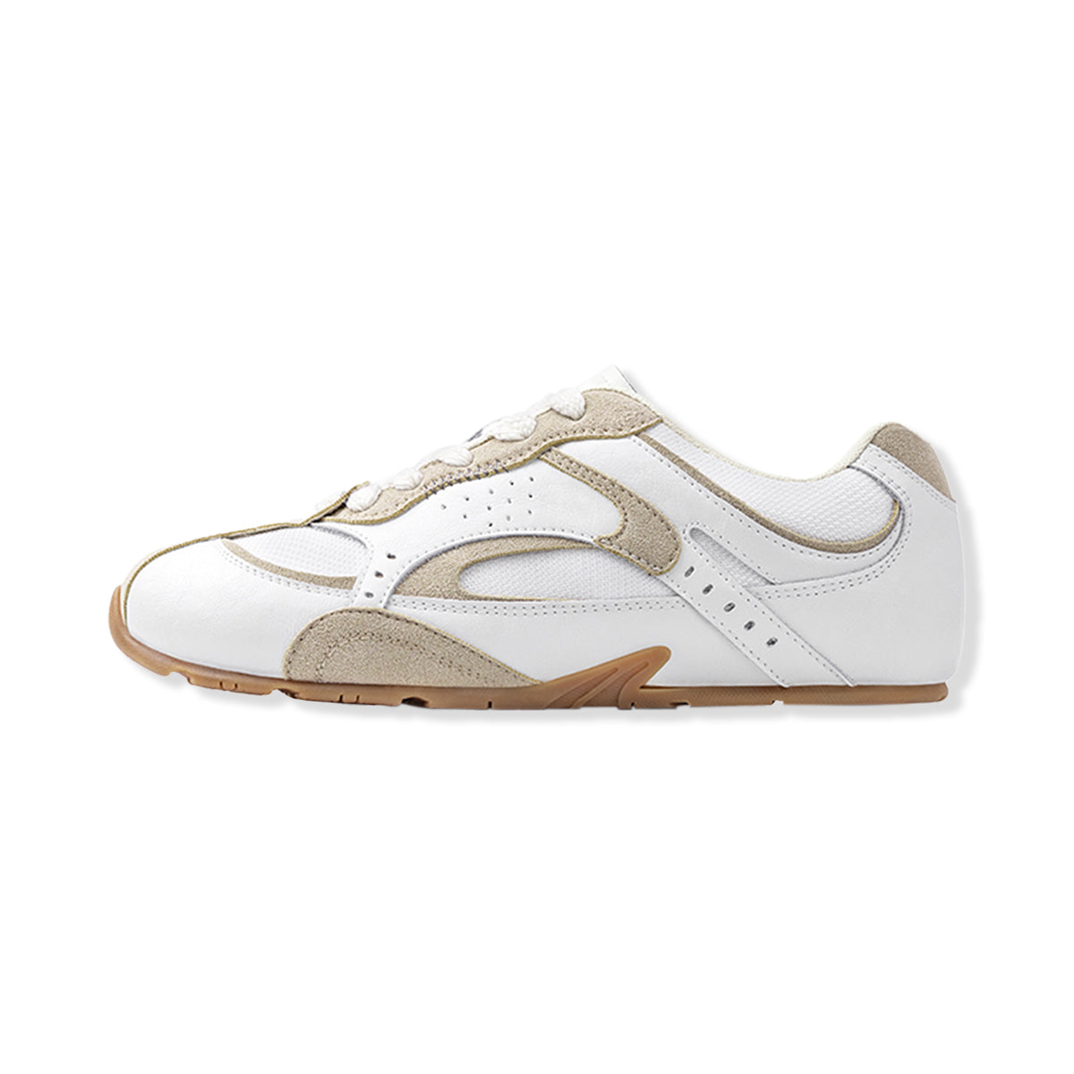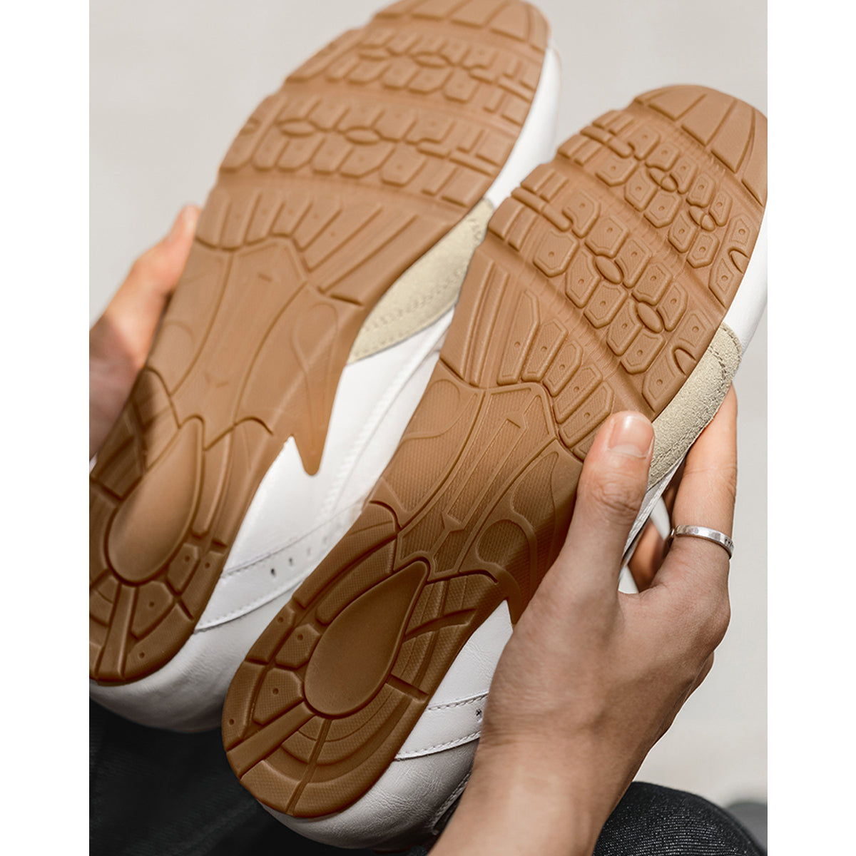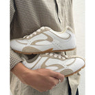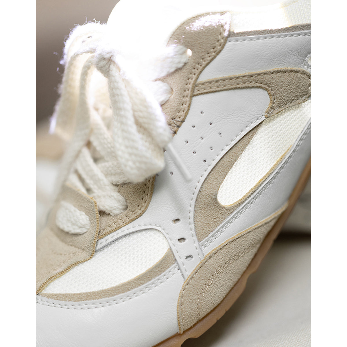 가죽, 베이지 스웨이드, 메쉬를 조합하여 고급스러움과 통기성을 제공합니다.