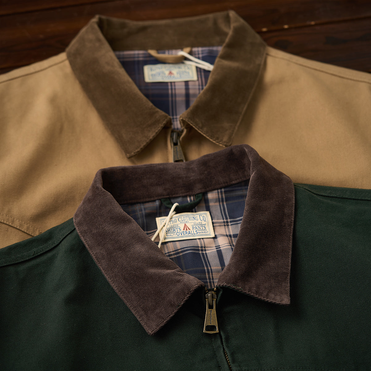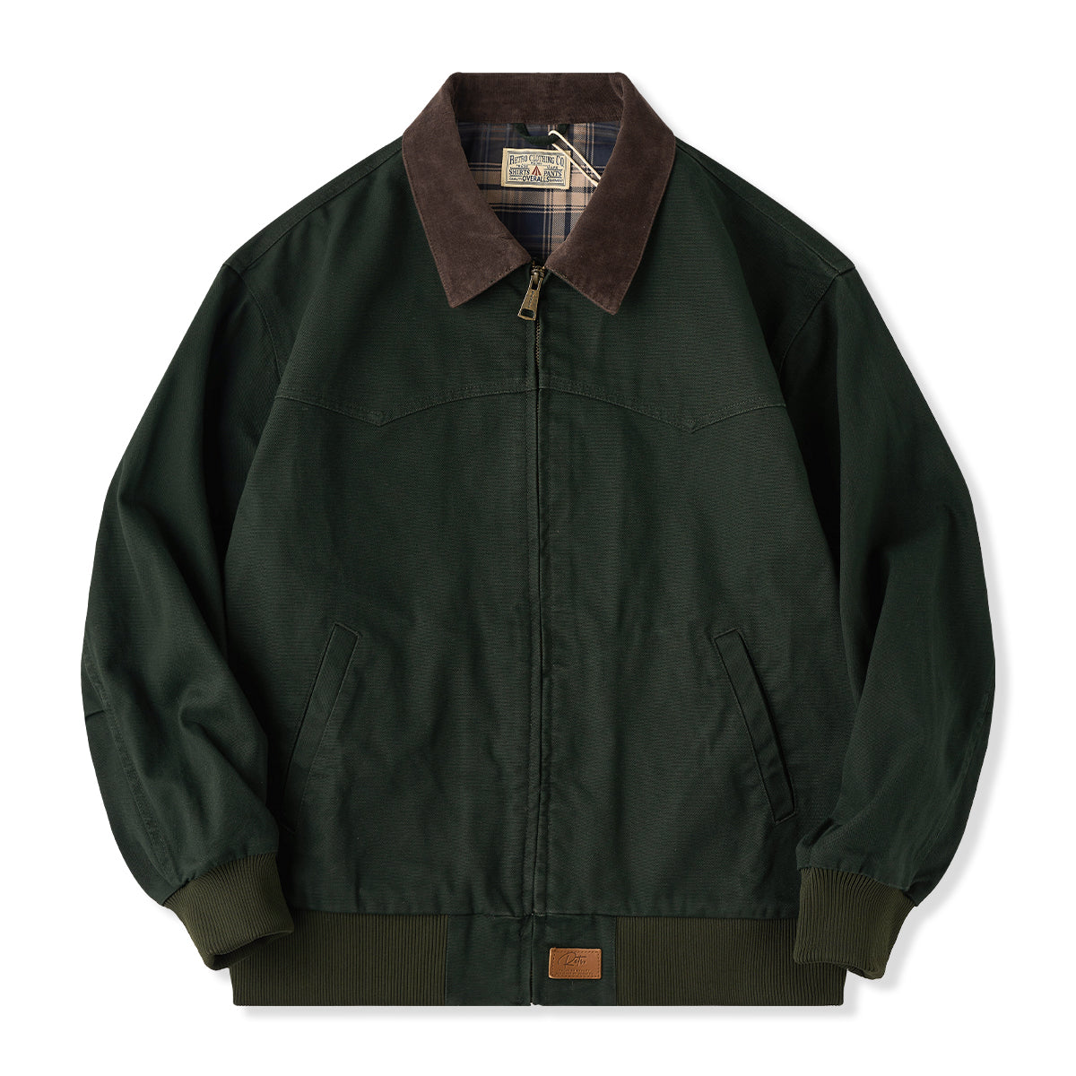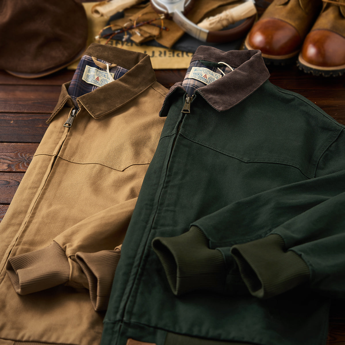 This is a retro Santa Fe jacket. Made of durable cotton canvas with a corduroy collar and ribbed sleeves, it emphasizes warmth and a vintage feel.