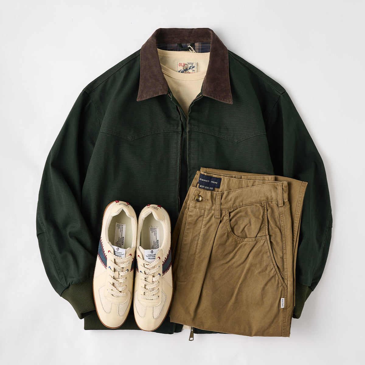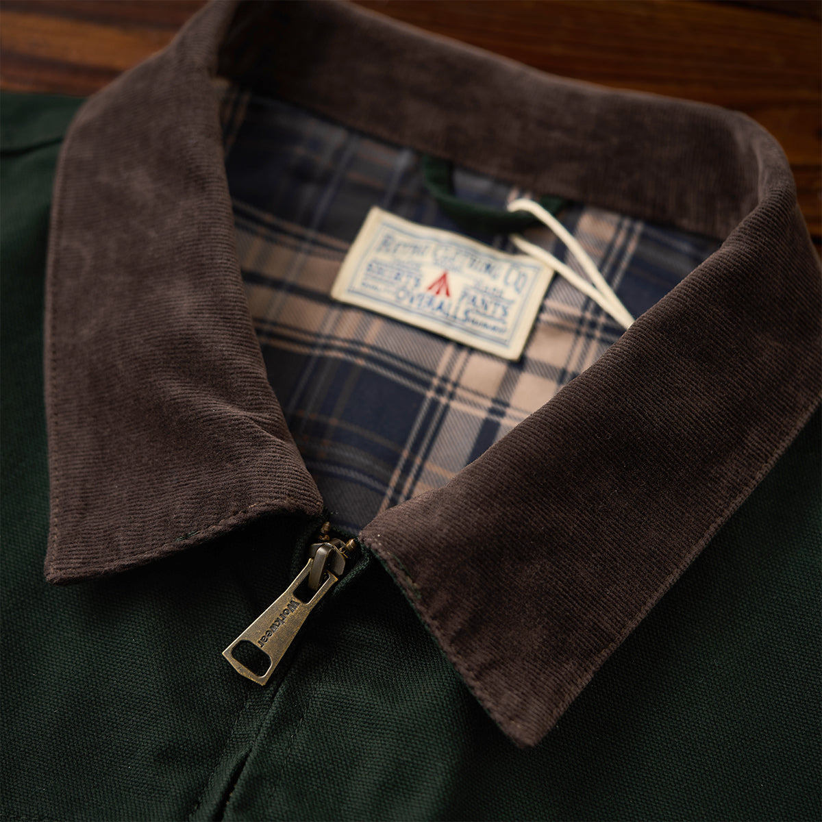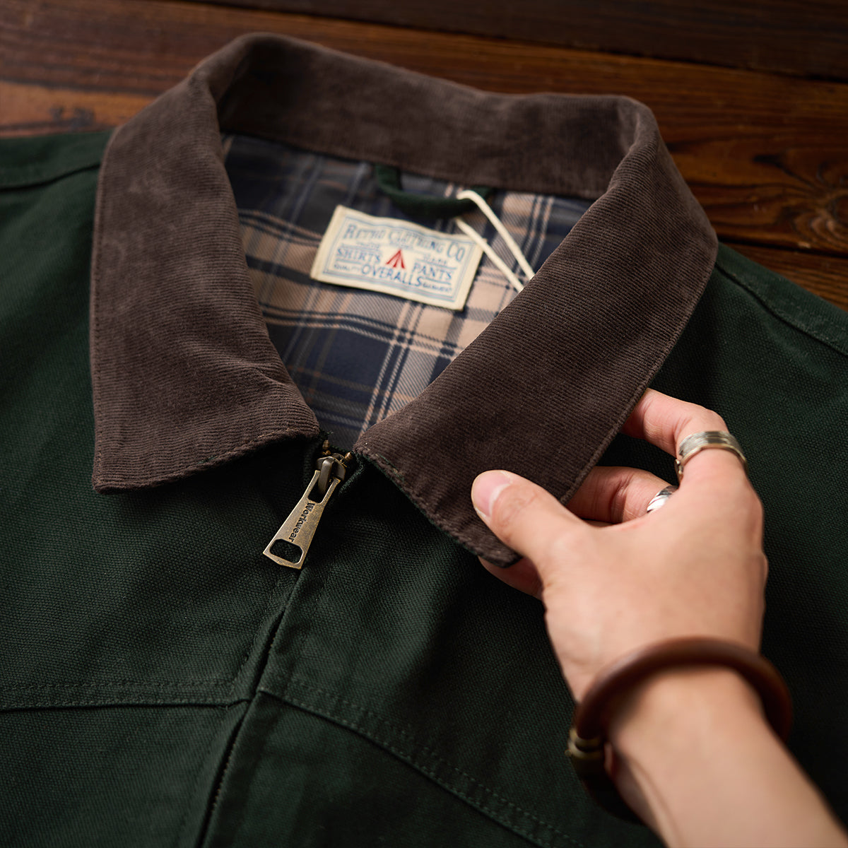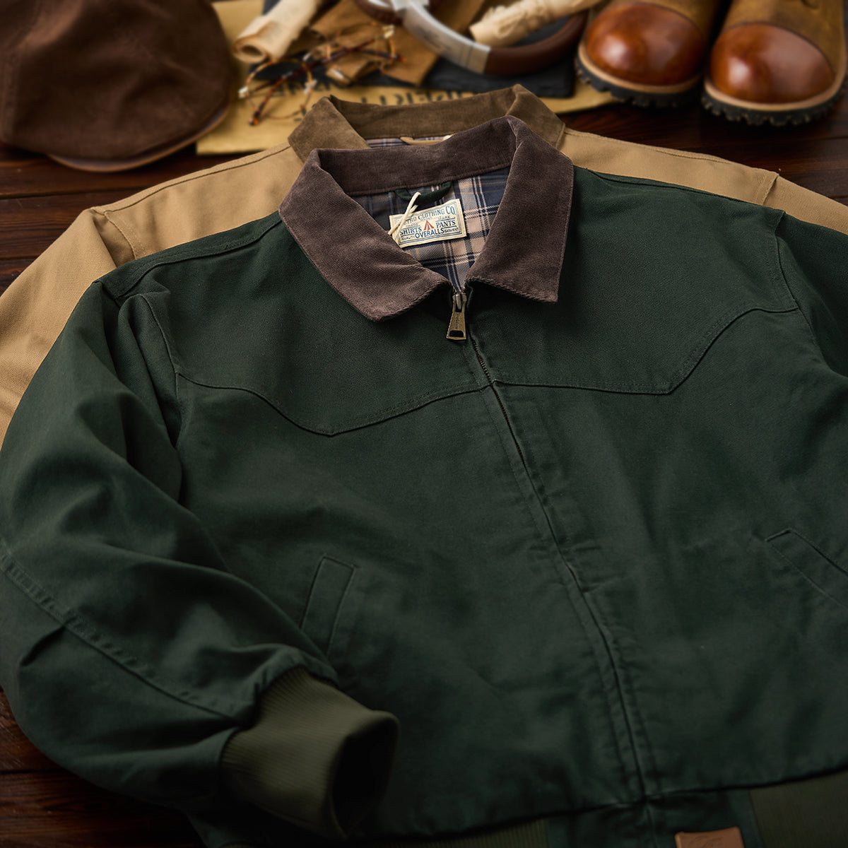 This is a retro Santa Fe jacket. Made of durable cotton canvas with a corduroy collar and ribbed sleeves, it emphasizes warmth and a vintage feel.