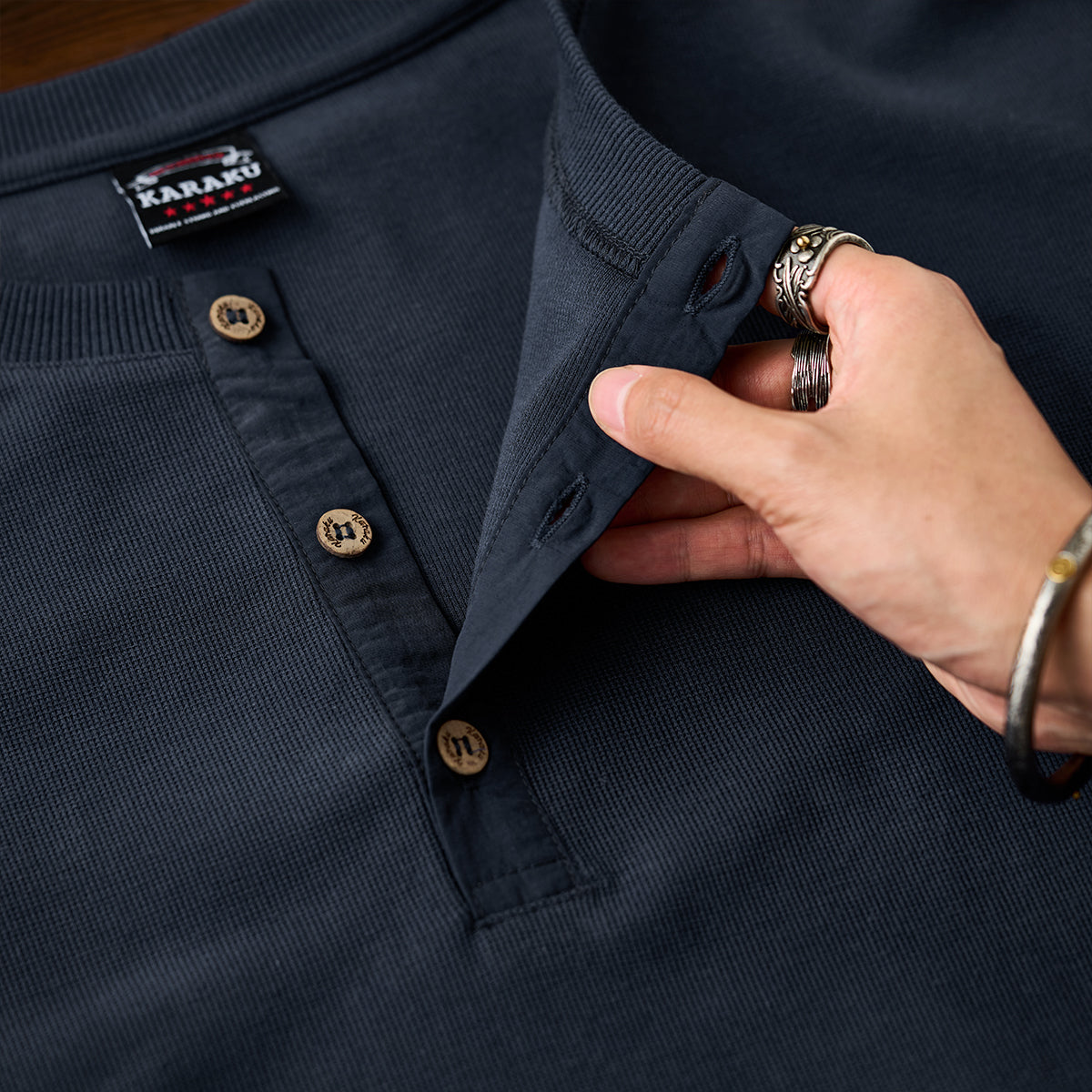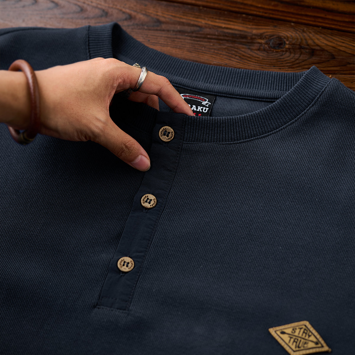 A relaxed fit shirt with a vintage wash finish and paisley jacquard collar that adds a touch of style to the classic work style.