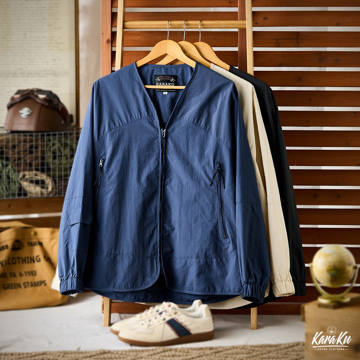 The collar of a typical jacket has been removed and a V-neck design has been created to emphasize lightness and mobility. The clean open neckline makes this product a great match with accessories or collared shirts.
