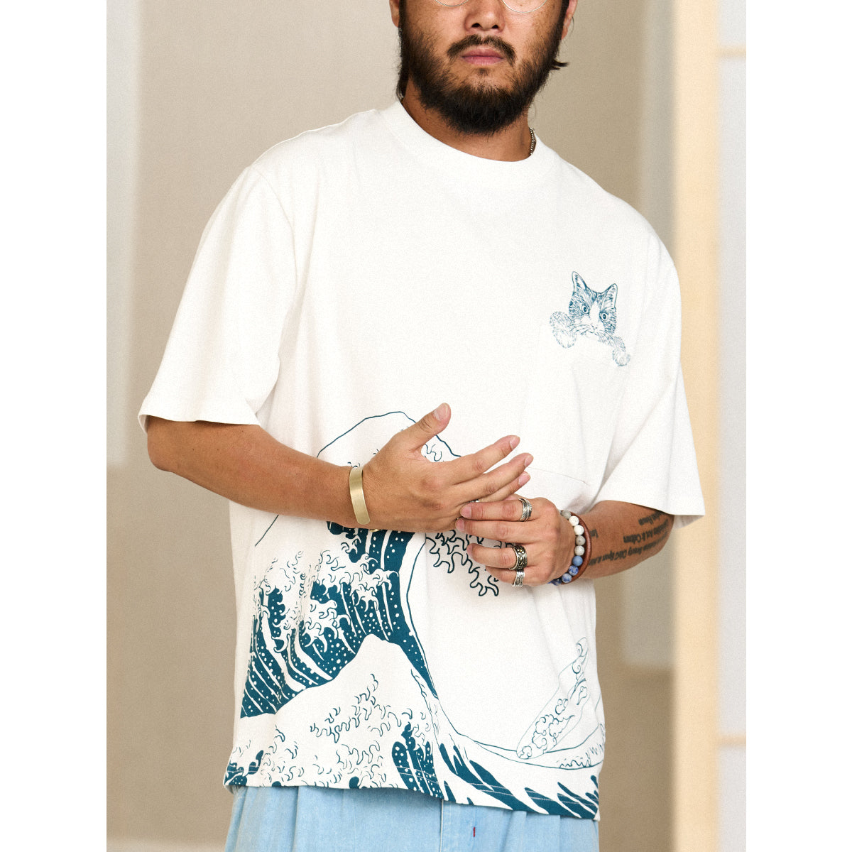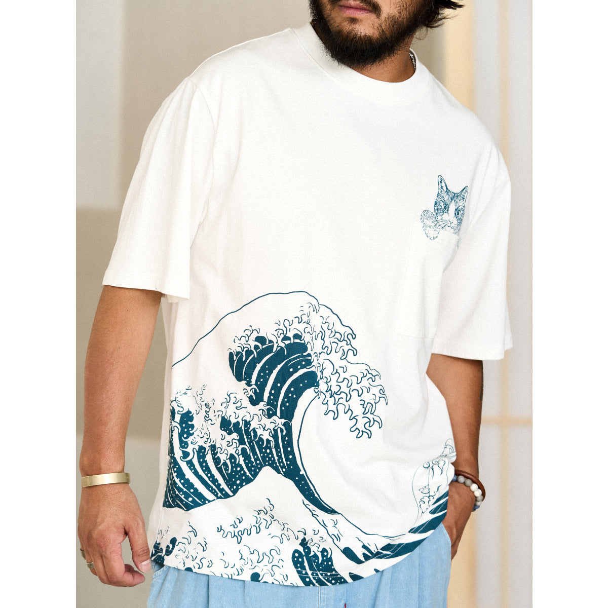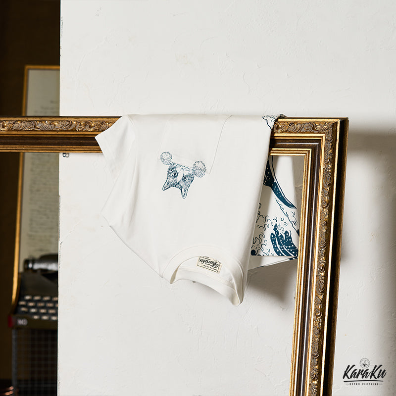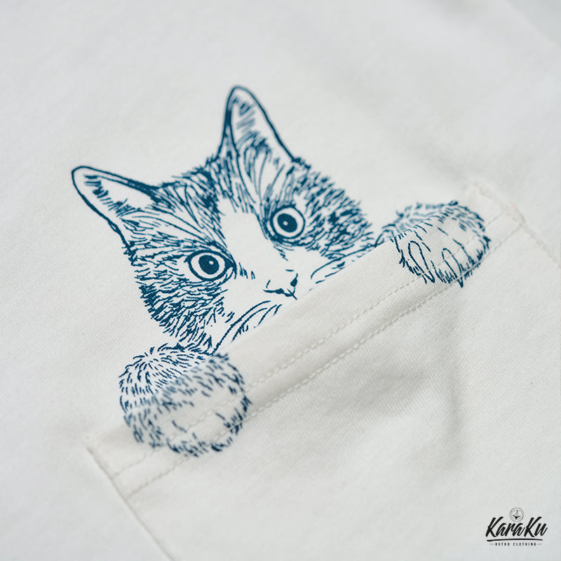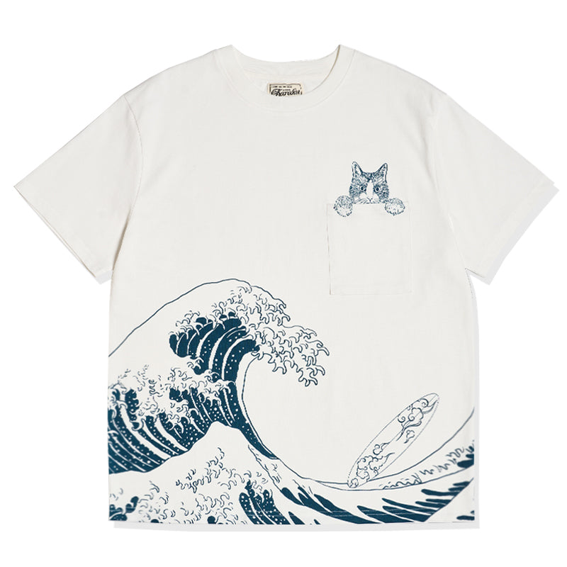 On the left chest, a cute cat peeking out from above the pocket is drawn, adding to its presence. The lower part of the T-shirt features an image of "Kanagawa Okinawa", depicting a rough seascape with waves and Mt. Fuji floating in the waves, expressing strength and beauty. The ribbed knit finish on the neck and sleeves enhances durability and comfort.