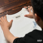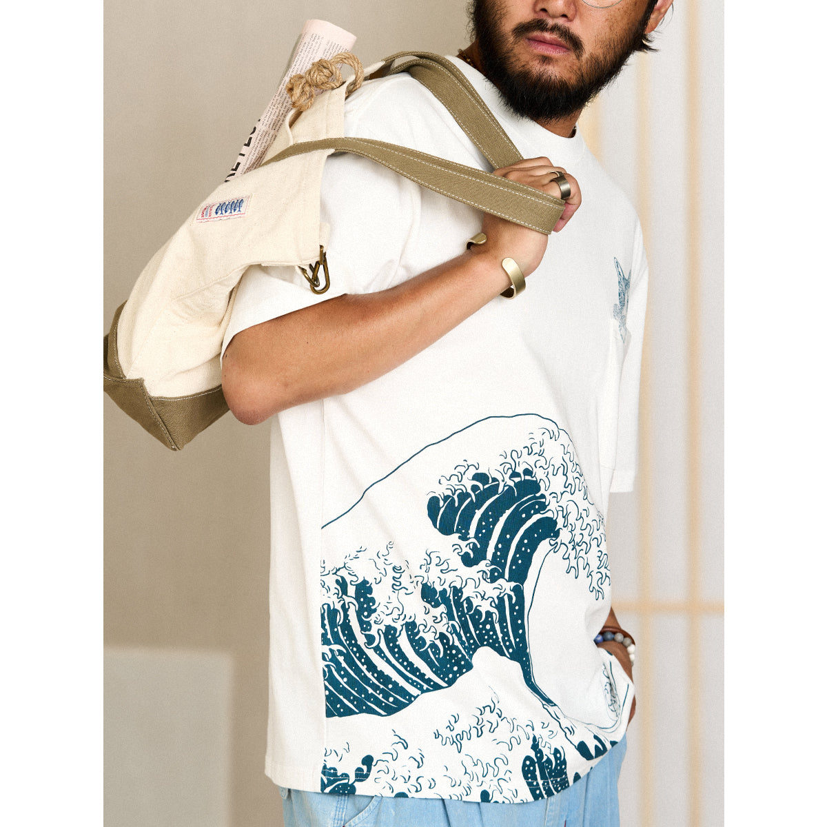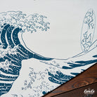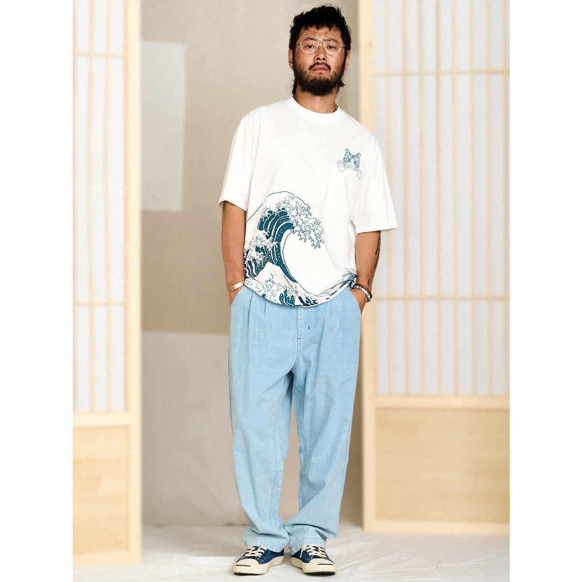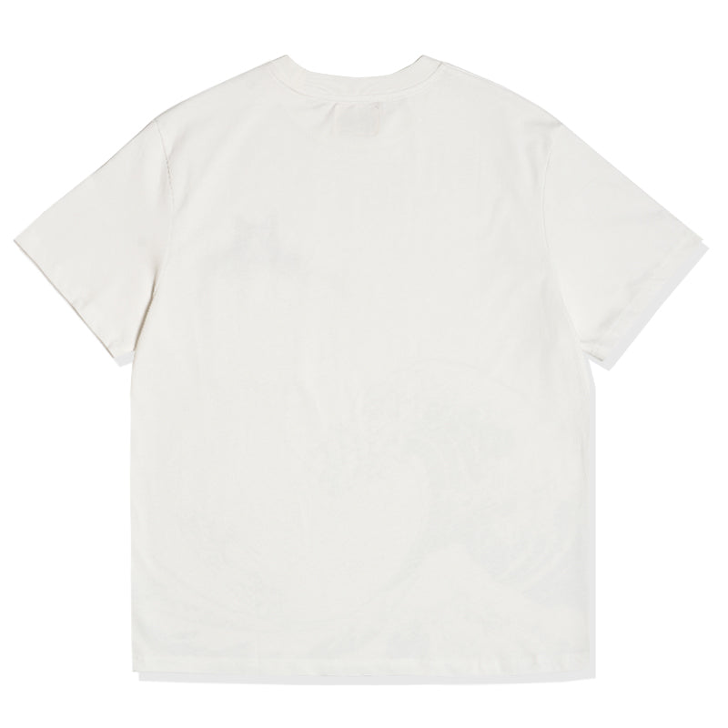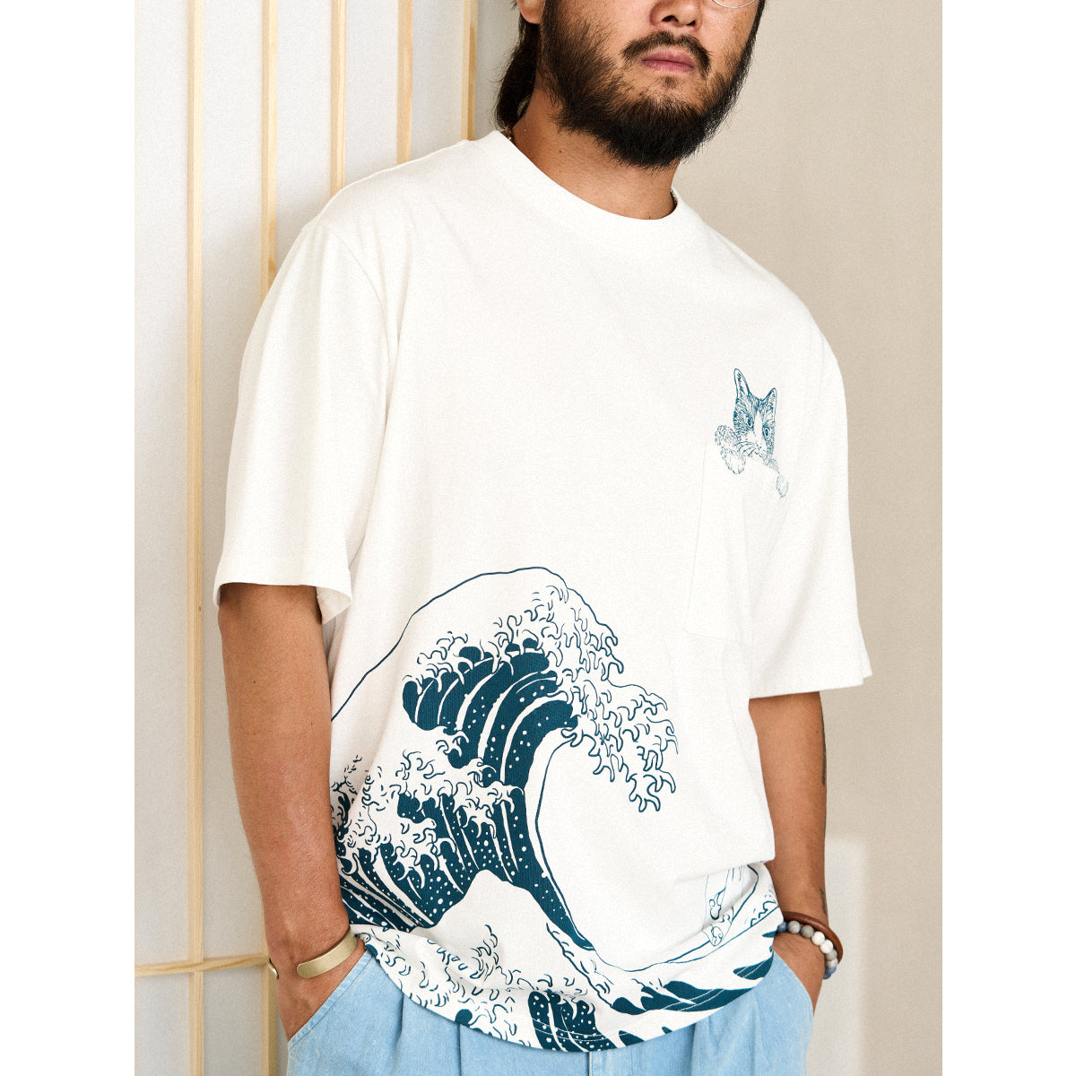 On the left chest, a cute cat peeking out from above the pocket is drawn, adding to its presence. The lower part of the T-shirt features an image of "Kanagawa Okinawa", depicting a rough seascape with waves and Mt. Fuji floating in the waves, expressing strength and beauty. The ribbed knit finish on the neck and sleeves enhances durability and comfort.