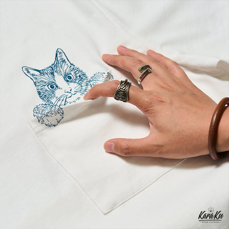 「KaraKux365CAT.ART」Cat looking out of pocket Ukiyo-e Cotton Tee