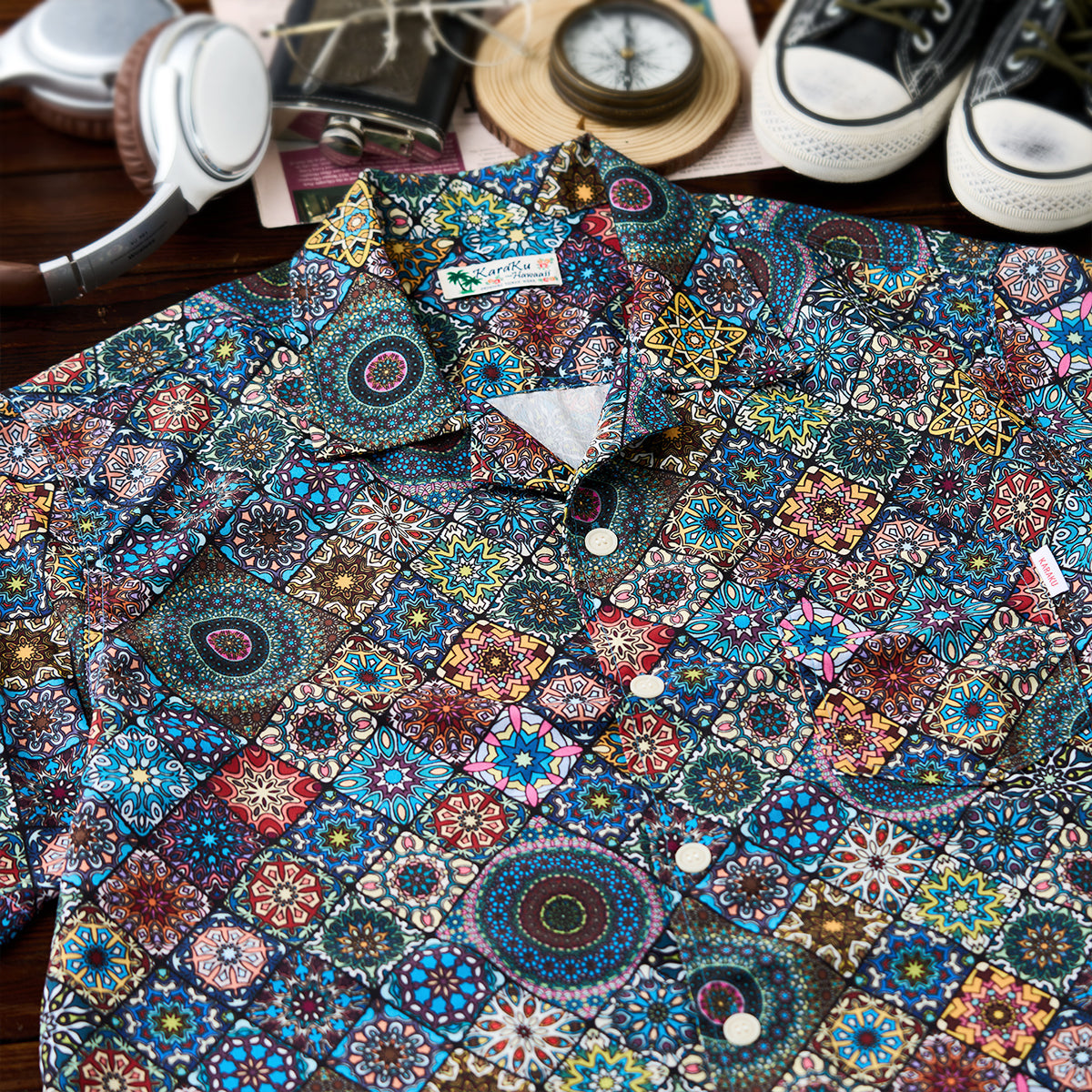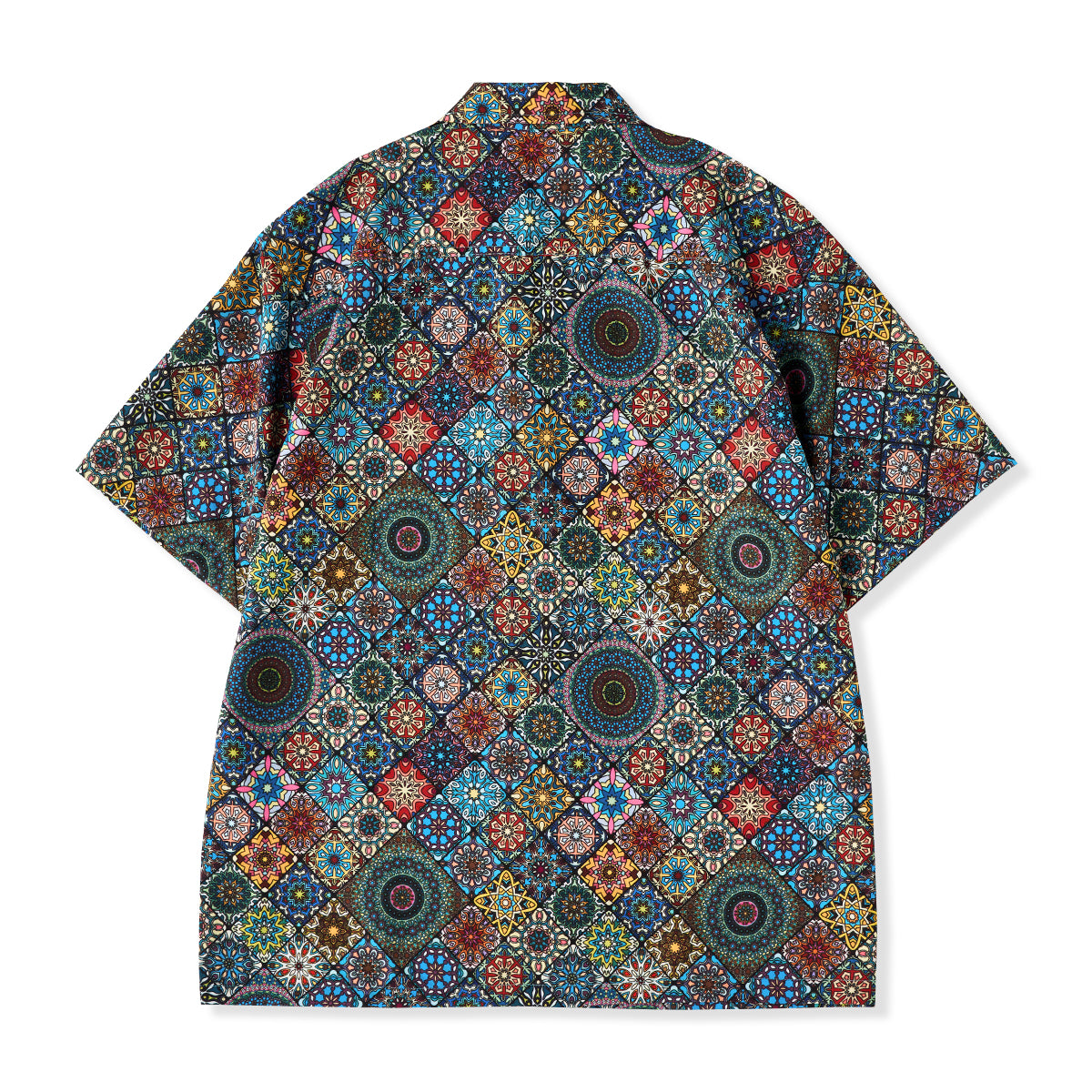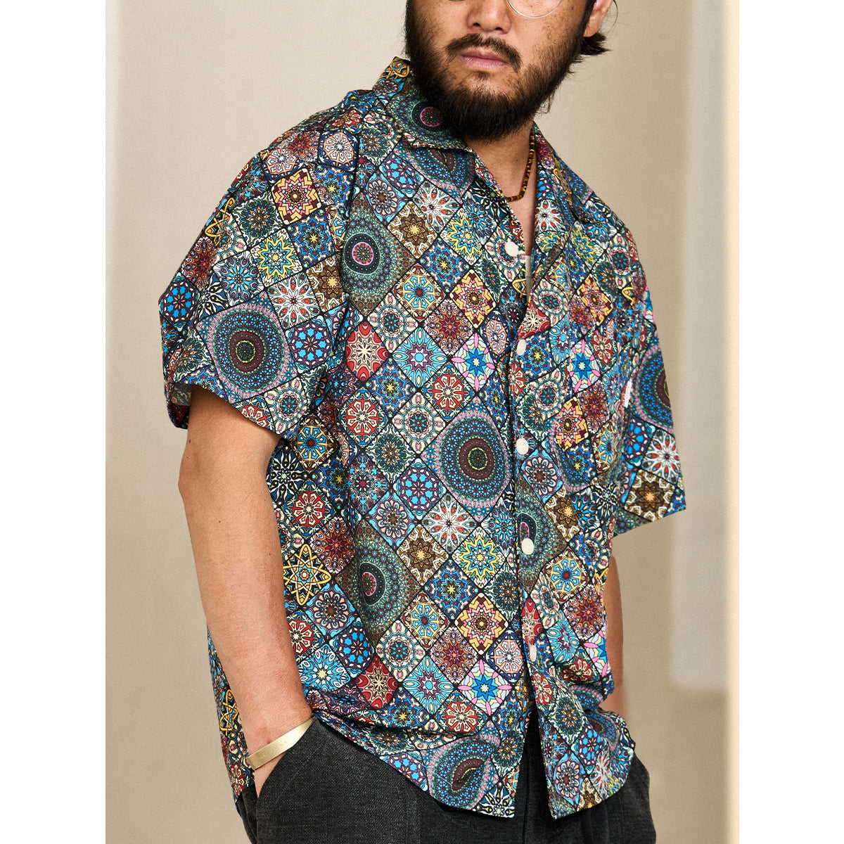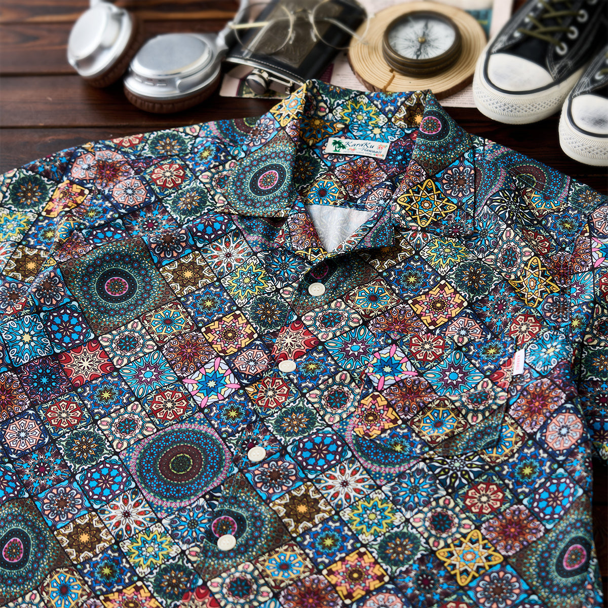 Here comes a Hawaiian shirt with a vivid summer print! Inspired by a kaleidoscope, this item beautifully captures the world of the kaleidoscope. The spread collar, unique print, and wide sleeves create a comfortable atmosphere, and this is a statement item that seems like it can complete your outfit with just one shirt. There is a pocket on the chest, so you can store all your necessary items. The coconut buttons on the front add a casual accent, and this shirt is great for vacation looks or the beach. This is the perfect item for the upcoming warmer seasons!