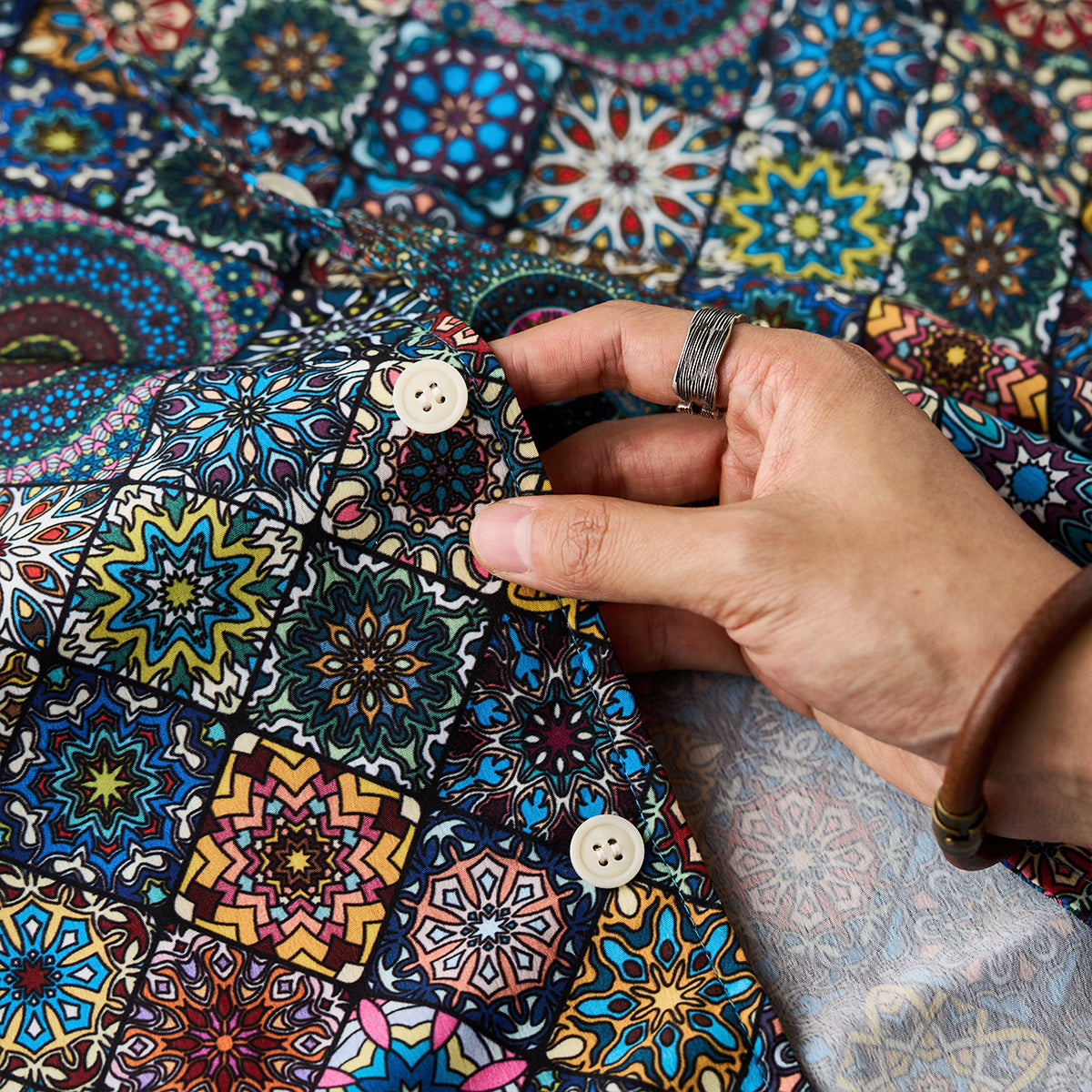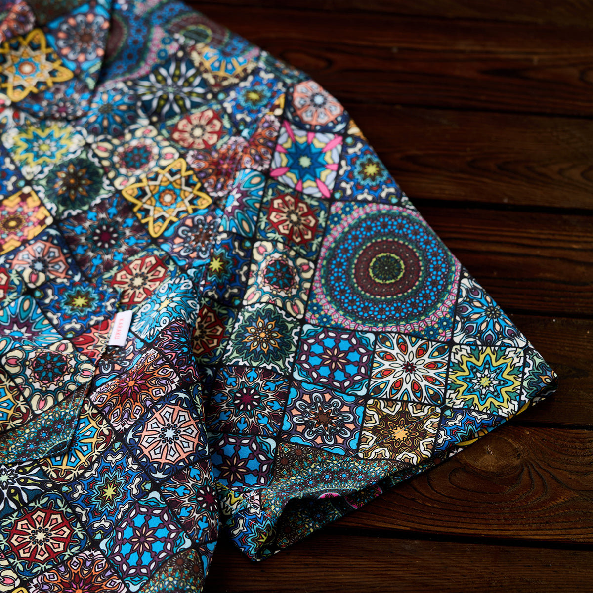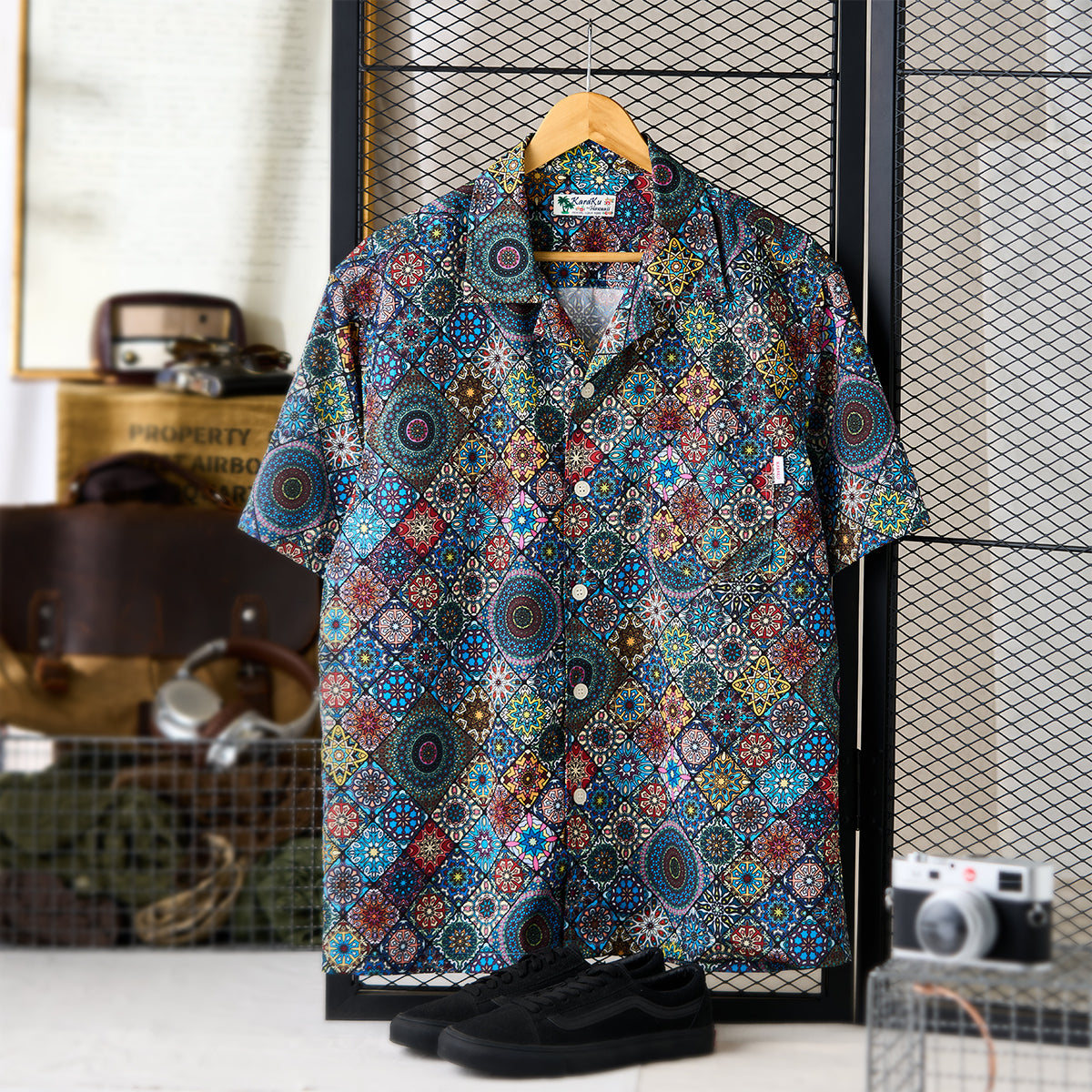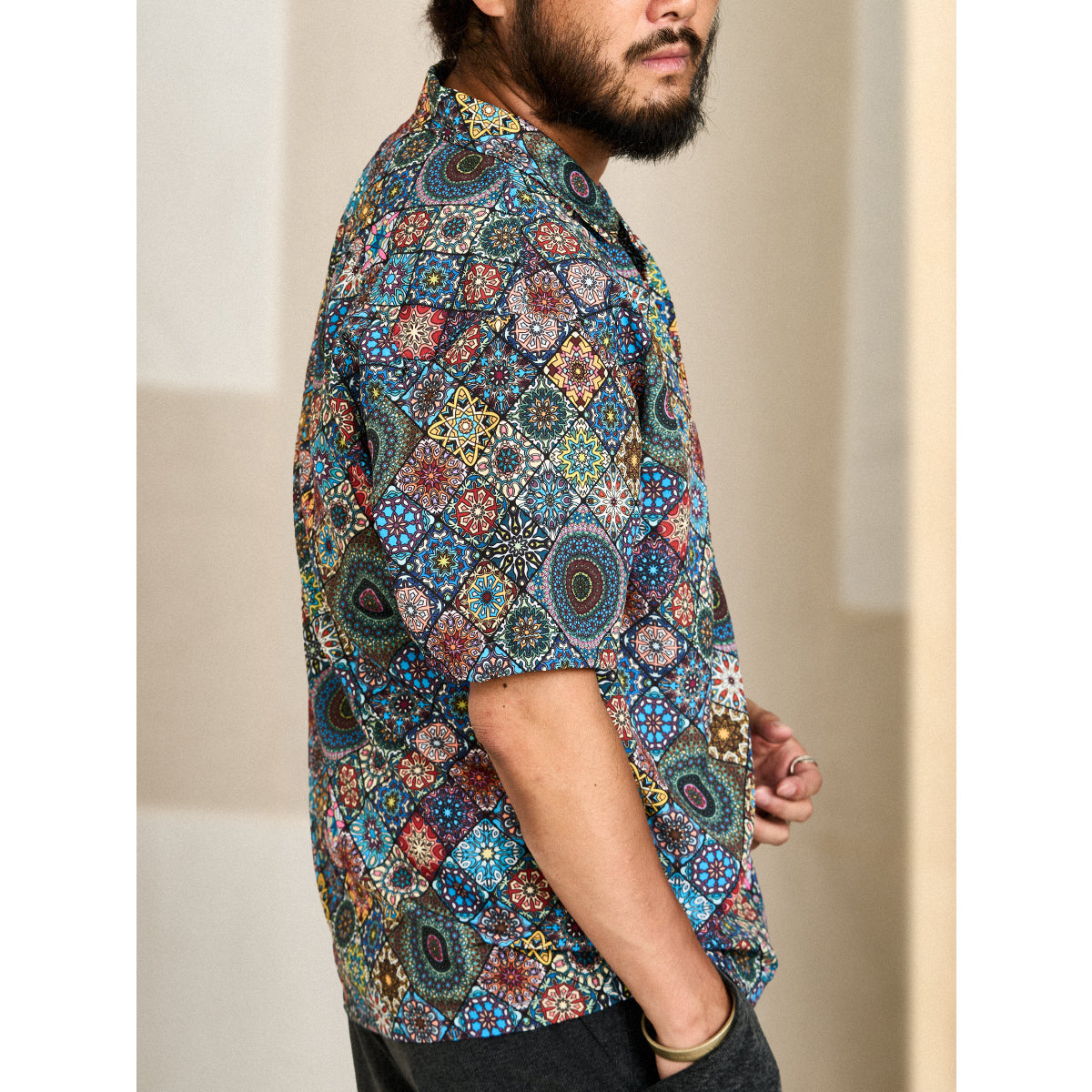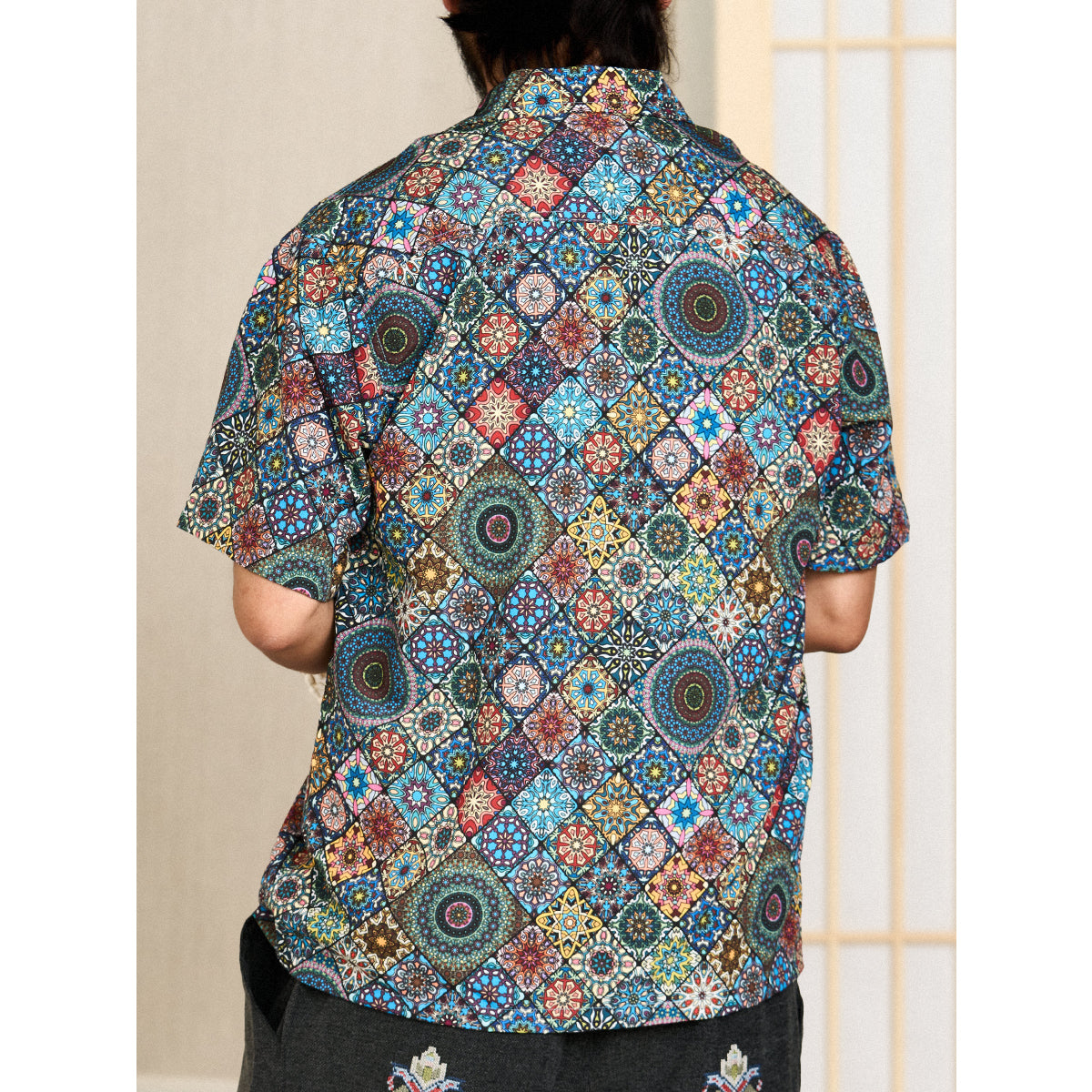 Here comes a Hawaiian shirt with a vivid summer print! Inspired by a kaleidoscope, this item beautifully captures the world of the kaleidoscope. The spread collar, unique print, and wide sleeves create a comfortable atmosphere, and this is a statement item that seems like it can complete your outfit with just one shirt. There is a pocket on the chest, so you can store all your necessary items. The coconut buttons on the front add a casual accent, and this shirt is great for vacation looks or the beach. This is the perfect item for the upcoming warmer seasons!