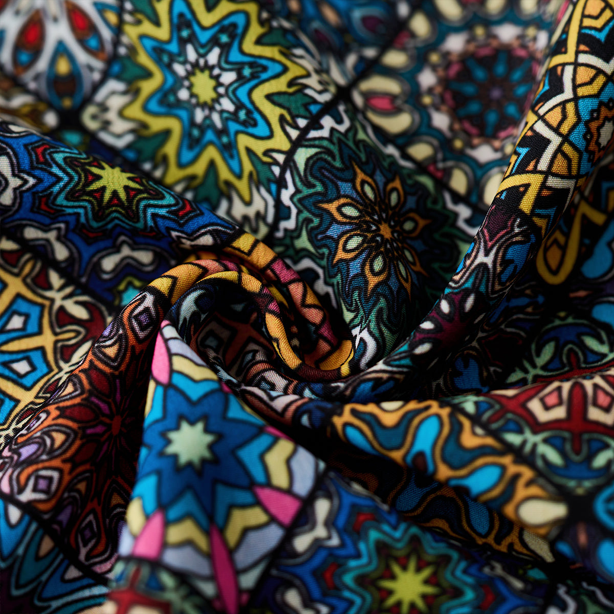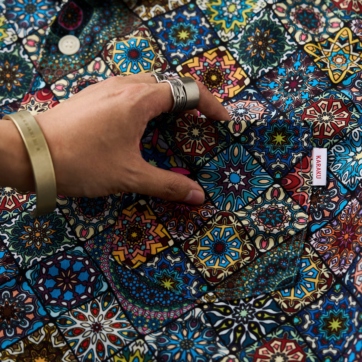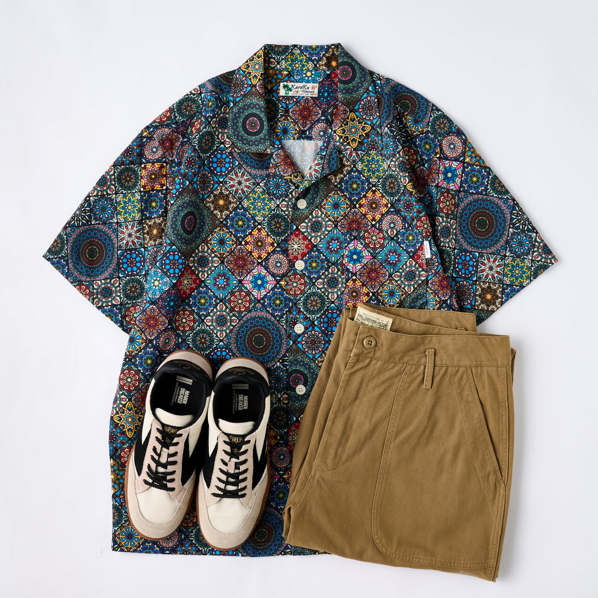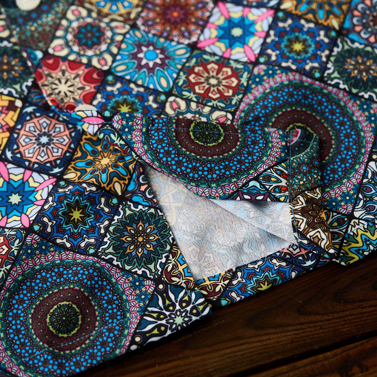 Here comes a Hawaiian shirt with a vivid summer print! Inspired by a kaleidoscope, this item beautifully captures the world of the kaleidoscope. The spread collar, unique print, and wide sleeves create a comfortable atmosphere, and this is a statement item that seems like it can complete your outfit with just one shirt. There is a pocket on the chest, so you can store all your necessary items. The coconut buttons on the front add a casual accent, and this shirt is great for vacation looks or the beach. This is the perfect item for the upcoming warmer seasons!