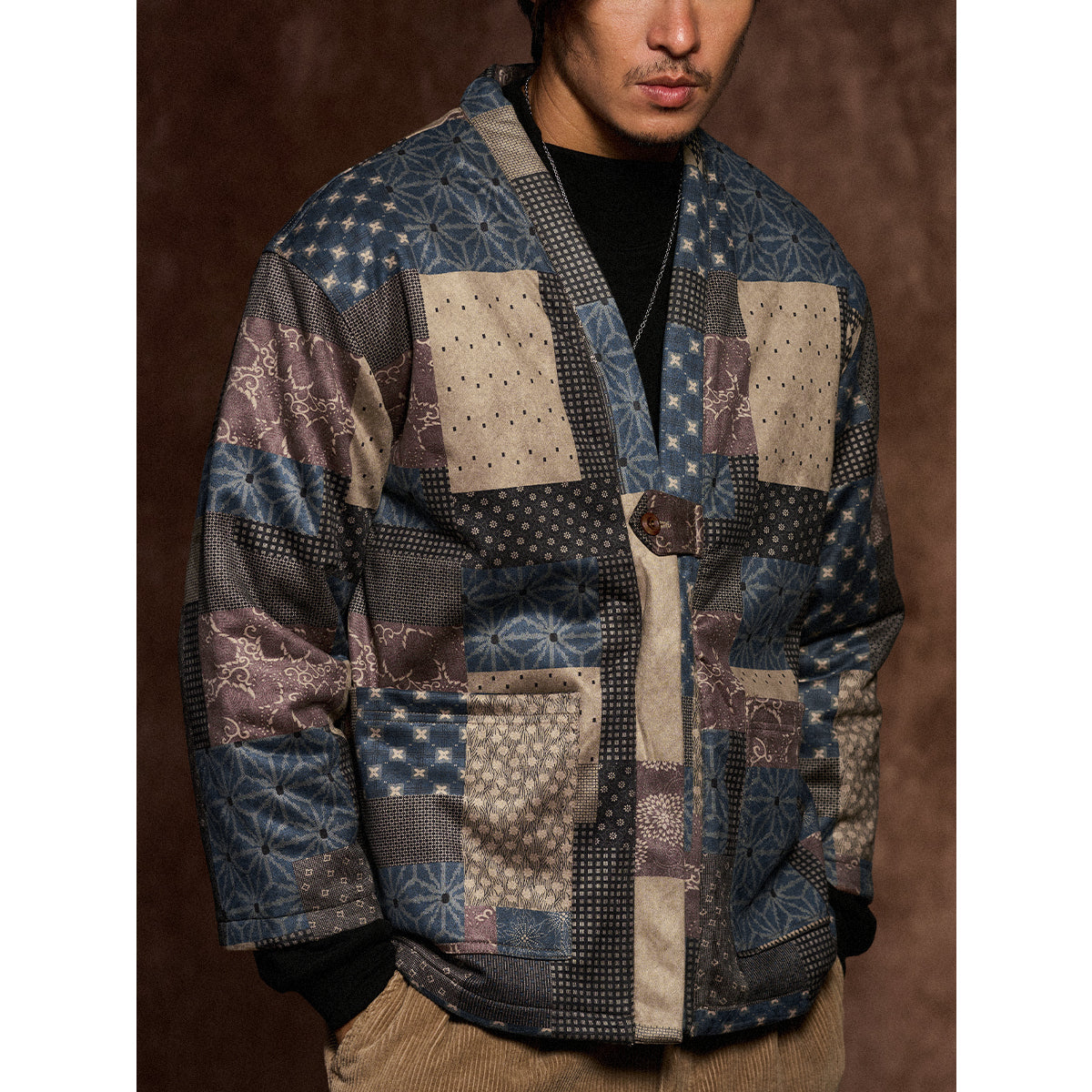 This product features a Hanten motif and a unique antique feel created by the Boro Pachiwork technique. The triple-layered fabric is soft and durable, and boasts high heat retention and flexibility. It is great to use as a cardigan in fall and winter, and goes well with casual denim or chino pants. This is an item where you can enjoy the charm of traditional Japanese beauty and craftsmanship.
