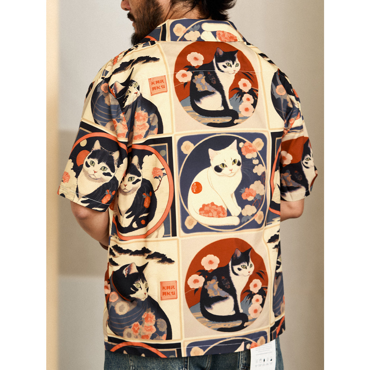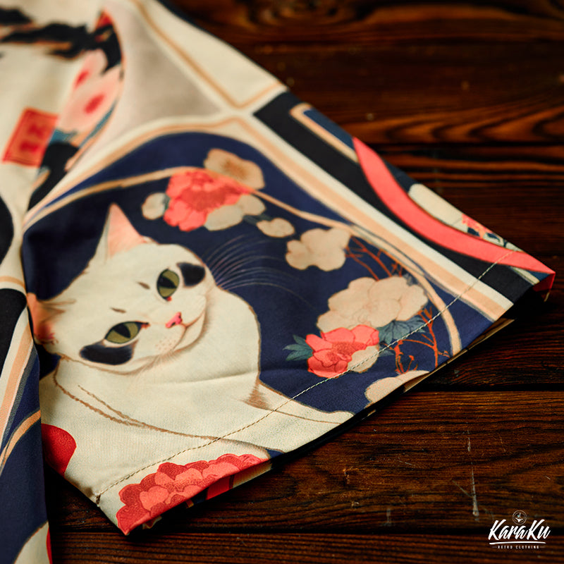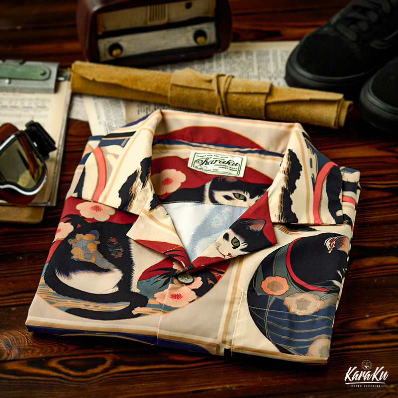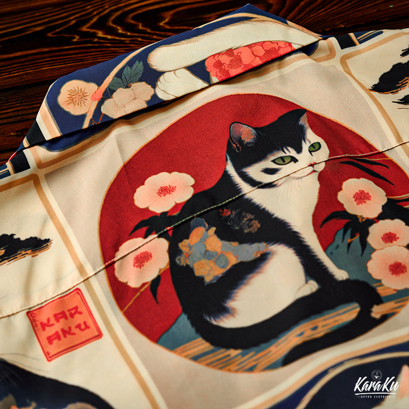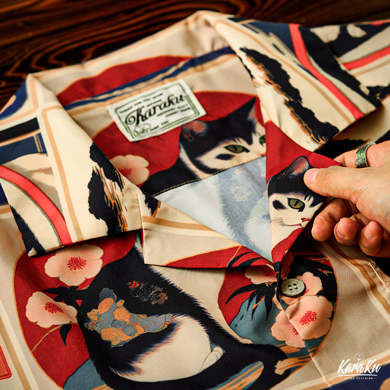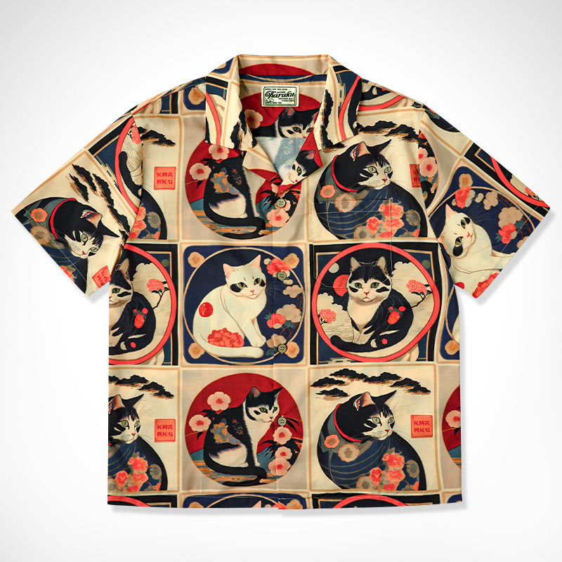 Aloha shirt with a cat pattern in the Ukiyo-e style from the Meiji period