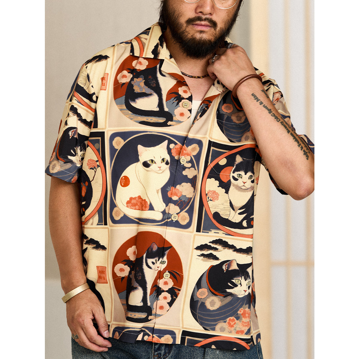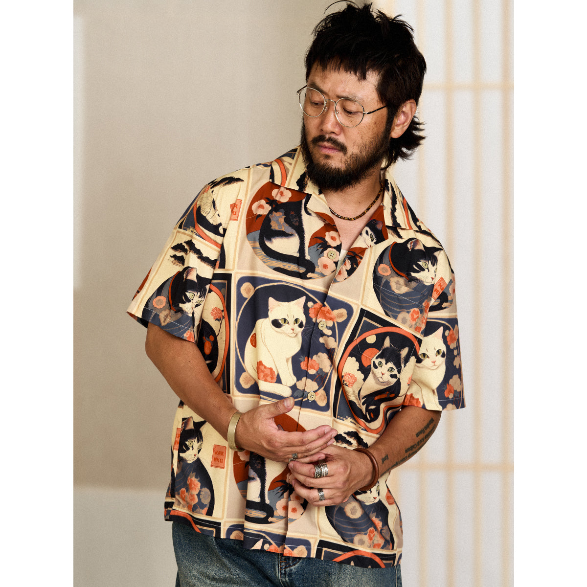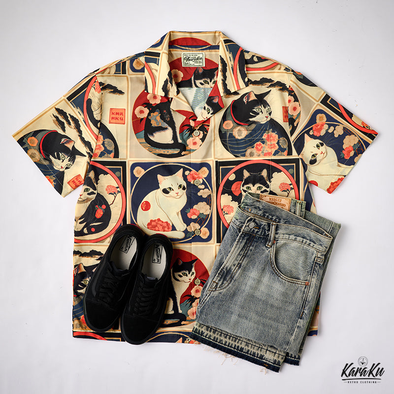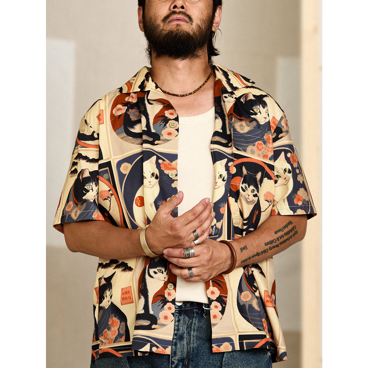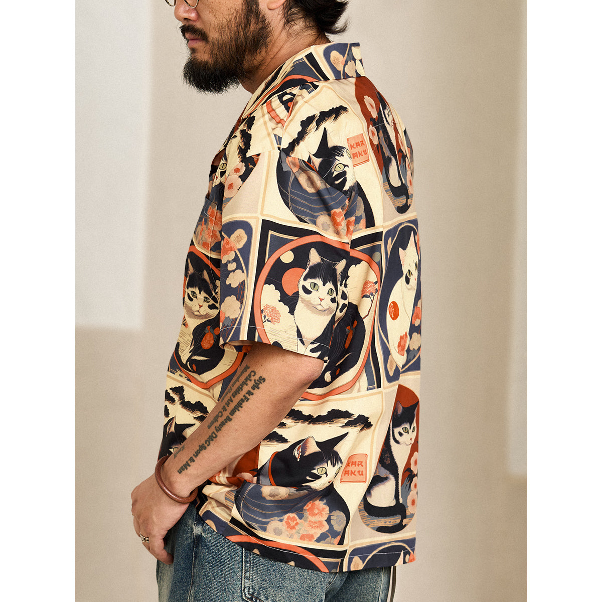 Aloha shirt with a cat pattern in the Ukiyo-e style from the Meiji period