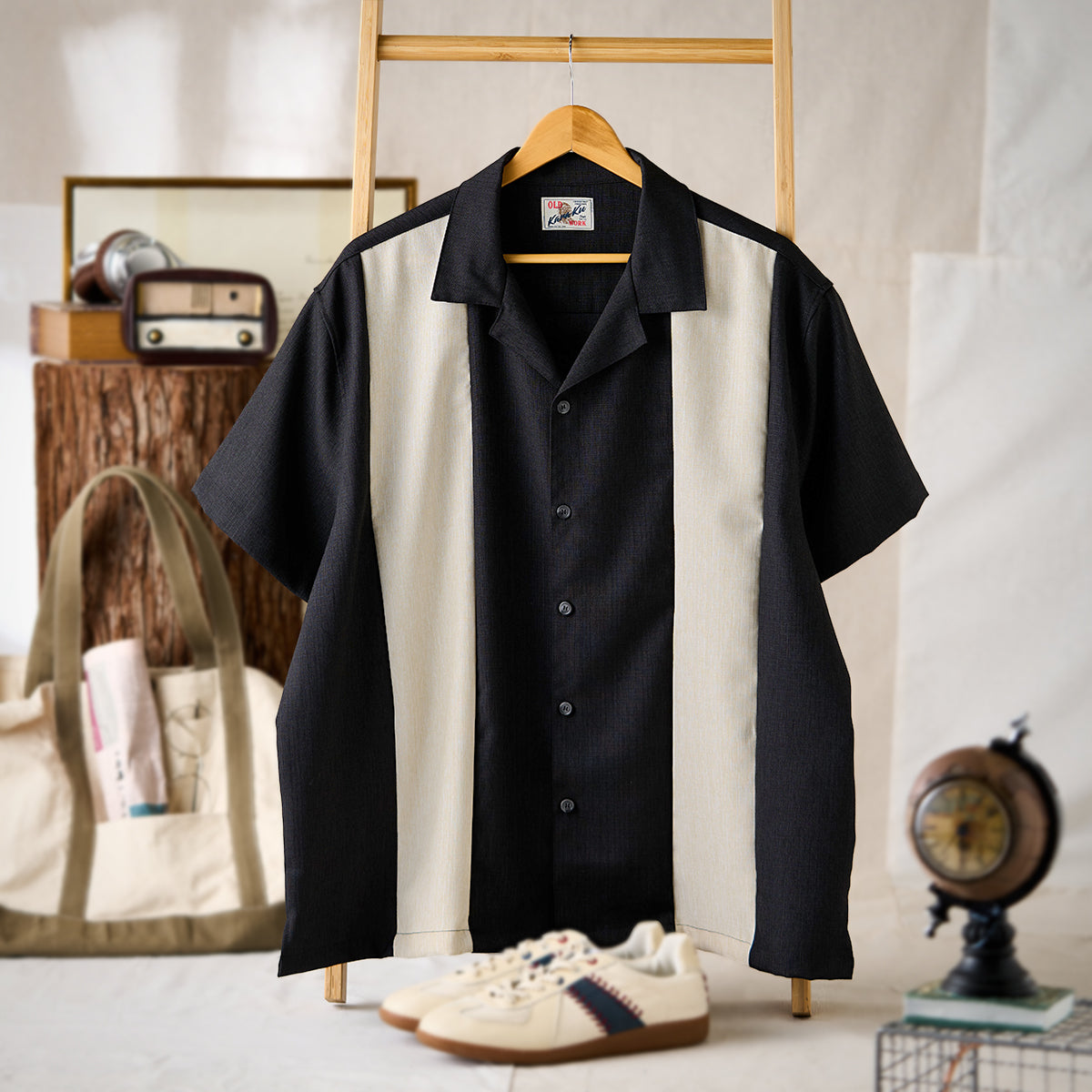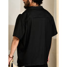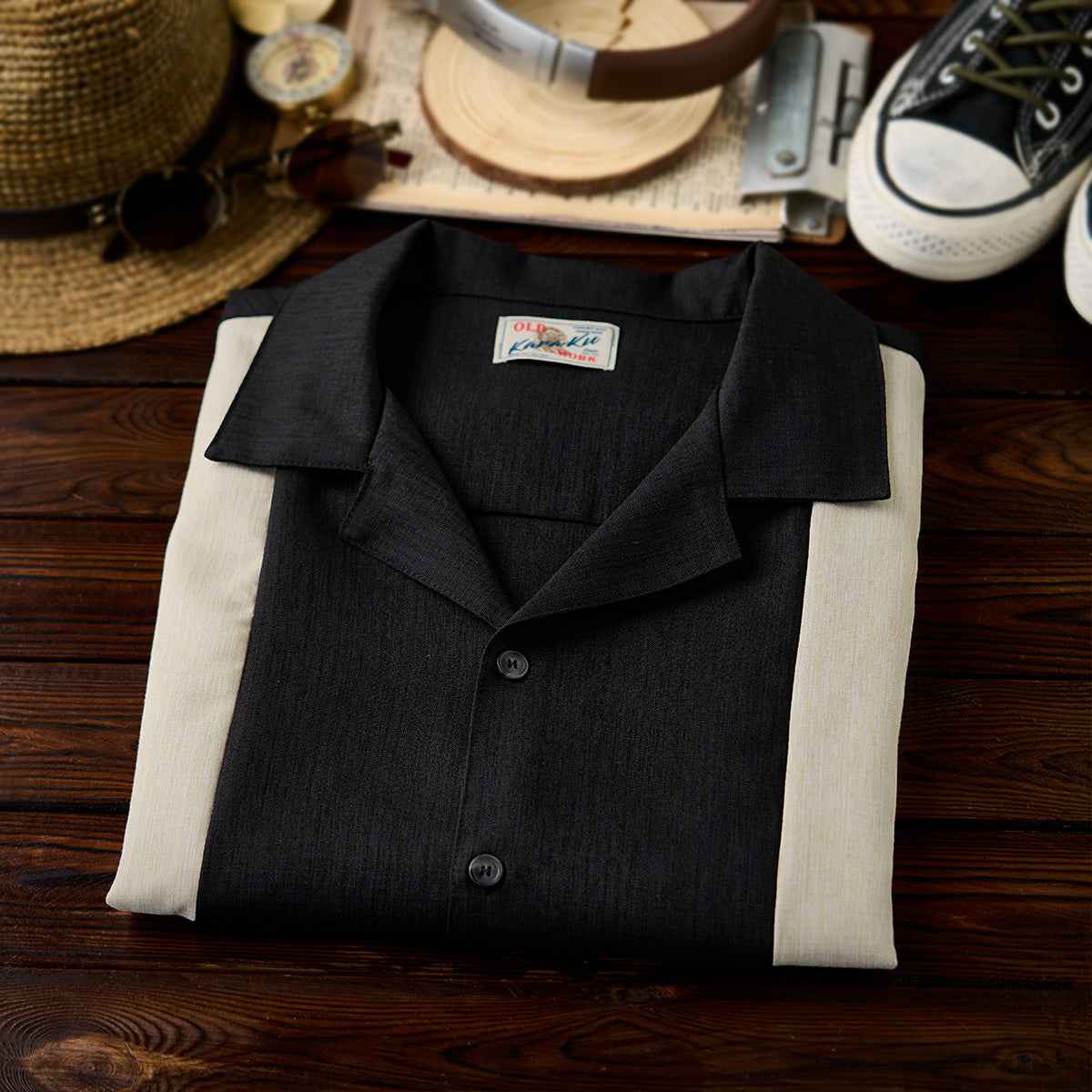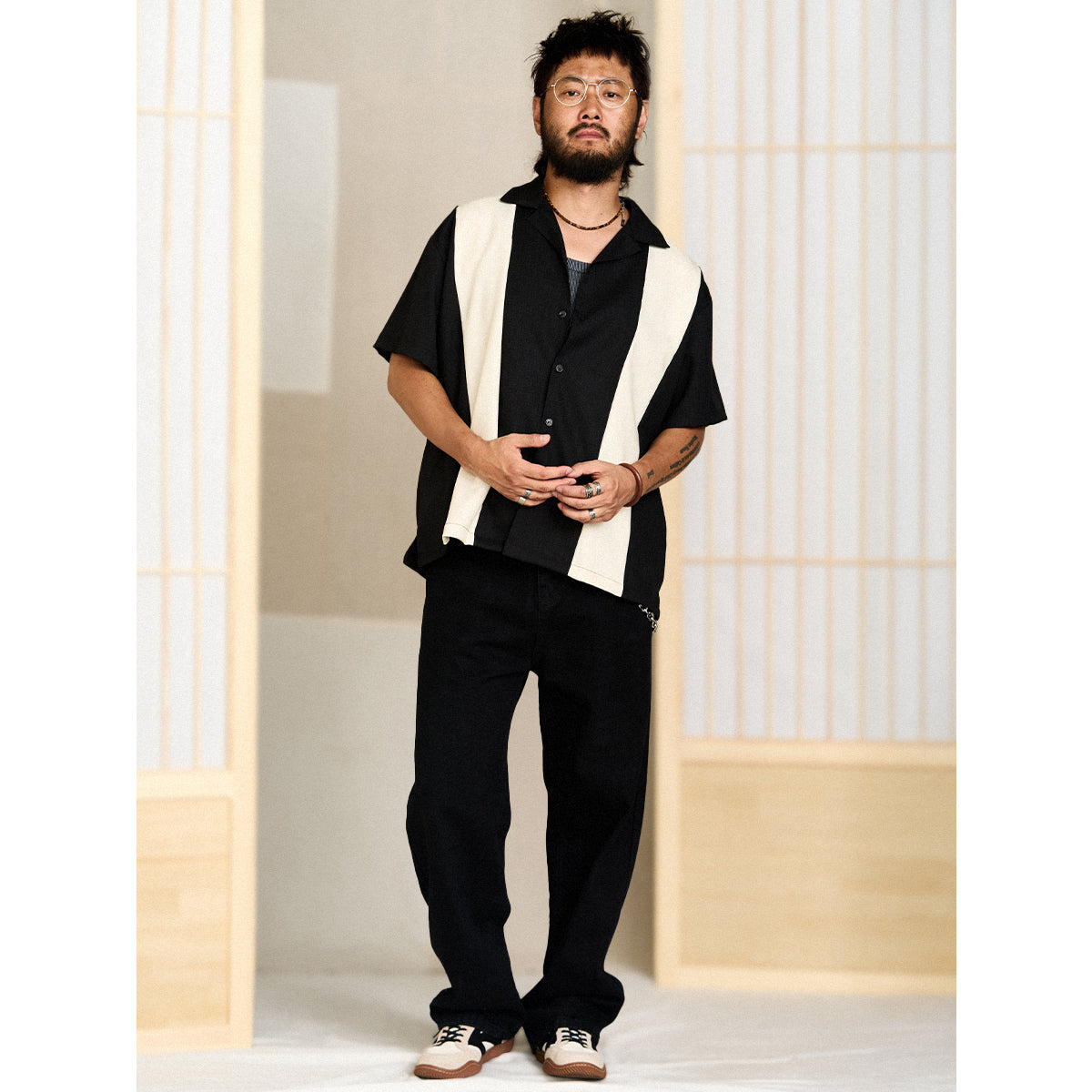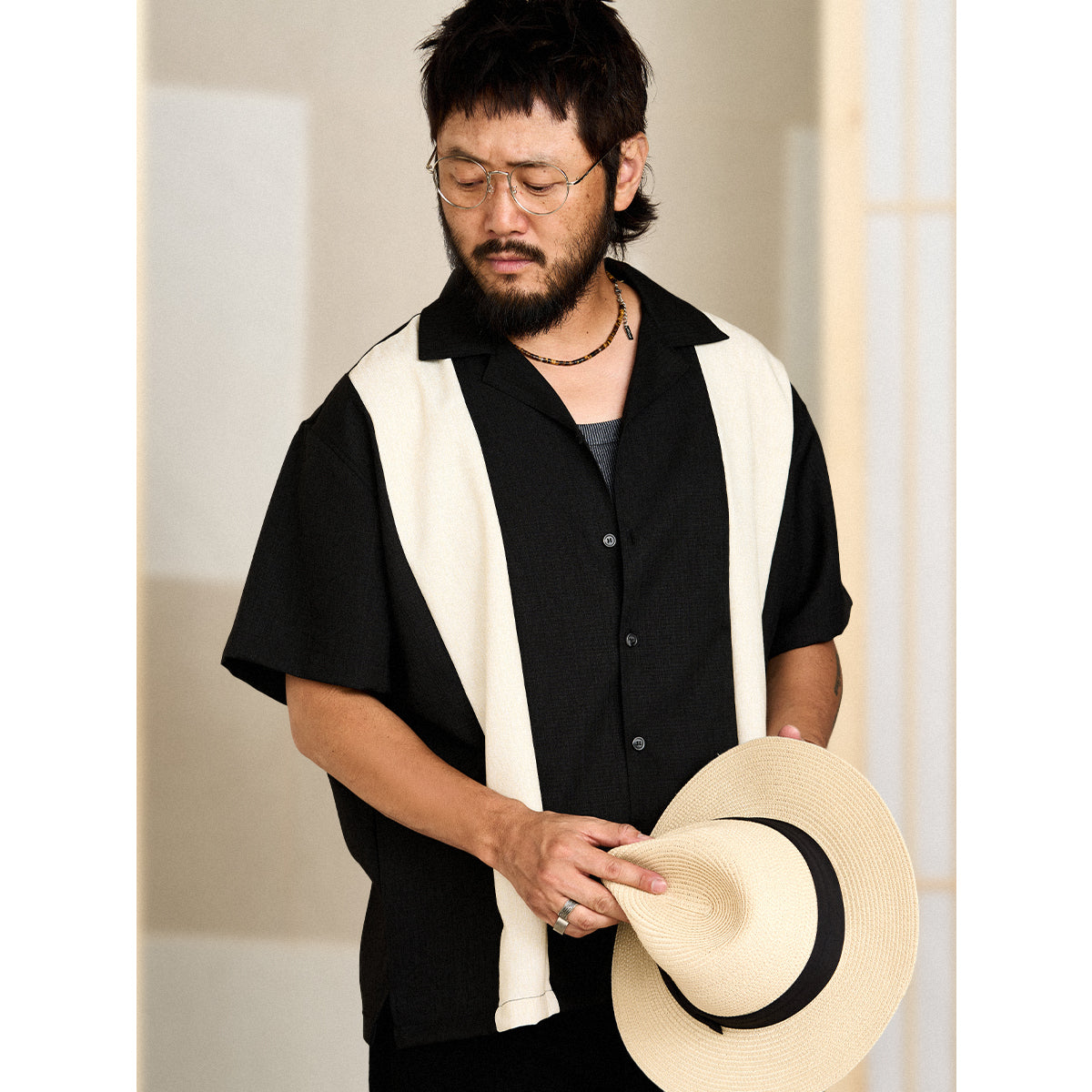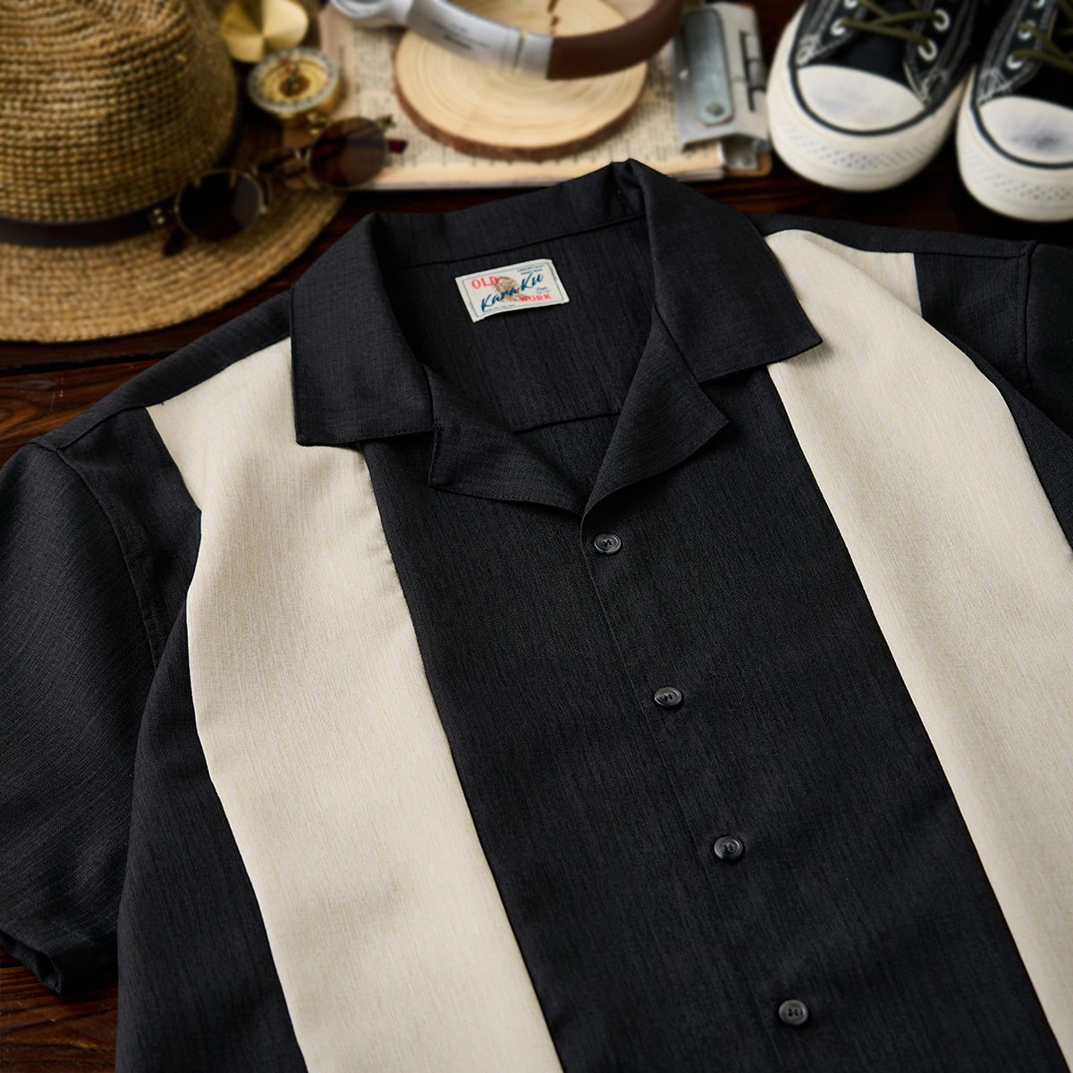 Multi-material combination Cuban collar short sleeve shirt