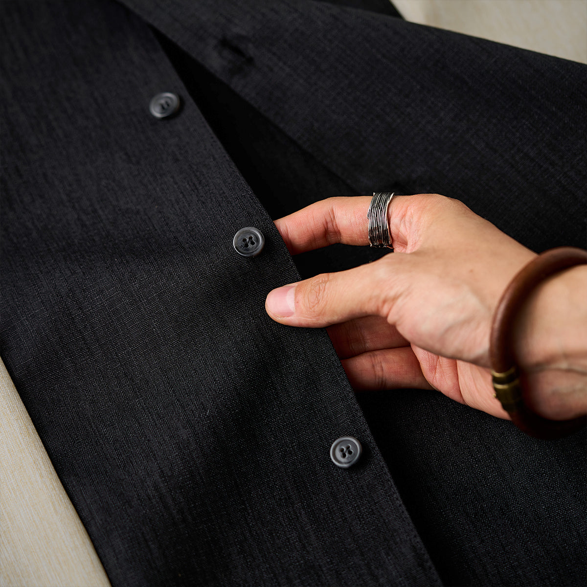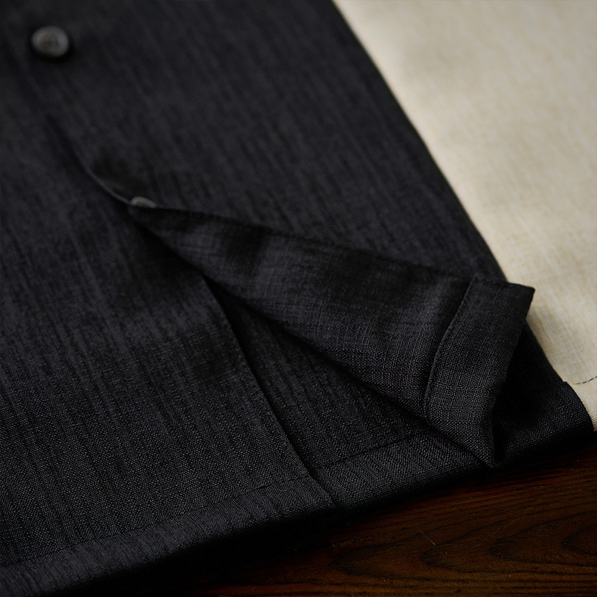 Made of real-dyed fabric, it boasts a light yet soft touch, and is characterized by a texture like a quilt and a subtle sheen. The color balance with suppressed discoloration creates a luxurious atmosphere, and the three-dimensionality and depth unique to yarn-dyed fabrics provide a charm that is hard to find in regular fabrics.