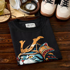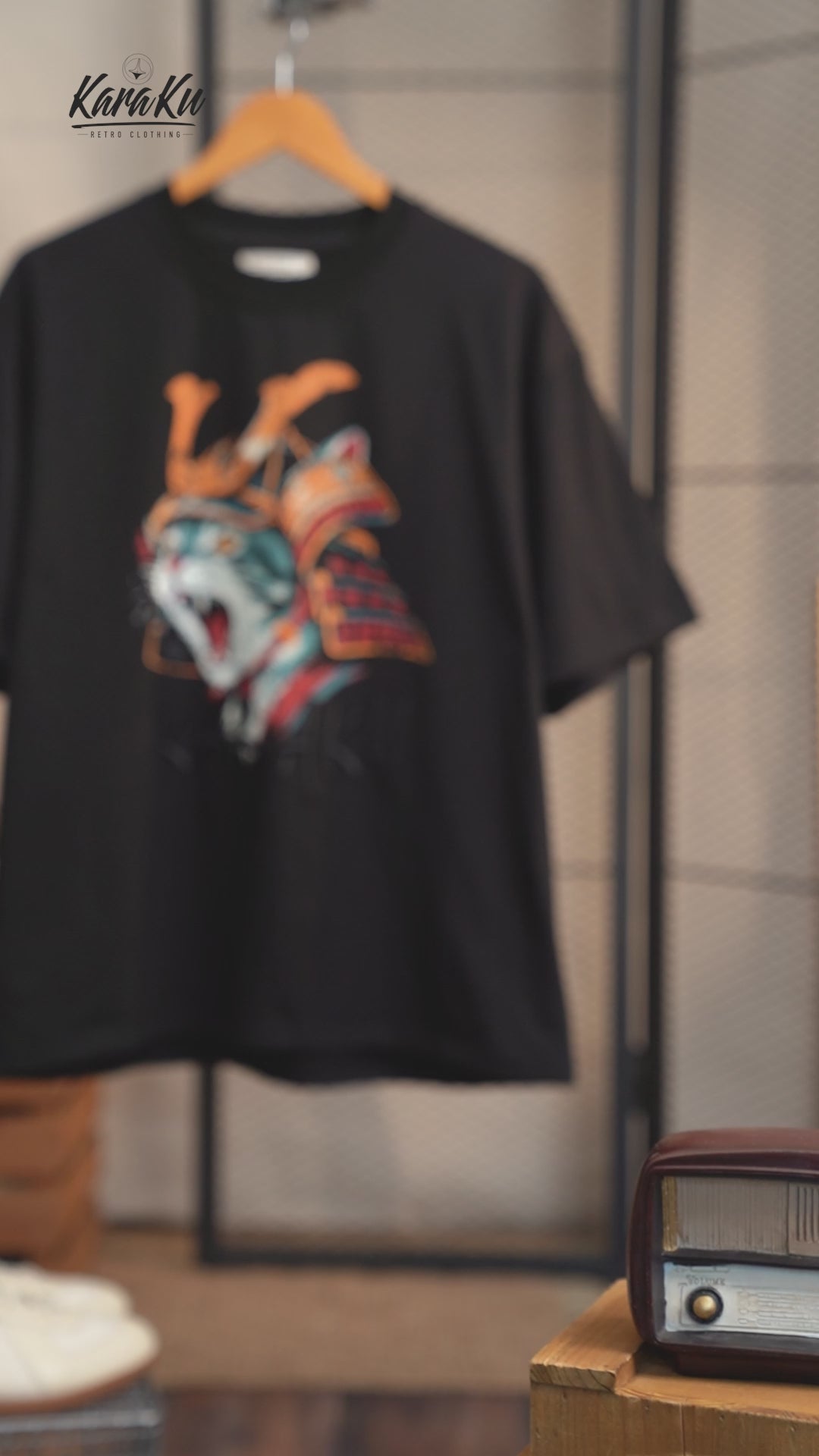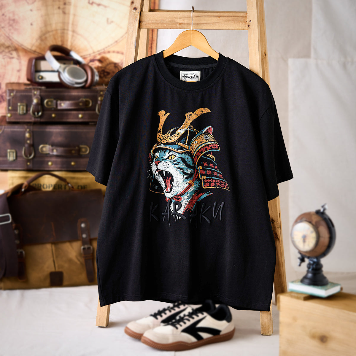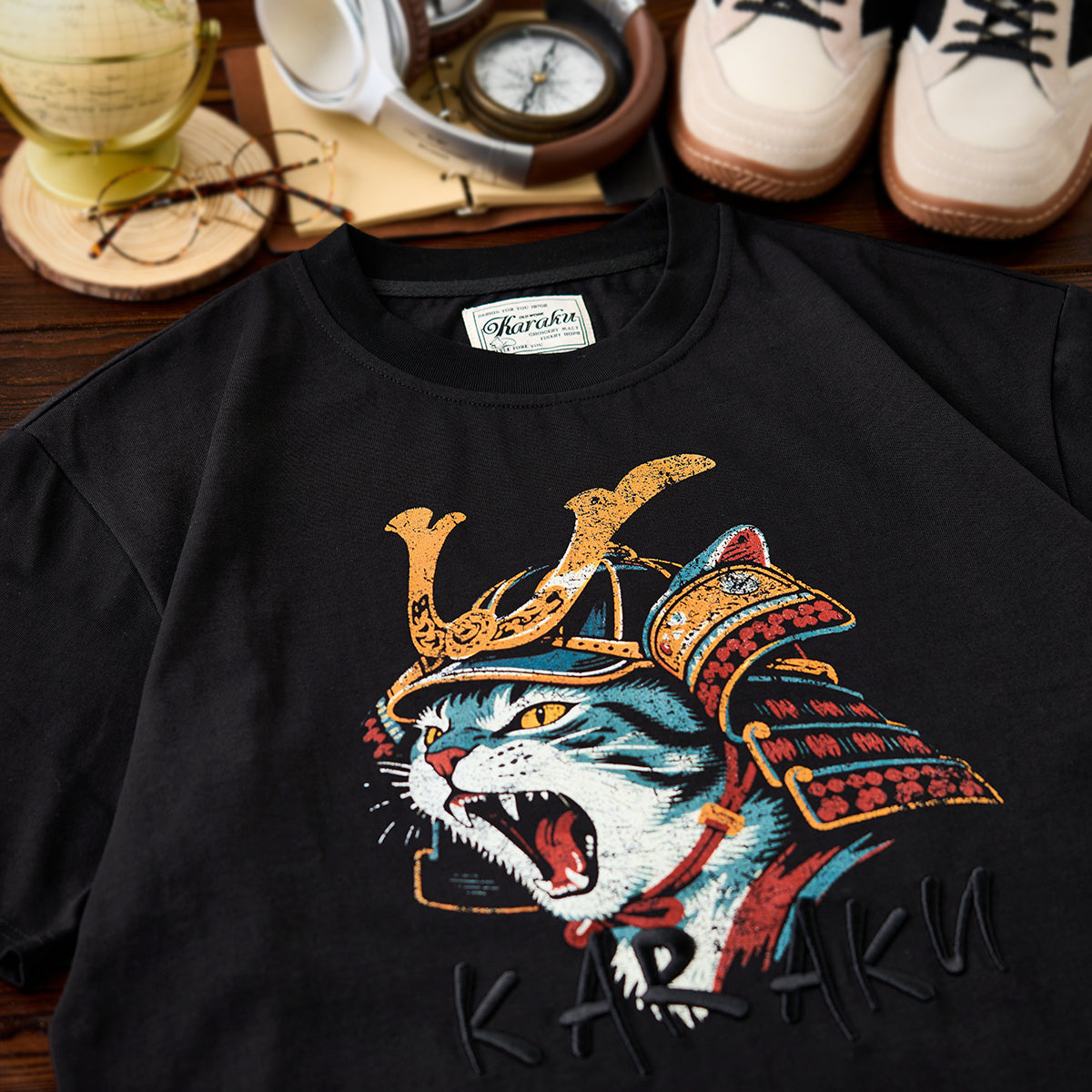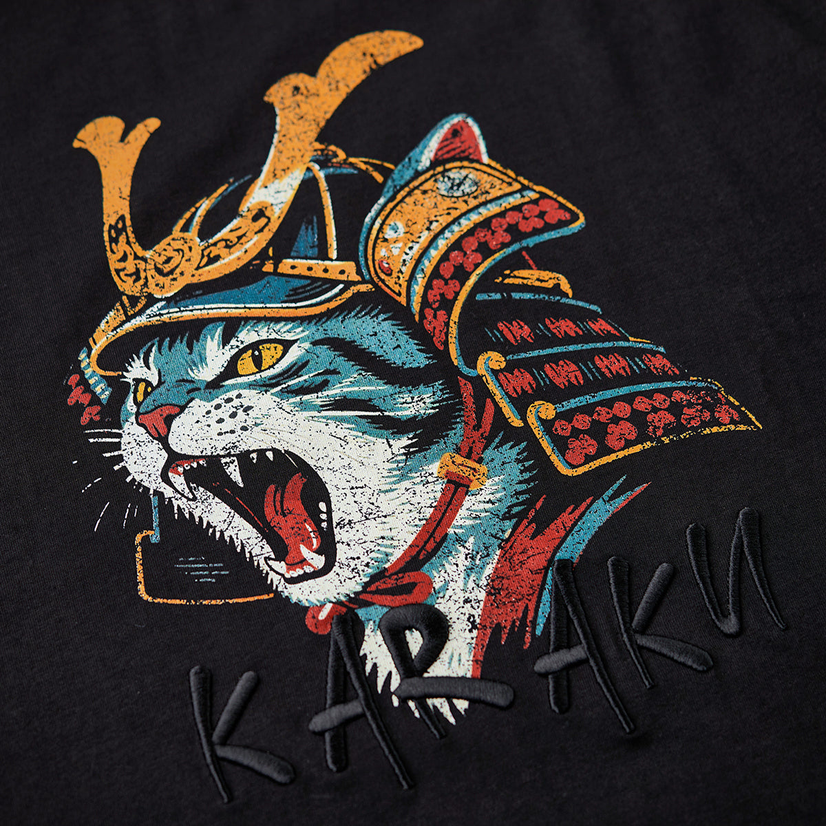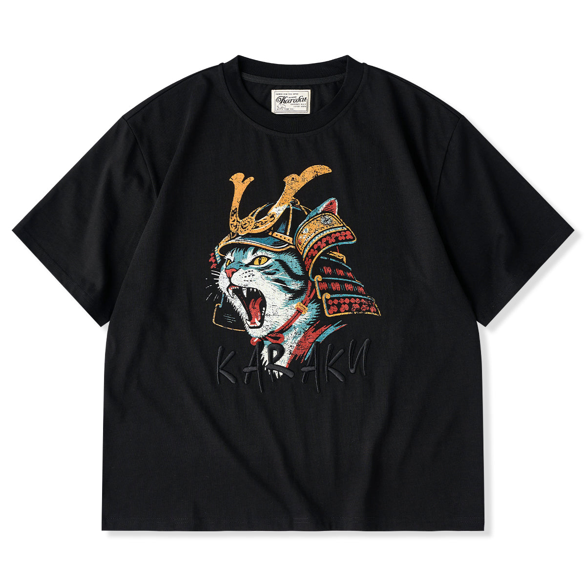 위엄 있는 무사 갑옷을 입고 포효하는 고양이를 그린 그래픽 티셔츠. KARAKU 특유의 유머와 아트 감성이 조화를 이룬 독창적인 아이템입니다.