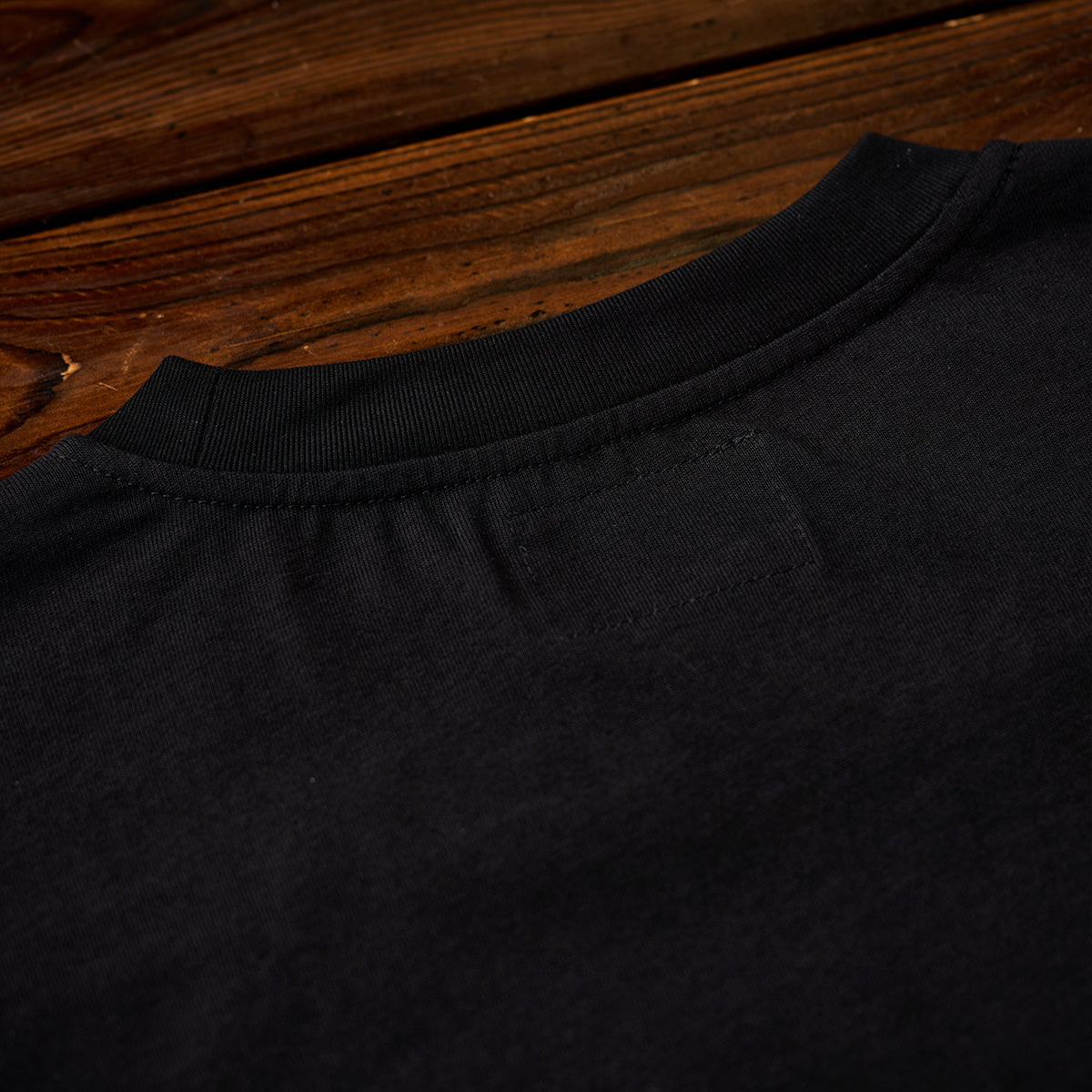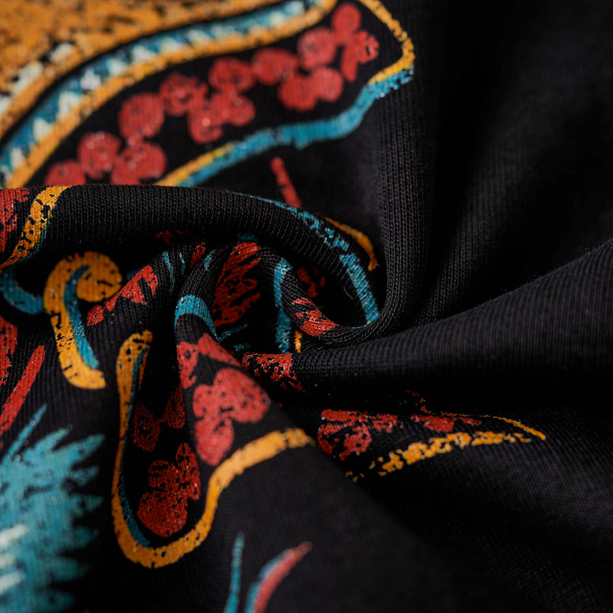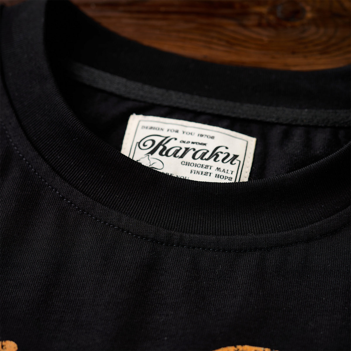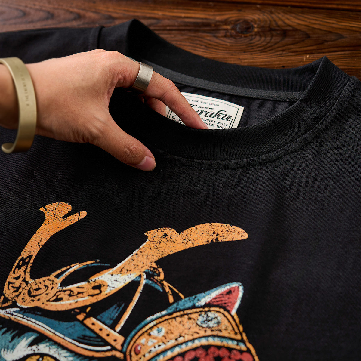 프린트에는 벗겨진 듯한 가공 효과로 빈티지한 분위기를, 그 아래에는 'karaku' 로고 자수로 브랜드의 개성을 선명하게 드러냈습니다.