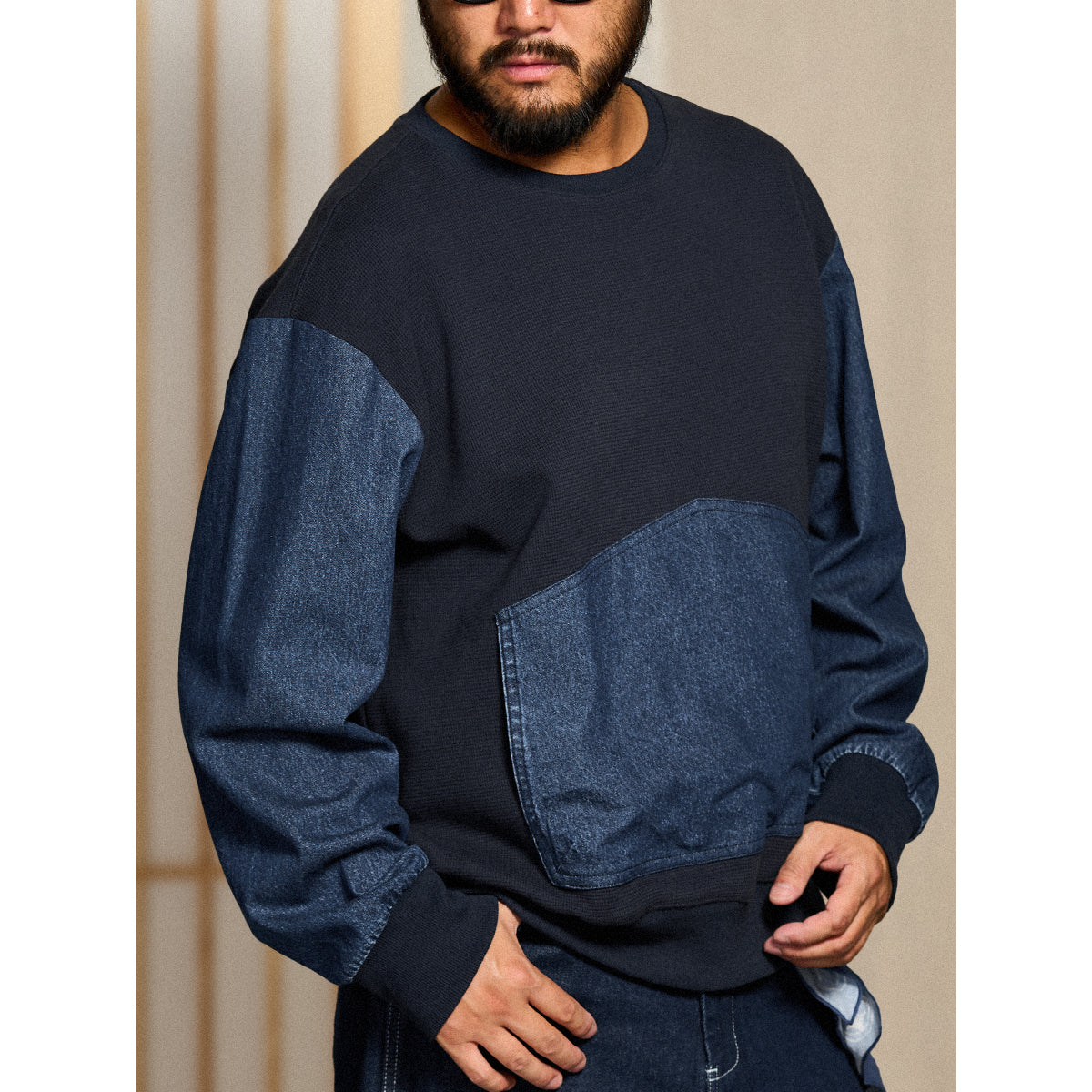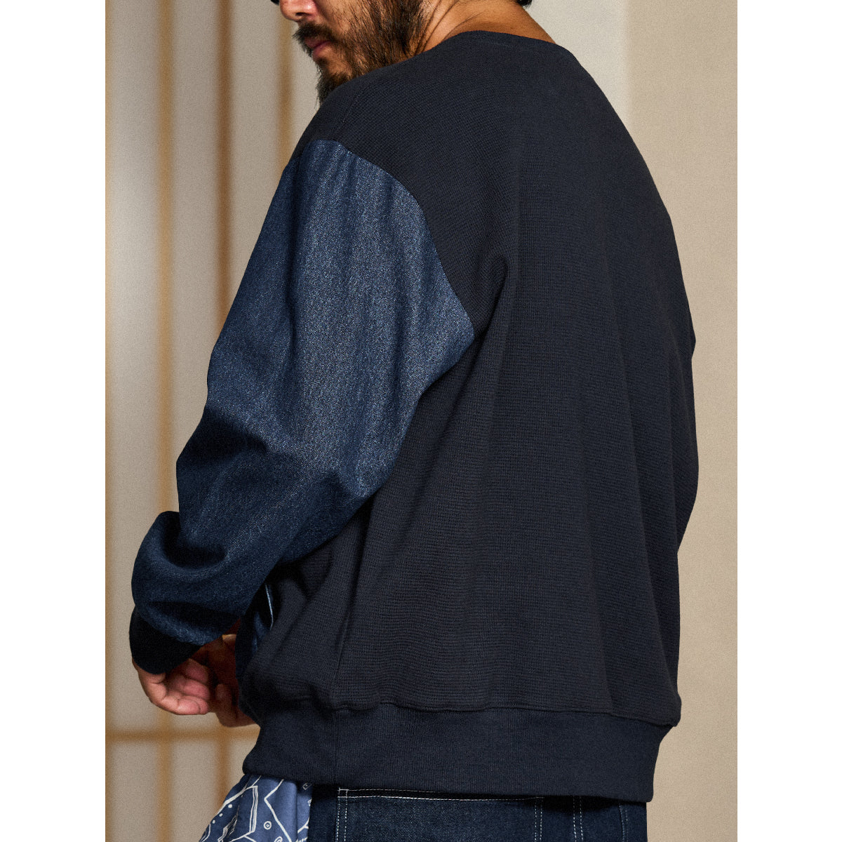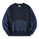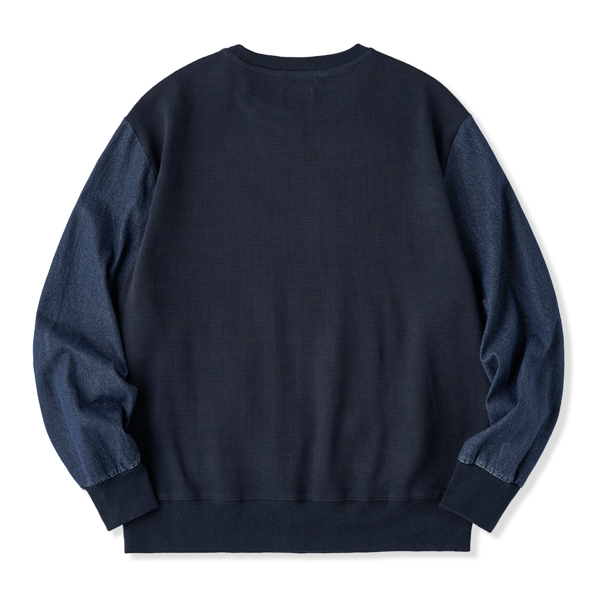 소매·포켓 워시드 데님 배색 와플 풀오버 스웨트셔츠