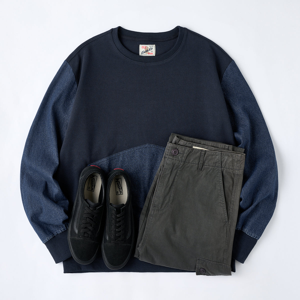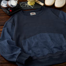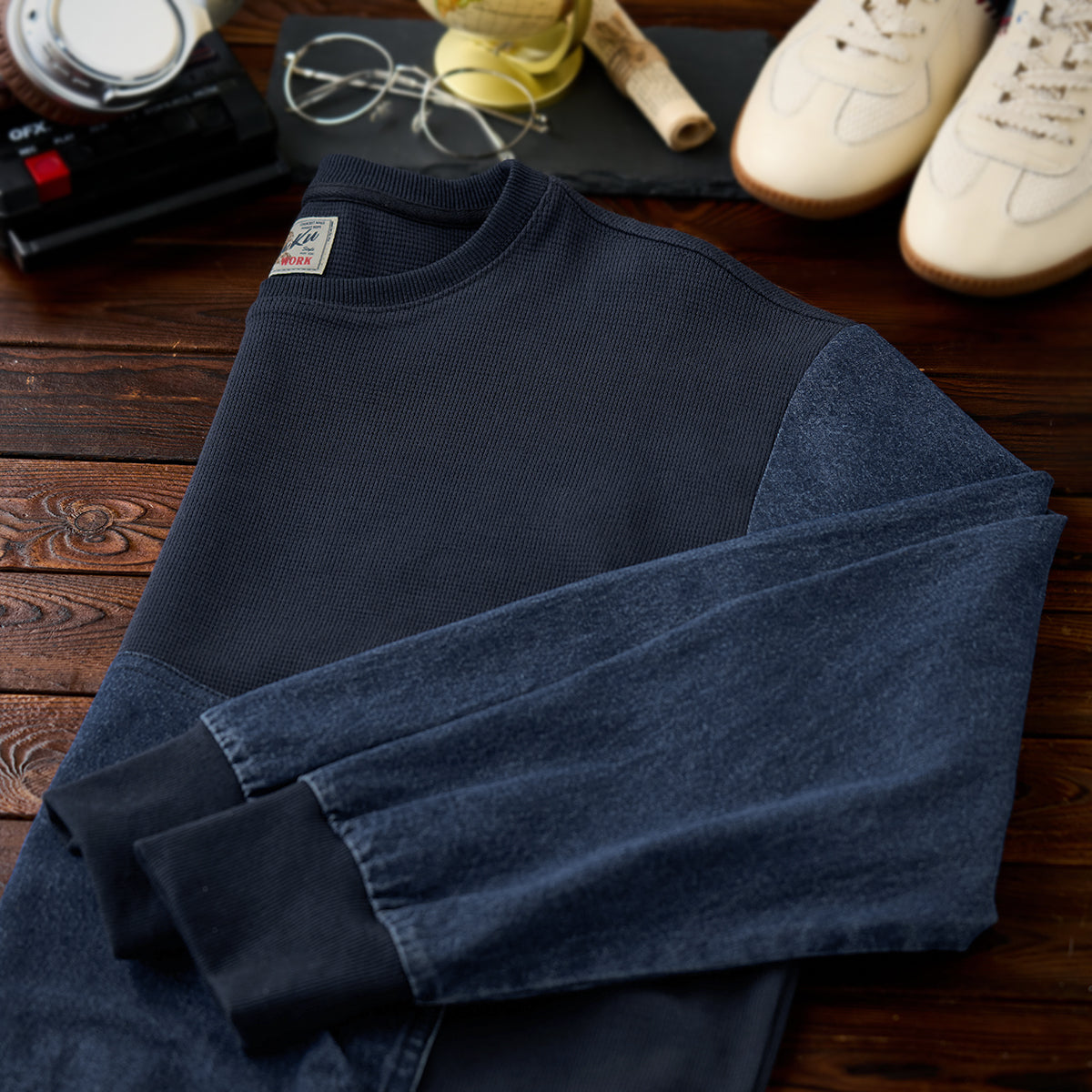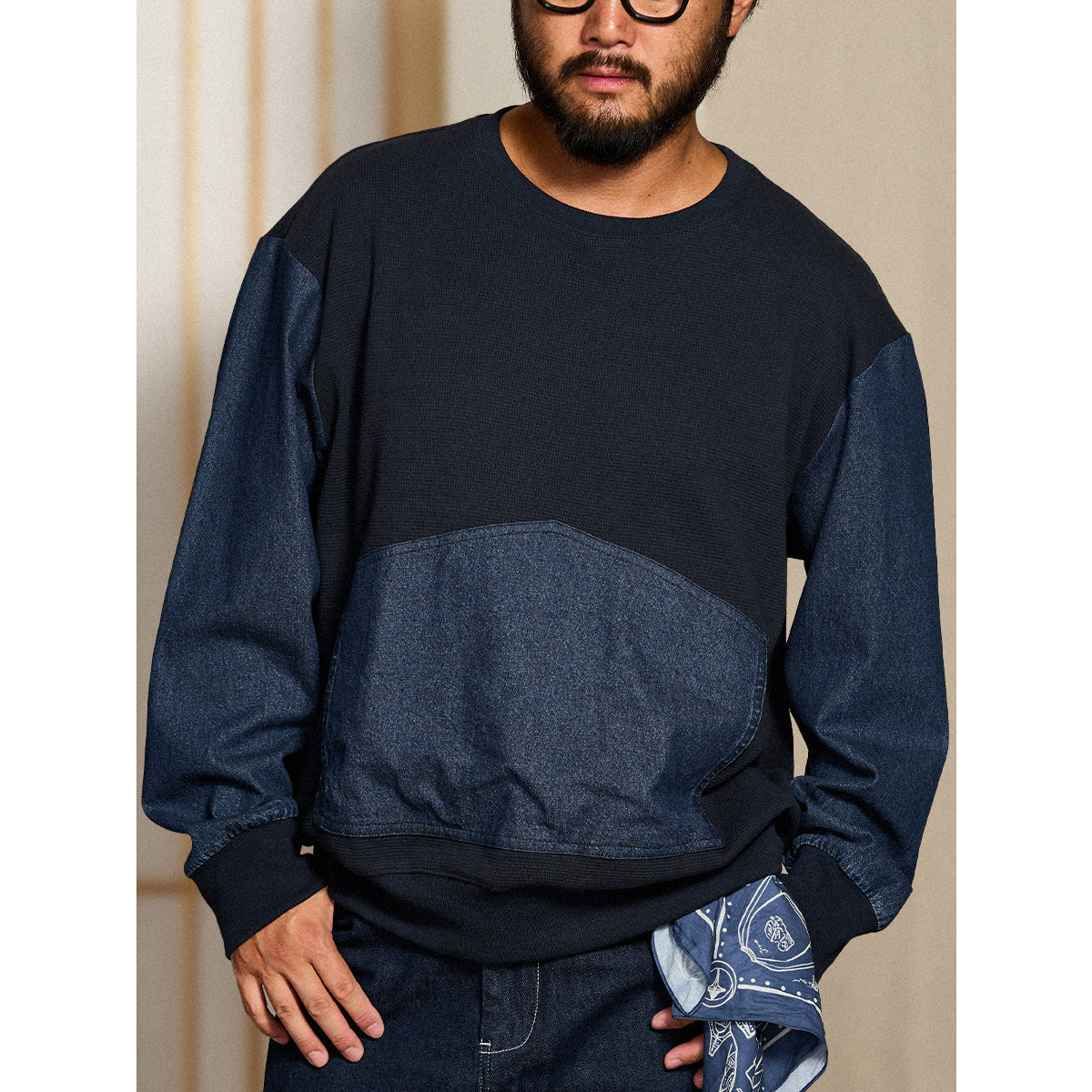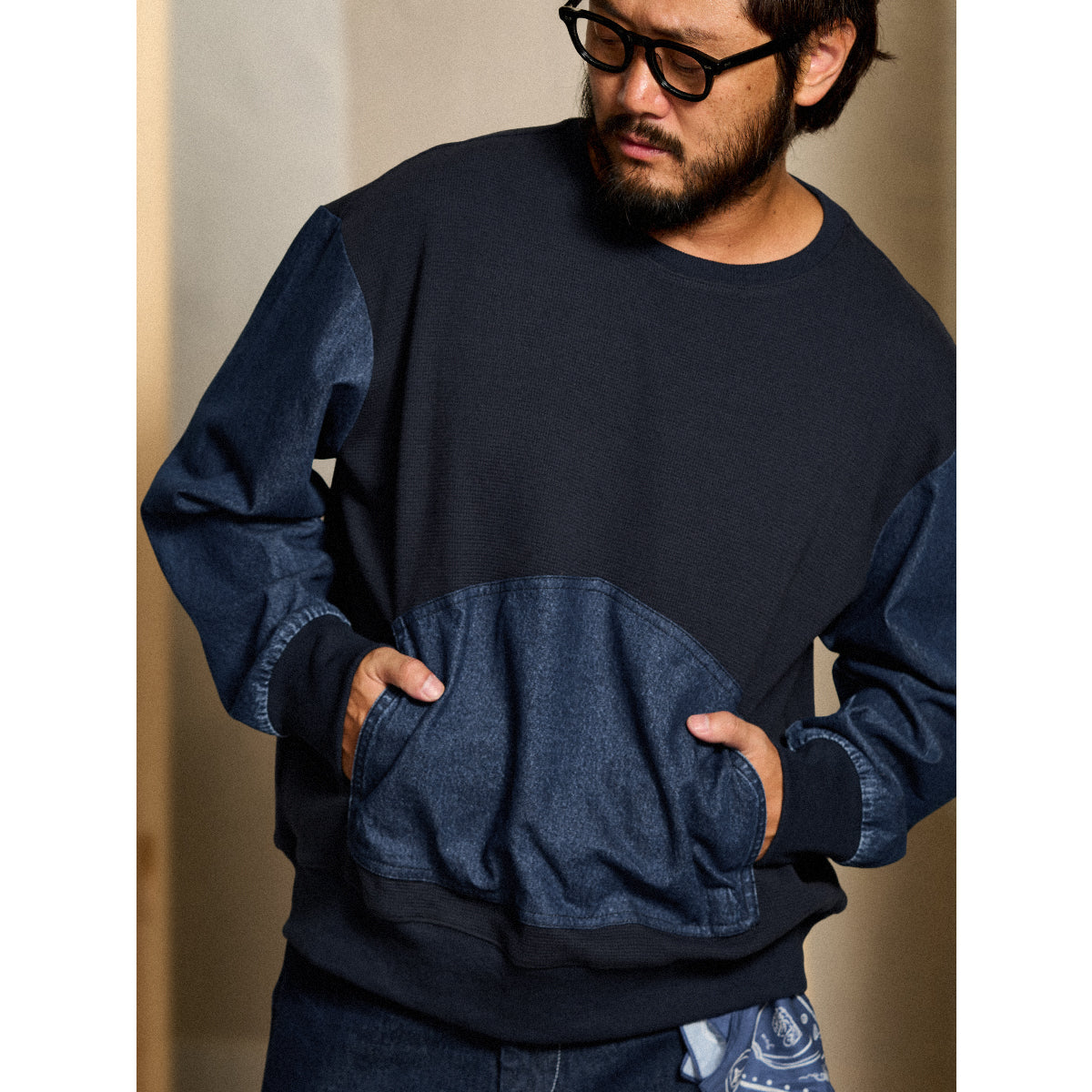 소매·포켓 워시드 데님 배색 와플 풀오버 스웨트셔츠