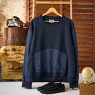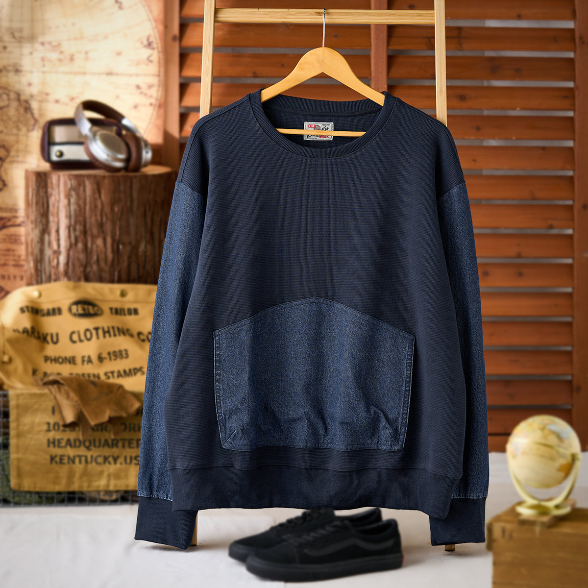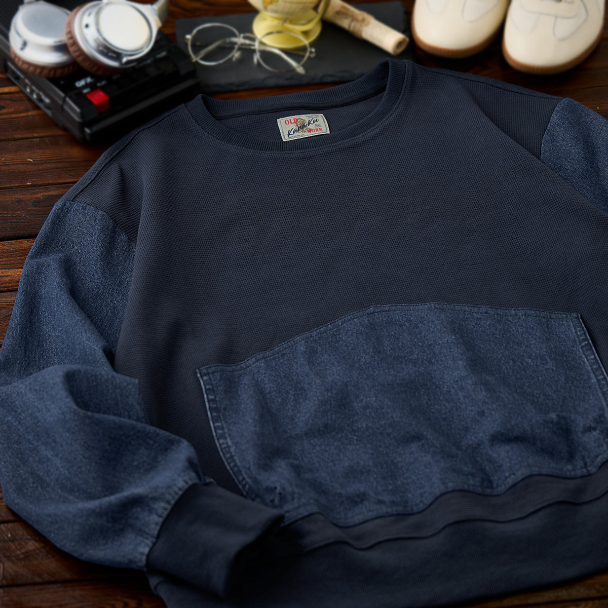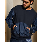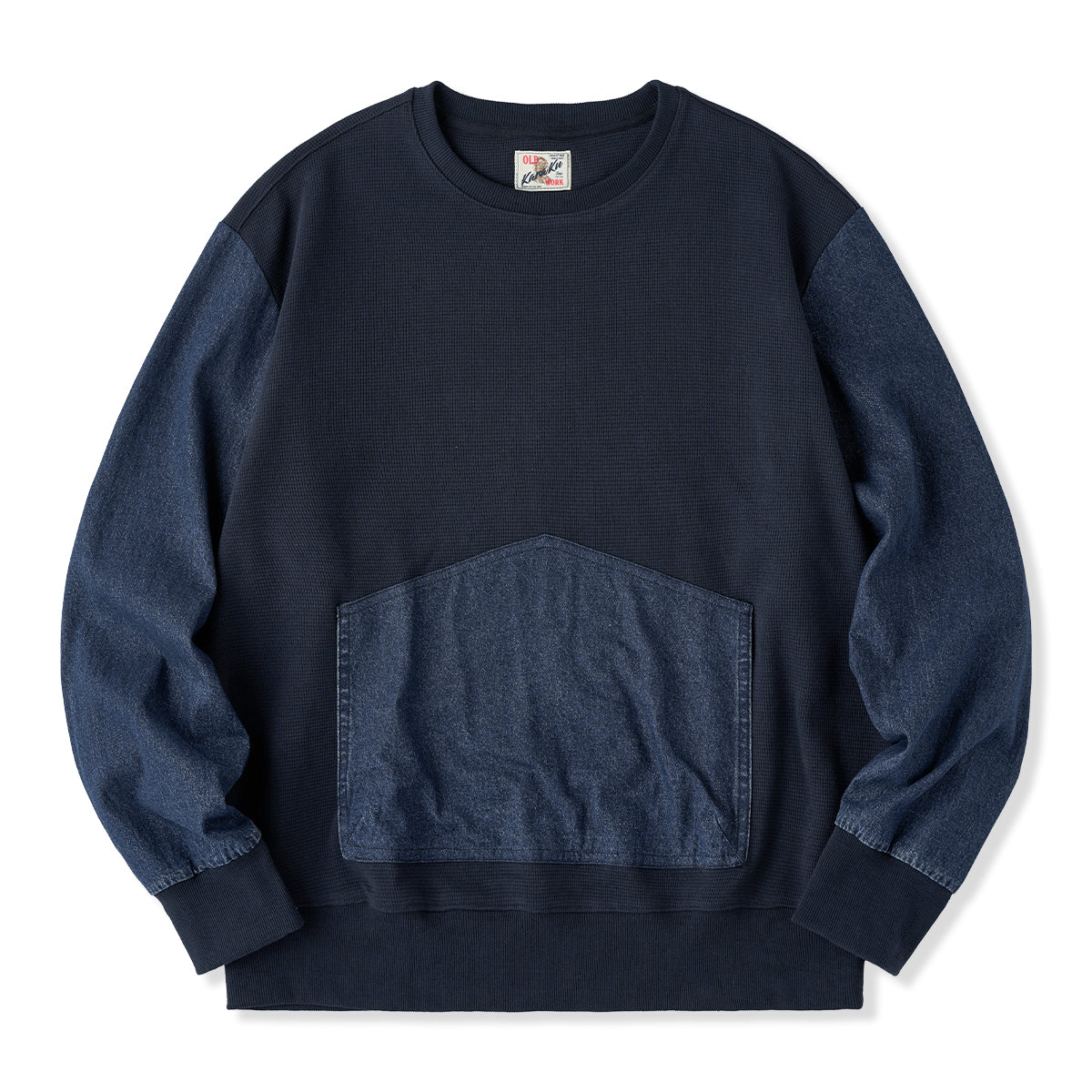 워싱 데님과 와플 원단을 조합한 풀오버 스웨트셔츠로, 대형 캥거루 포켓과 크루넥 디자인이 캐주얼한 매력을 더합니다.