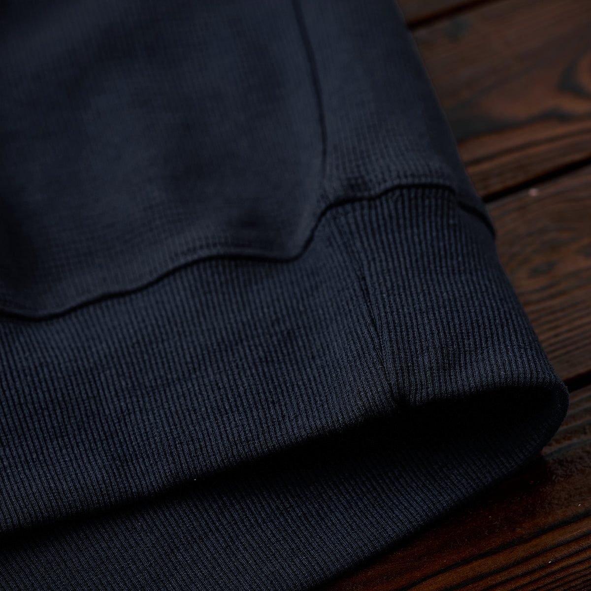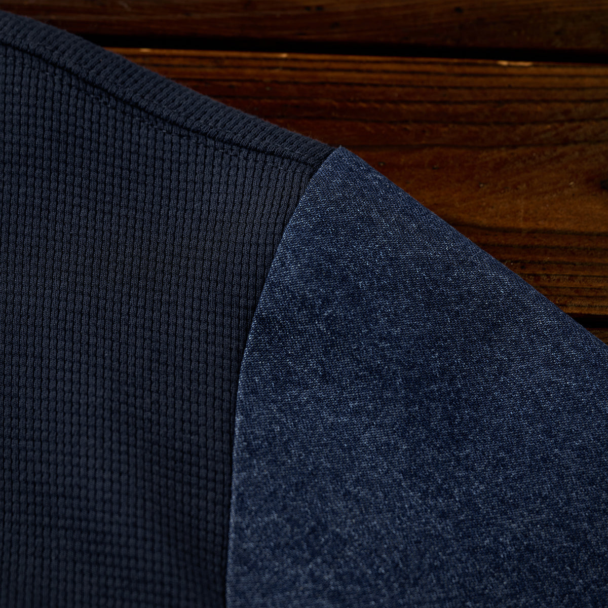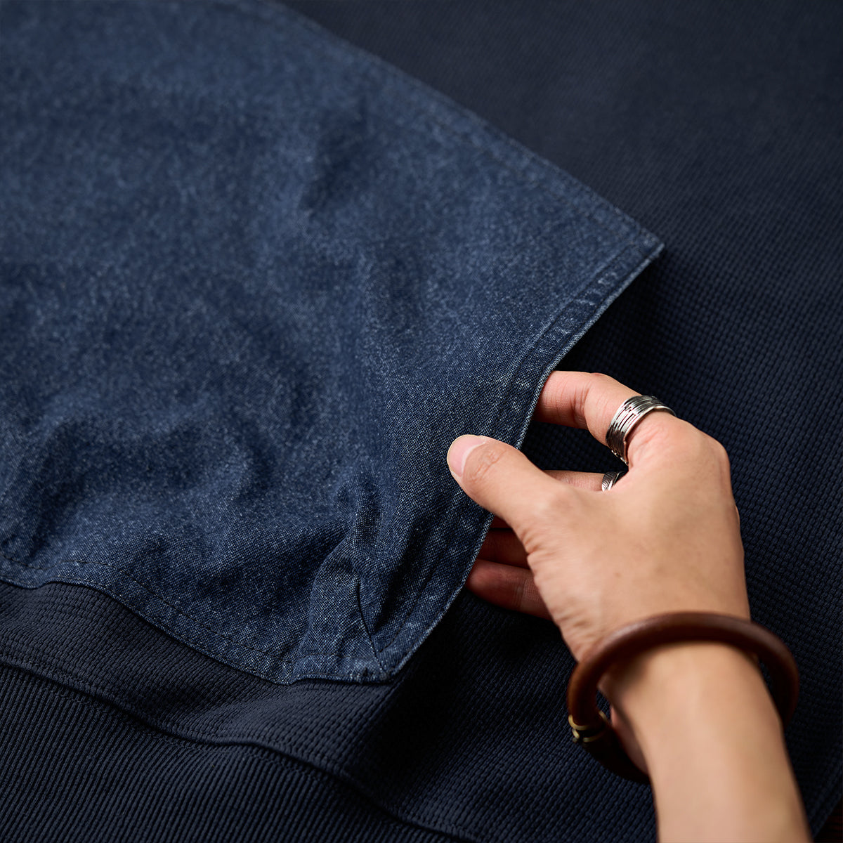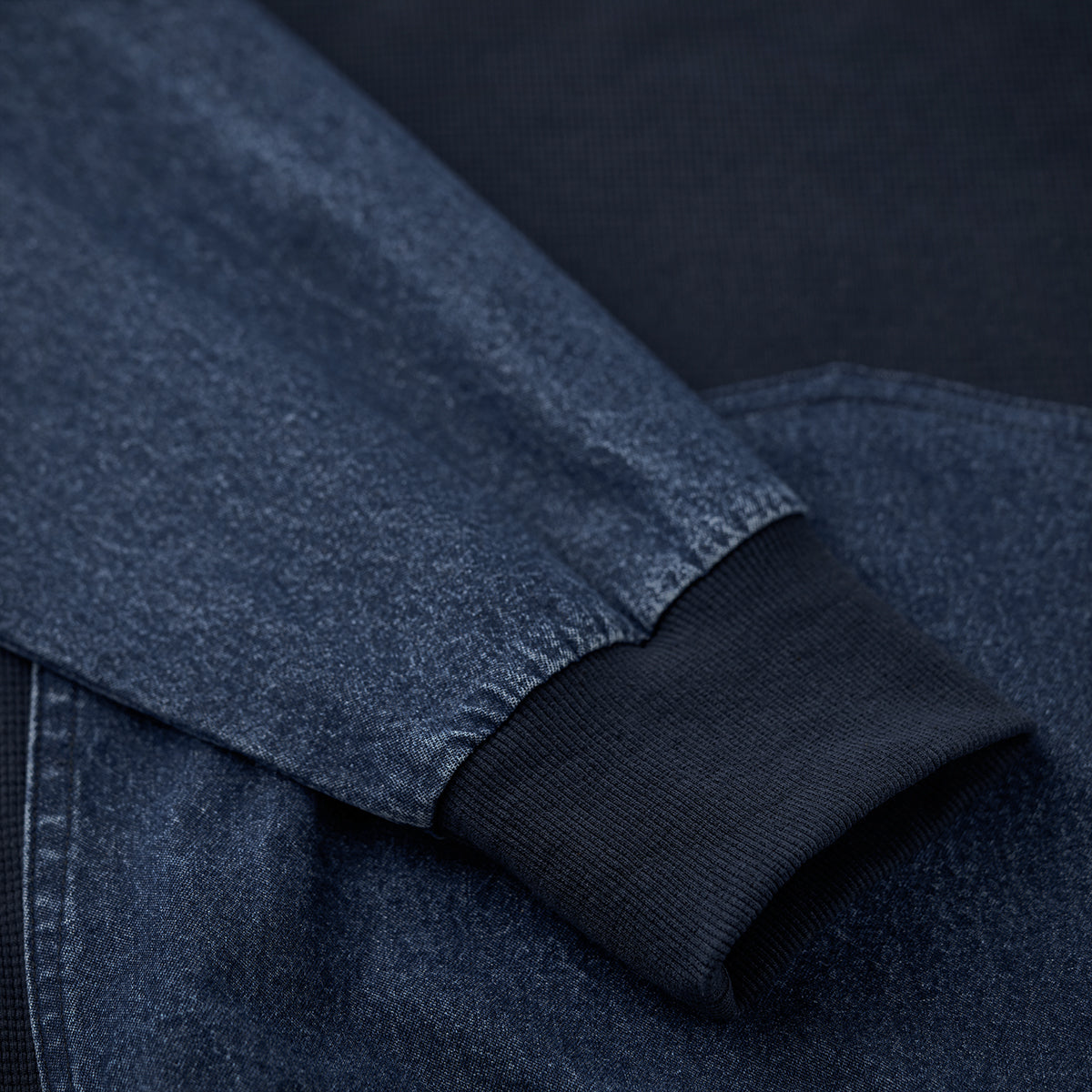 소매와 캥거루 포켓에는 워싱 데님을, 바디에는 입체감과 통기성이 뛰어난 와플 스웨트 원단을 사용했습니다.