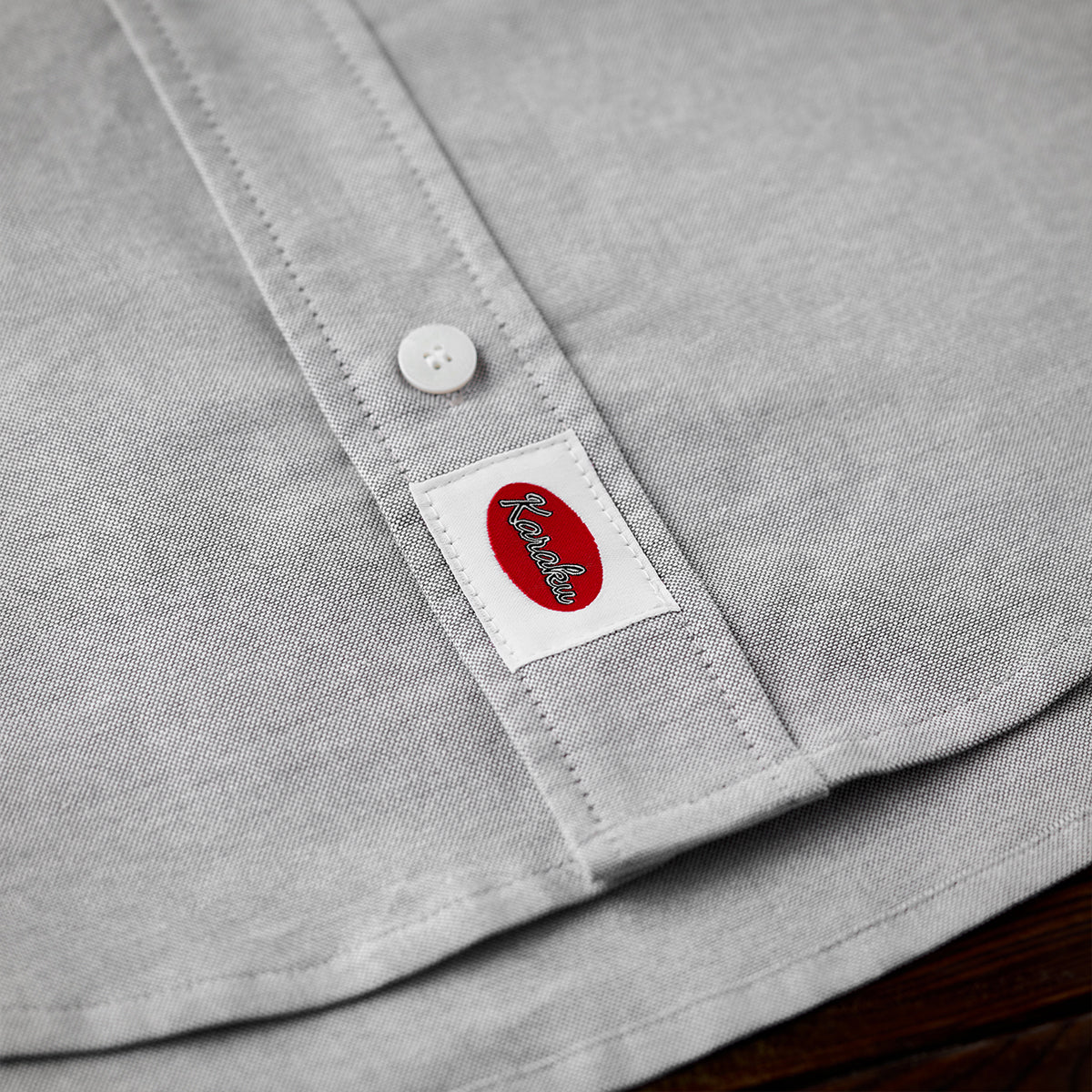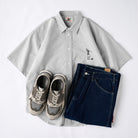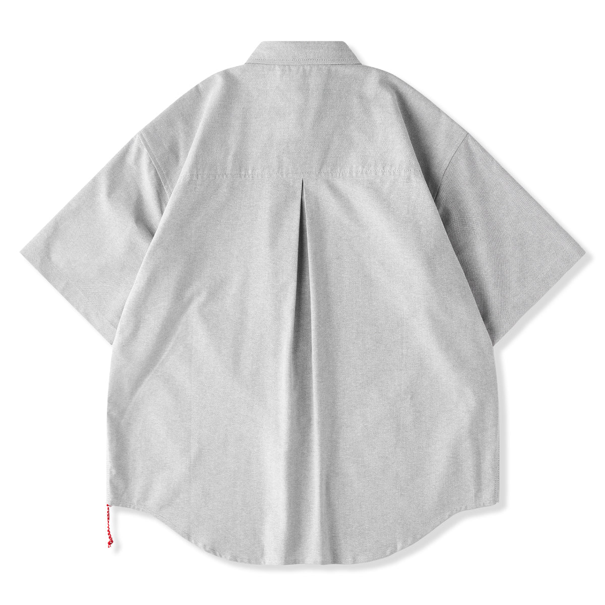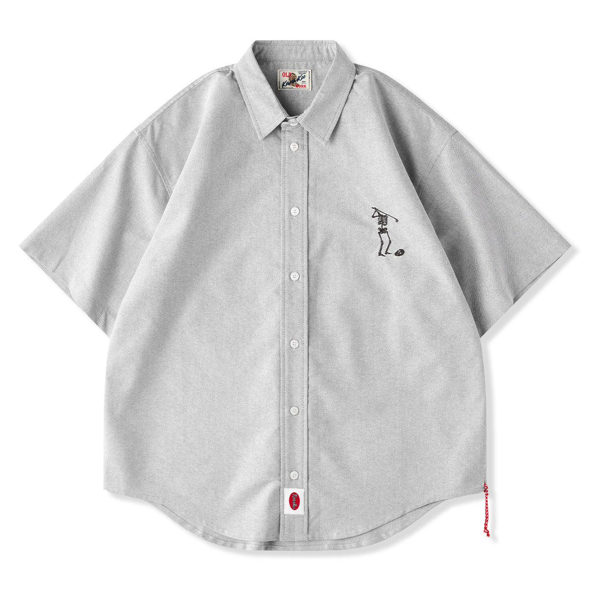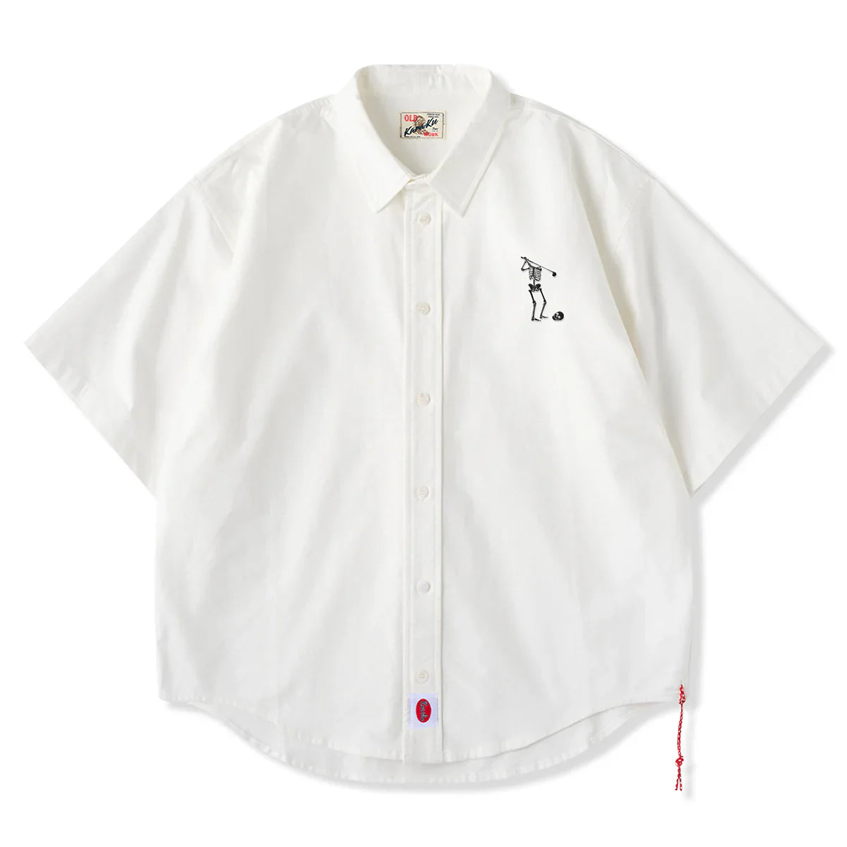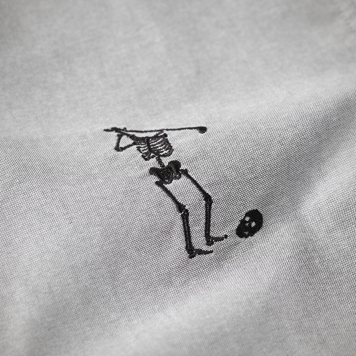 왼쪽 가슴에 골프 스윙을 하다 목이 분리된 해골 자수가 특징이며, 밑단의 빨간 끈과 앞뒤 길이 차이 헴라인이 포인트인 캐주얼 셔츠입니다.