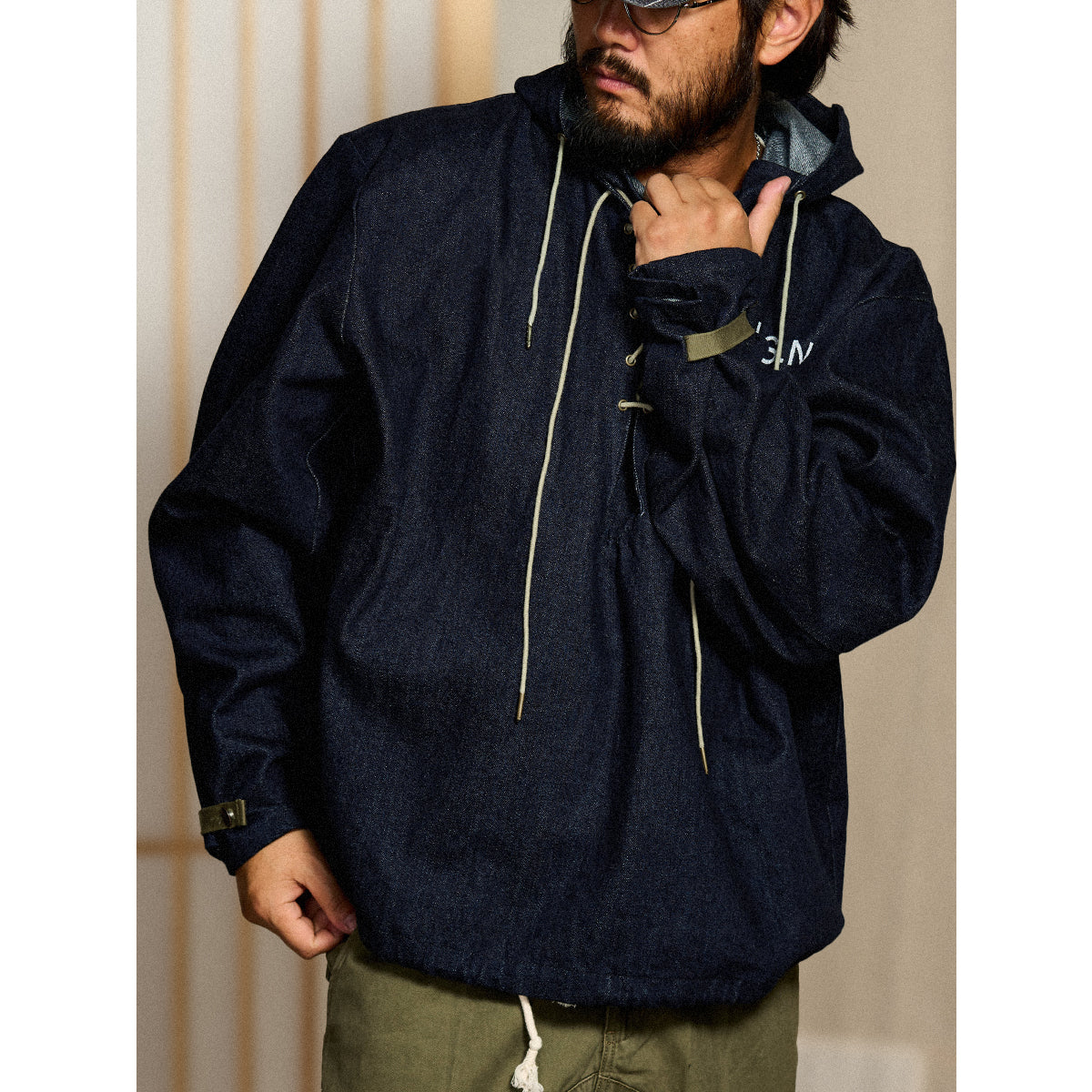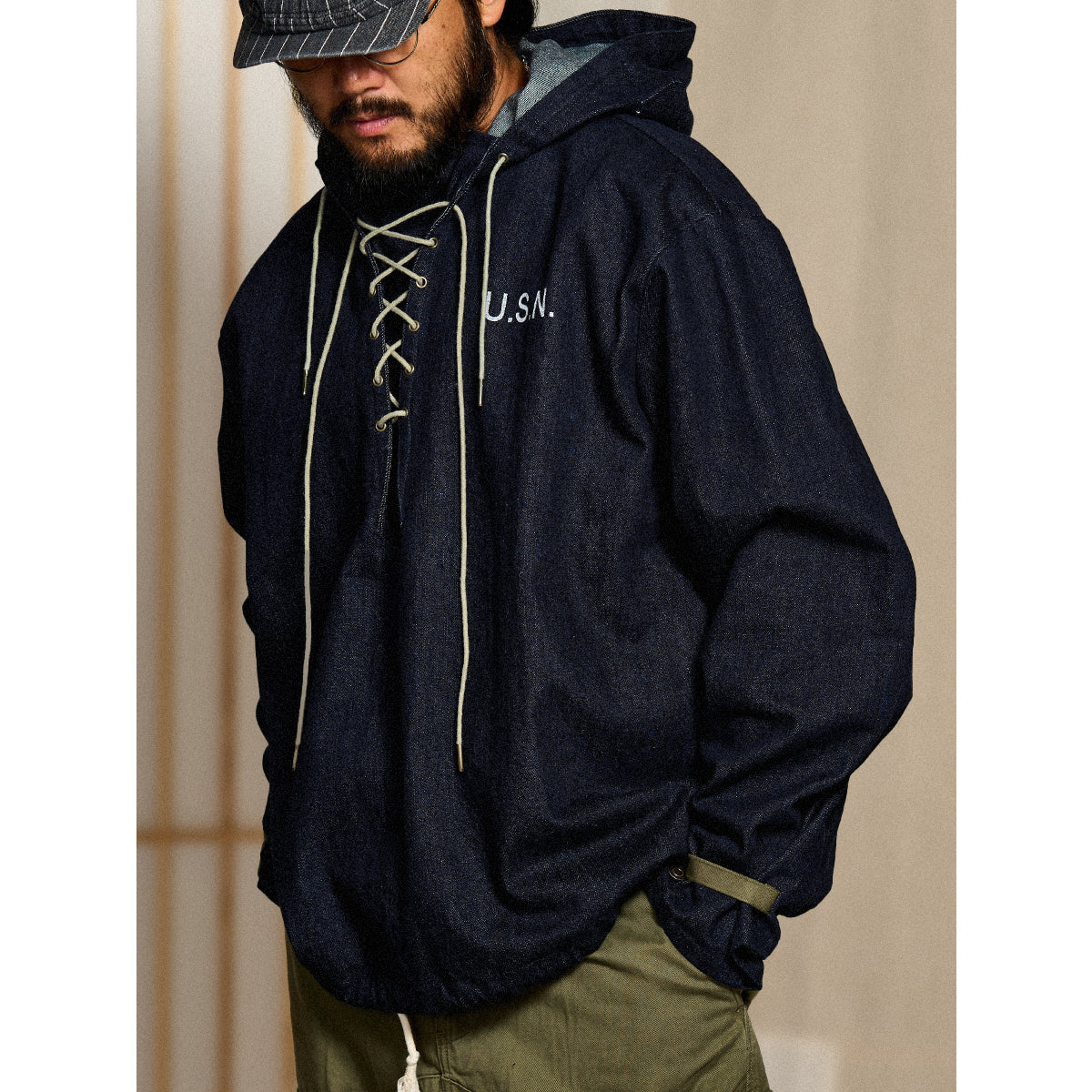 데님으로 재해석한 1940년대 미군 덱 파카. 배색 스트링과 빈티지 무드가 돋보이며, 착용할수록 매력이 더해집니다.