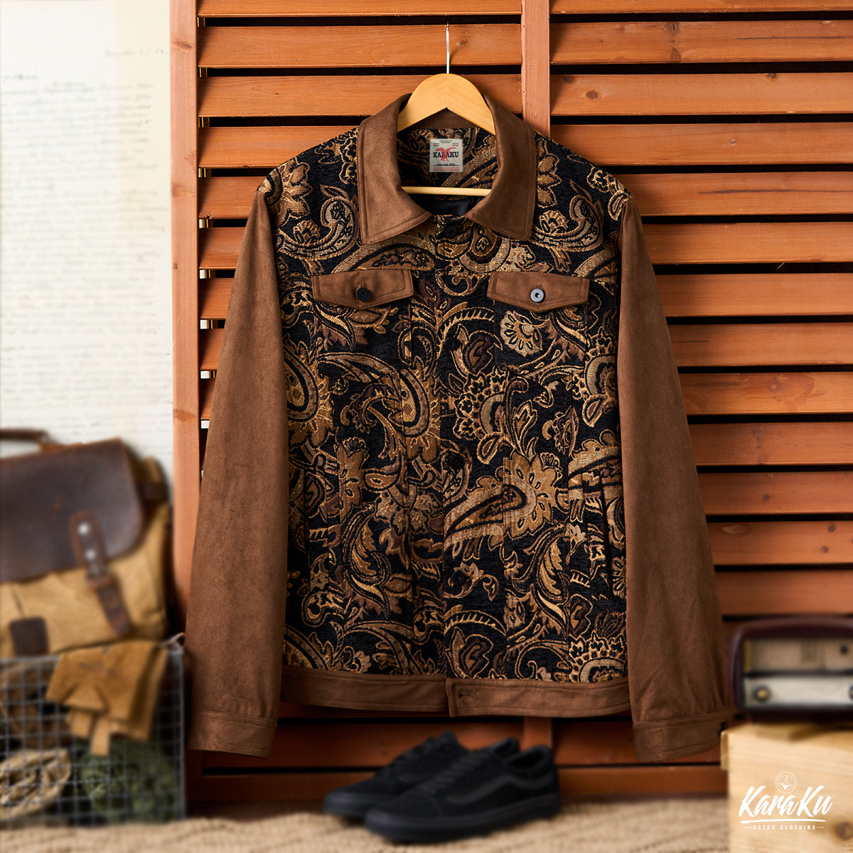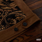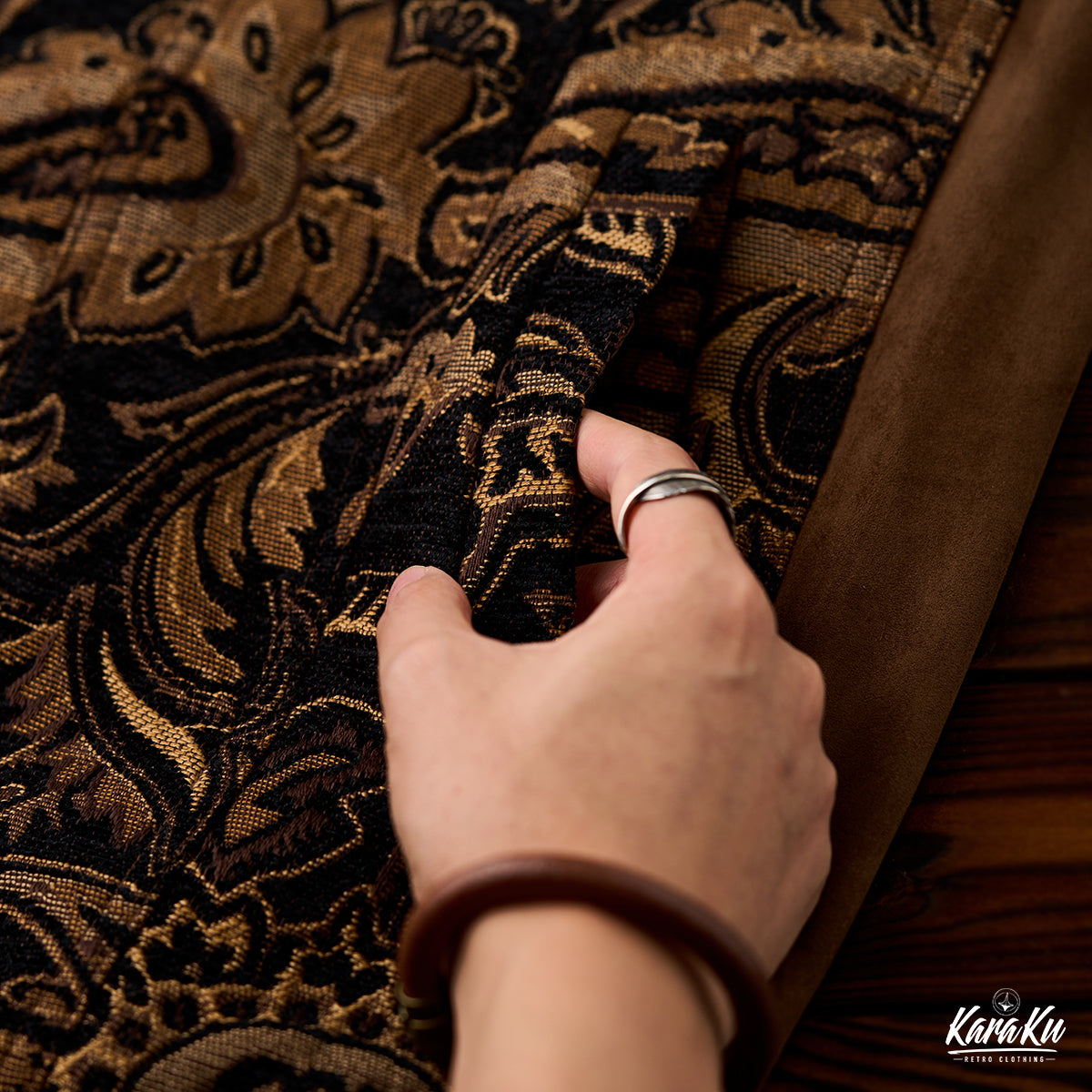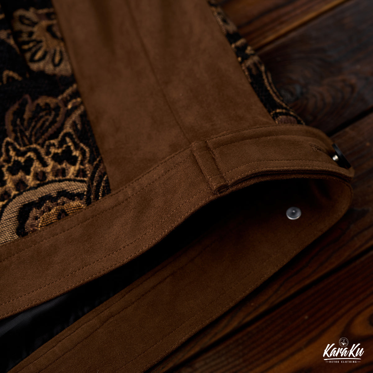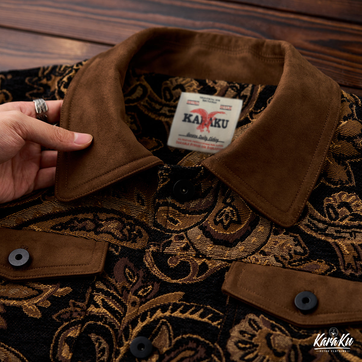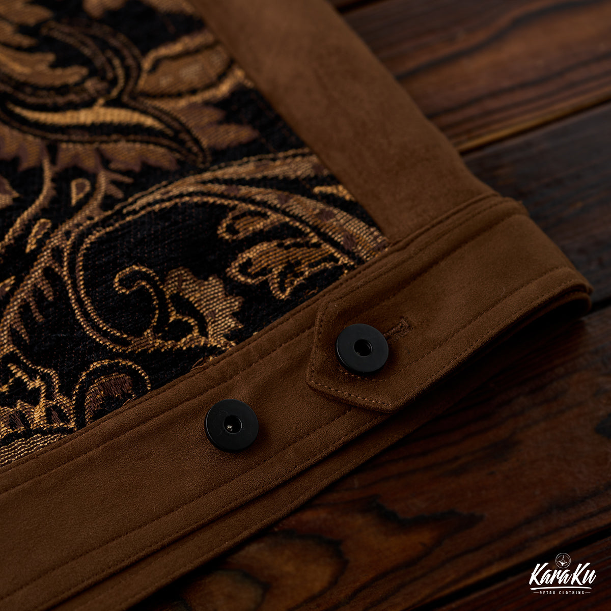 This classic western style paisley jacquard chenille and suede jacket has a luxurious texture and vintage feel that goes well with a variety of styles.