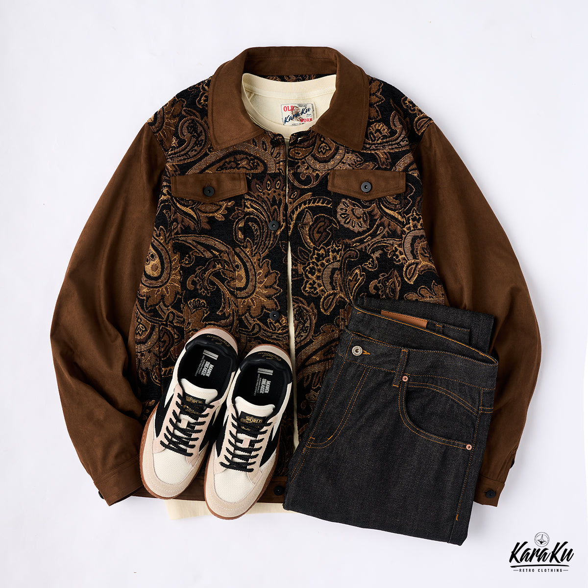 This jacket expresses a classic Western style with a combination of paisley jacquard chenille and suede materials. It creates a vintage yet sophisticated atmosphere.