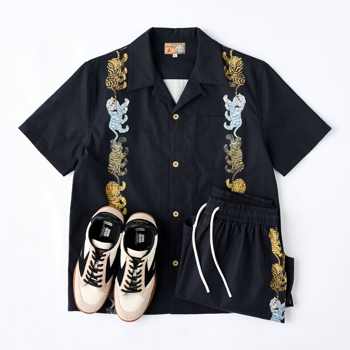 These Aloha shirts feature a bold "Sanho-ryeol (three tigers lined up)" motif arranged vertically. This item was jointly produced by KaraKu and Ayako Ishiguro, and a total of 11 products were produced with the theme of monsters and imaginary creatures.