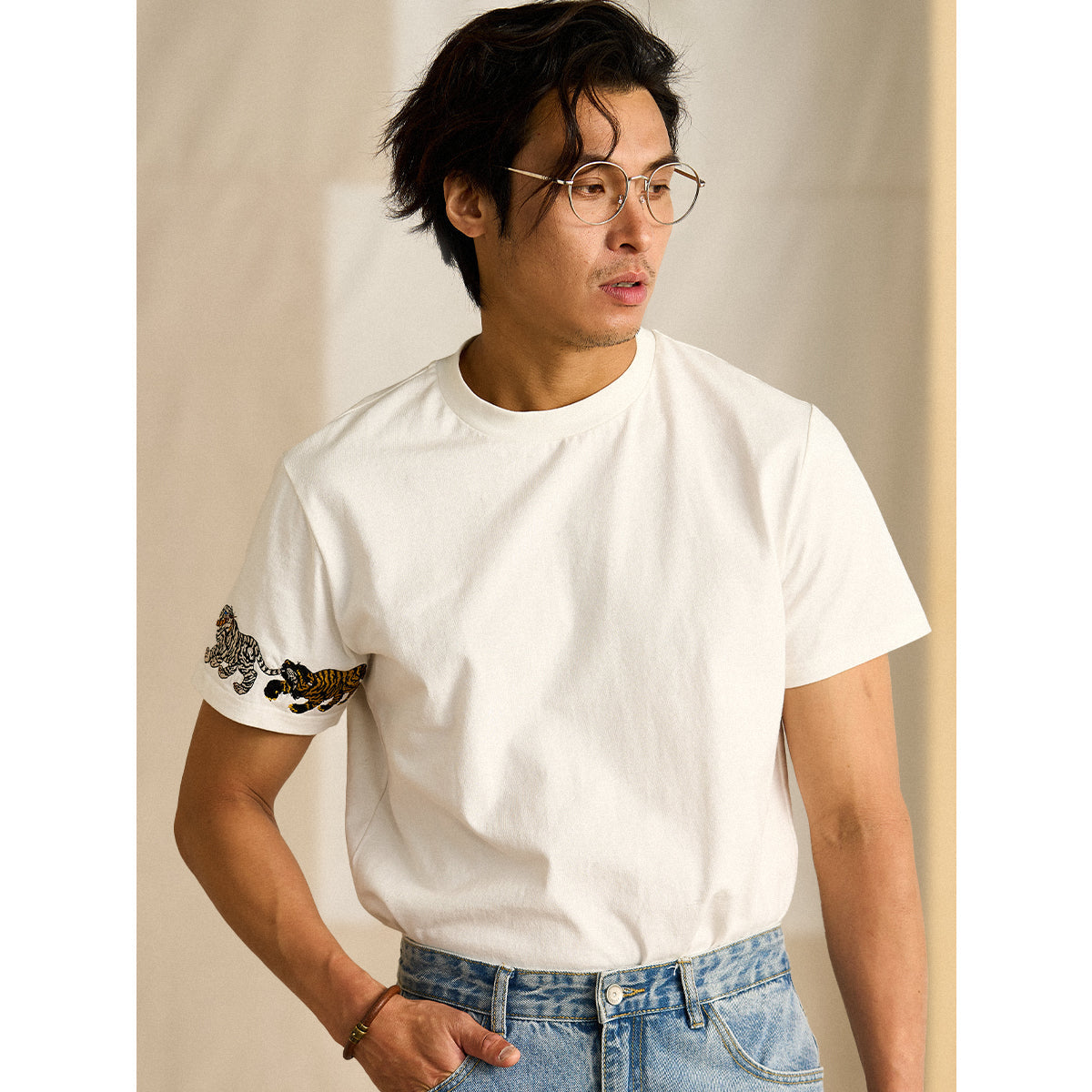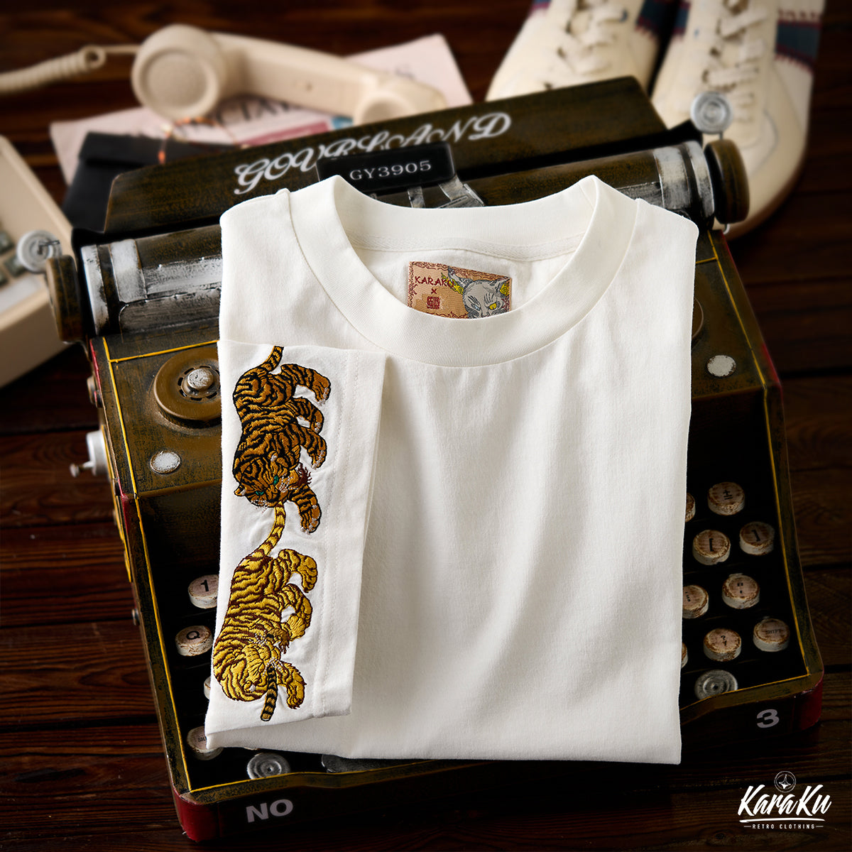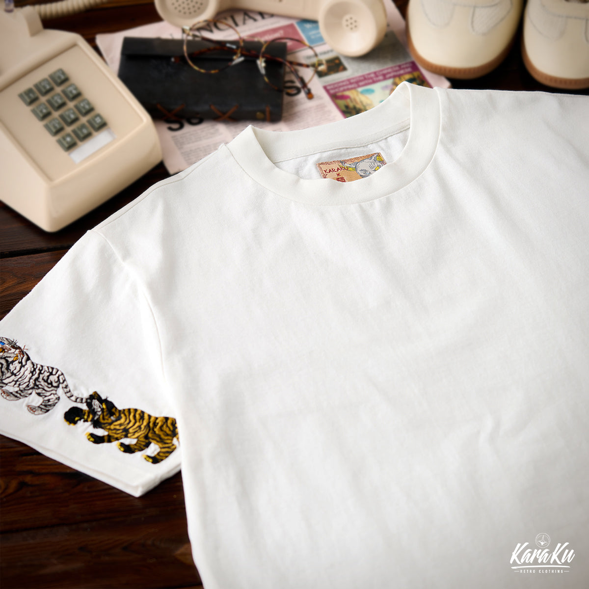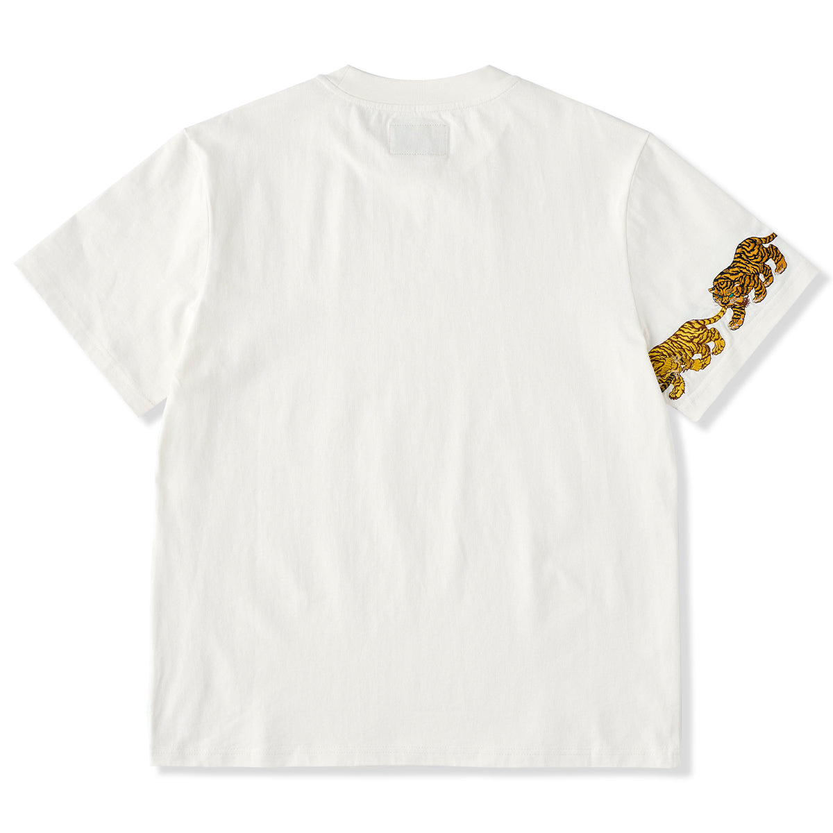 KARAKU x Yasato Ishiguro "Tail-wagging Tiger Procession" Sleeve Embroidered Cotton T-shirt