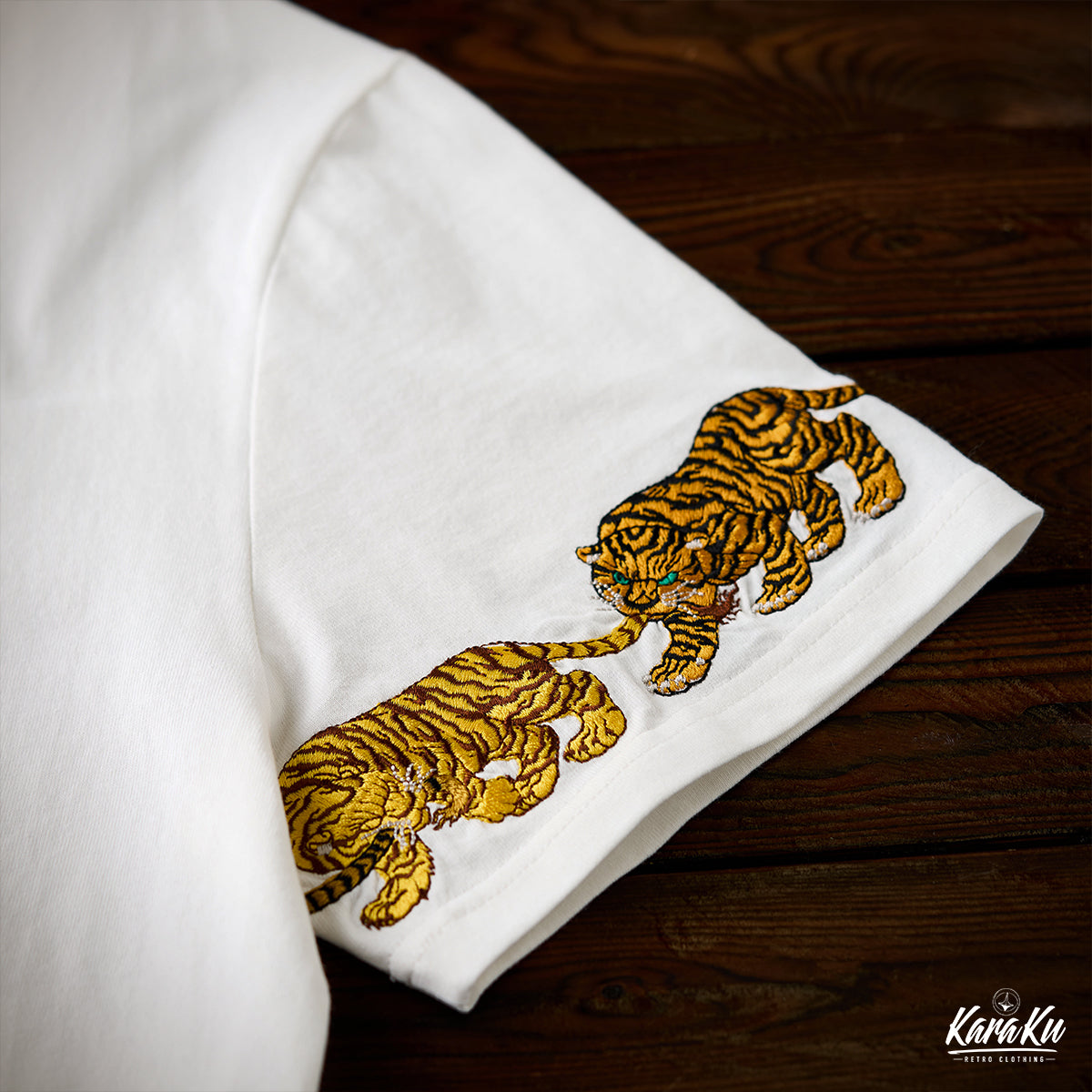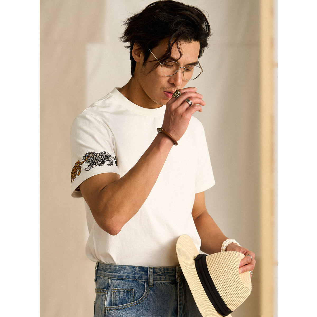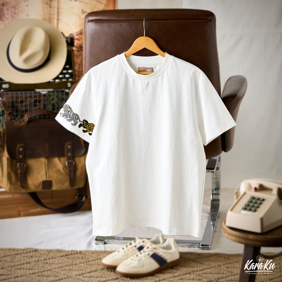KARAKU x Yasato Ishiguro "Tail-wagging Tiger Procession" Sleeve Embroidered Cotton T-shirt