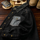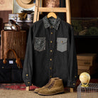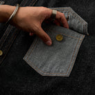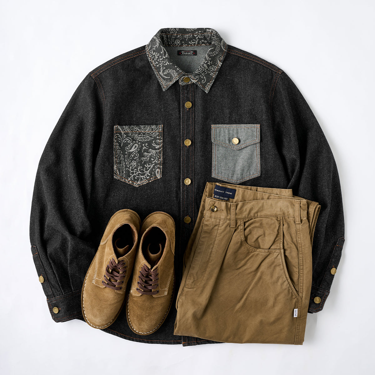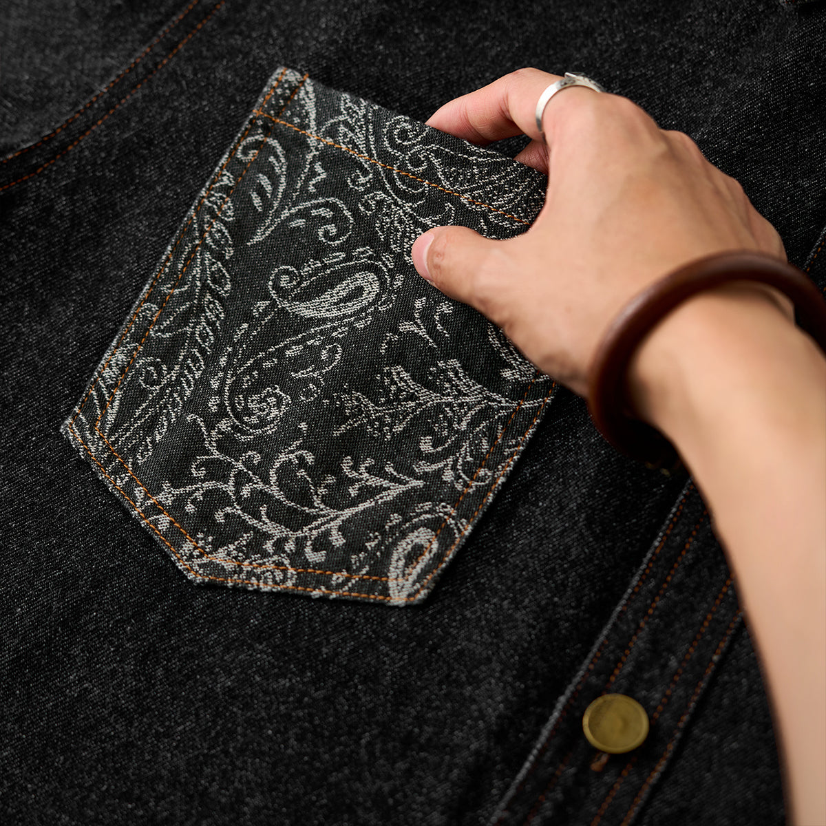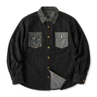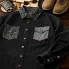 페이즐리 자카드 포켓과 무지 데님 포켓의 비대칭 디자인으로 특별한 감각을 주는 셔츠. 브라운 스티치와 금속 버튼이 포인트를 더합니다.