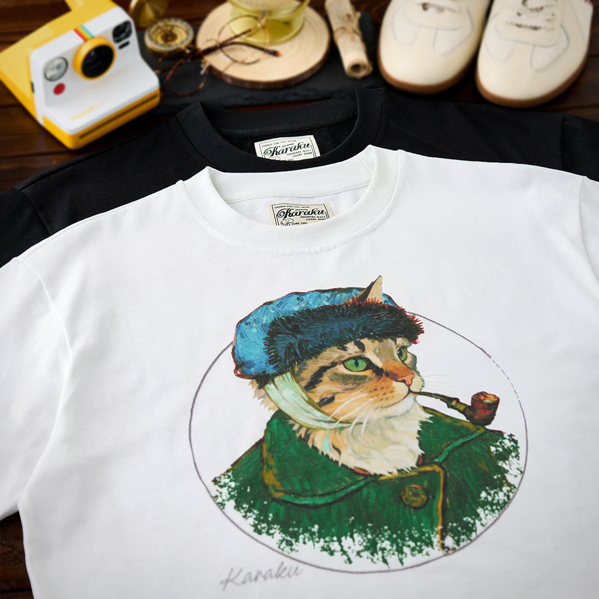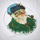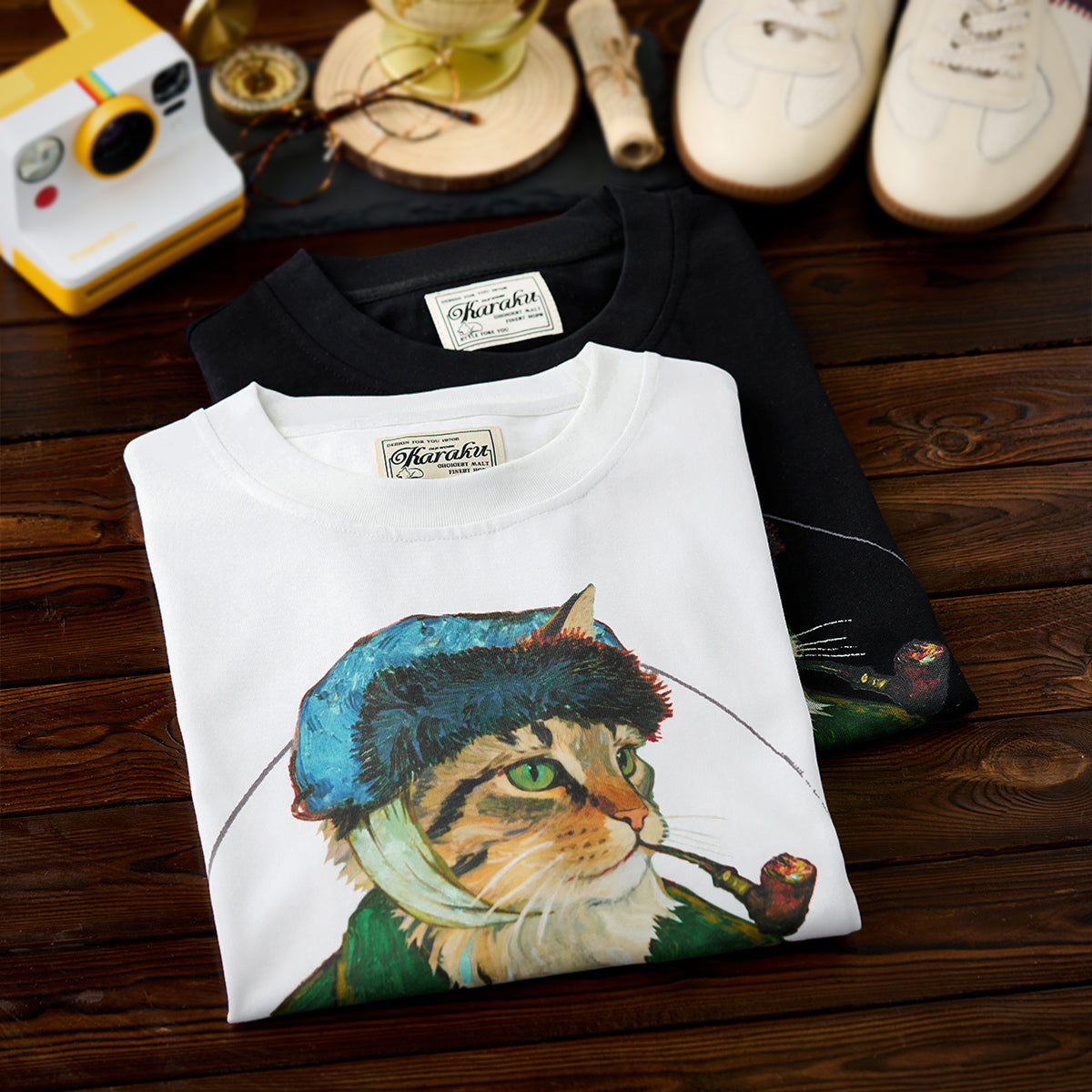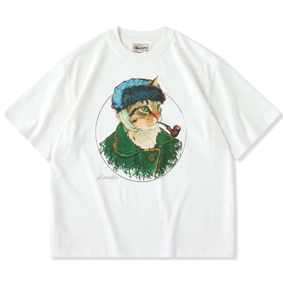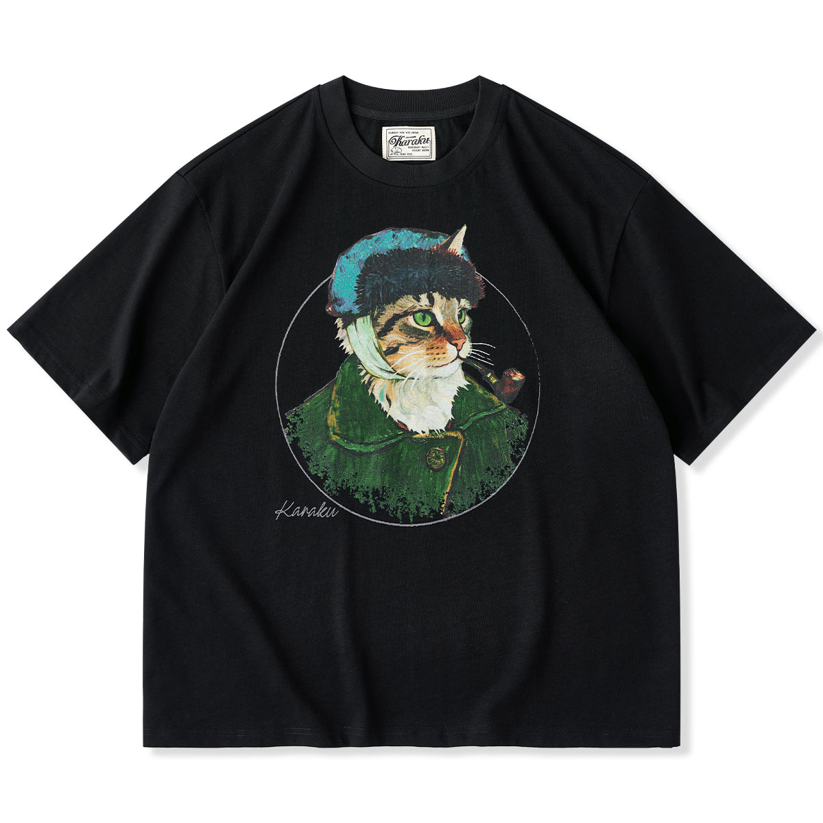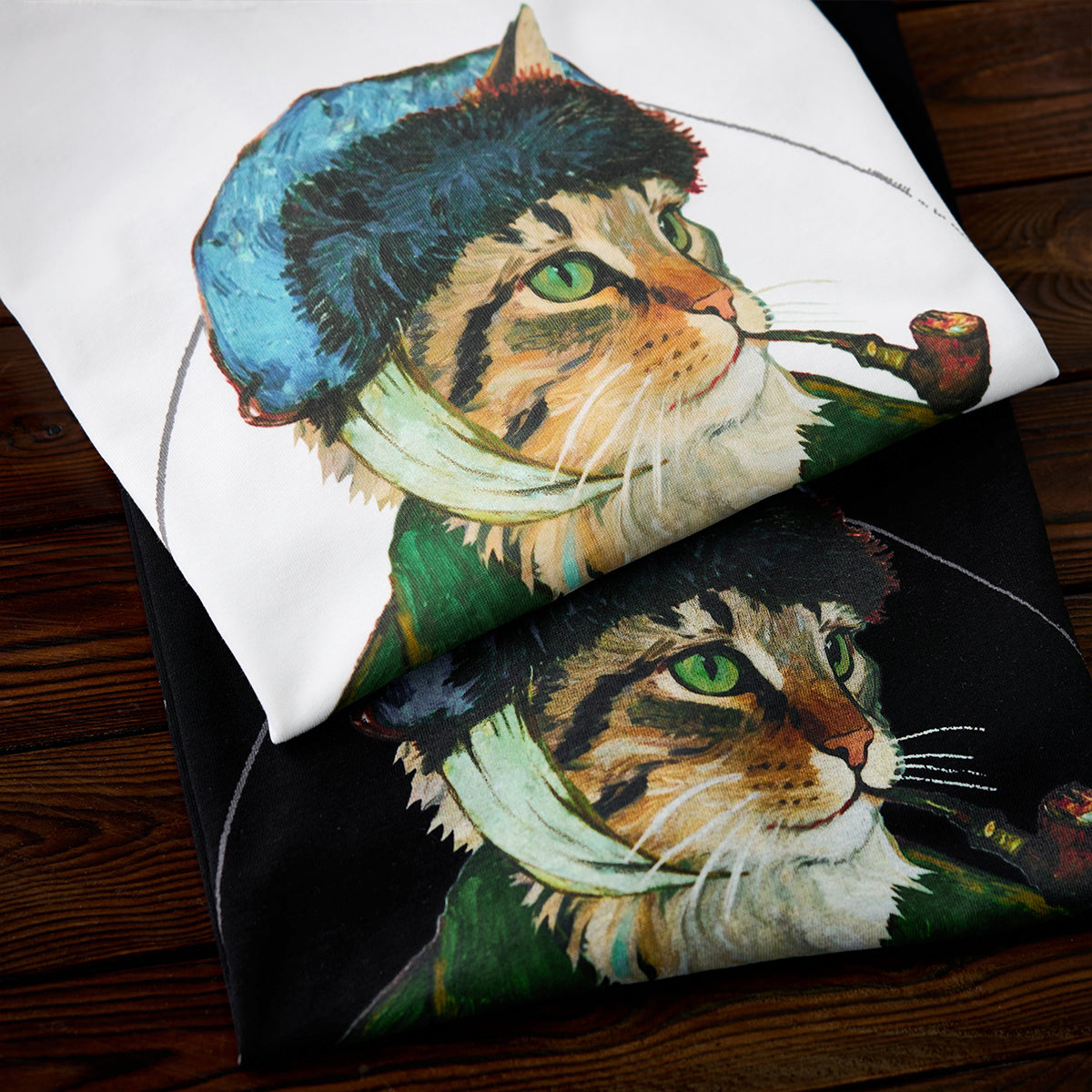반 고흐의 자화상을 오마주해 고양이로 재해석한 패러디 일러스트가 돋보이는 티셔츠로, 예술성과 대중성이 어우러진 현대적 감각의 디자인입니다.