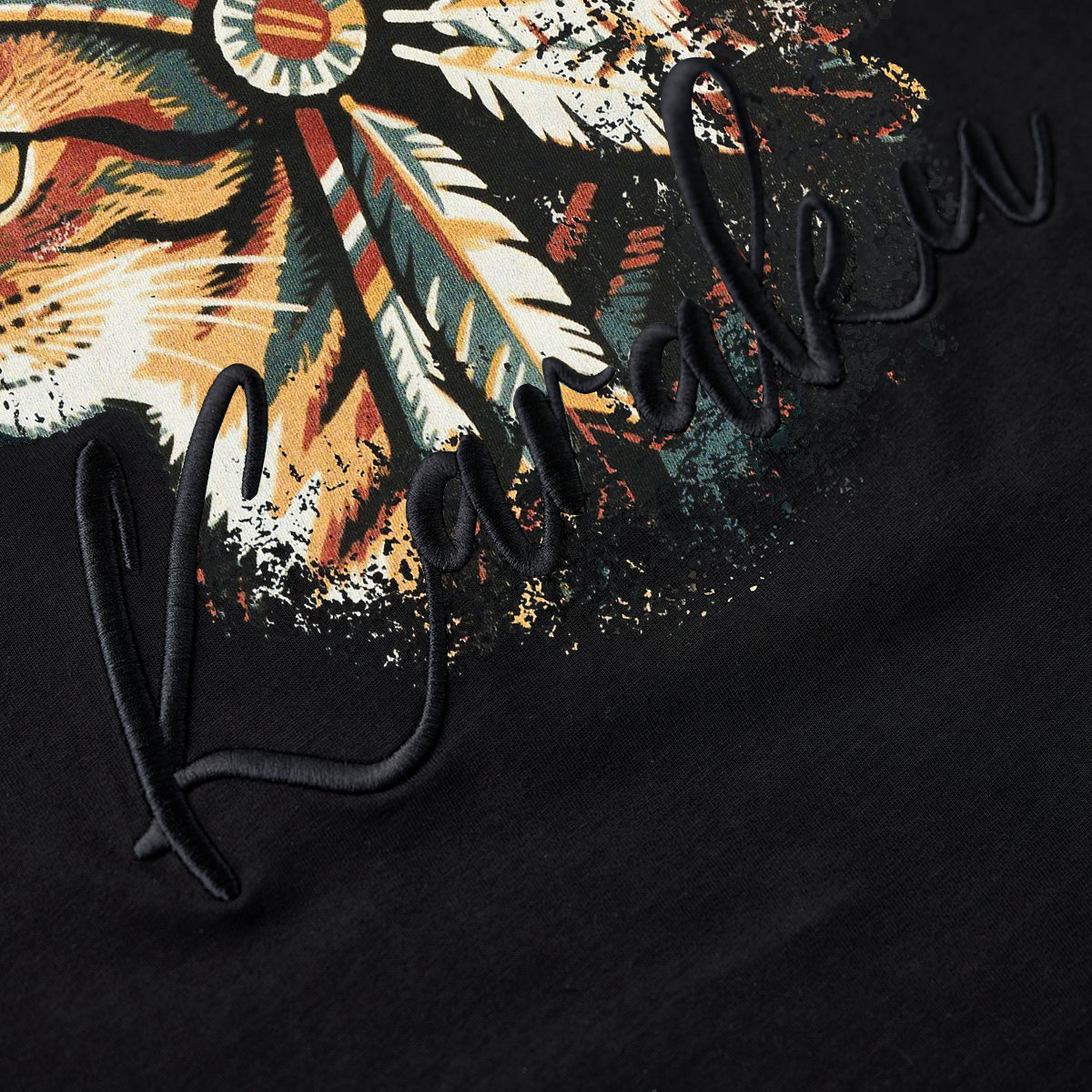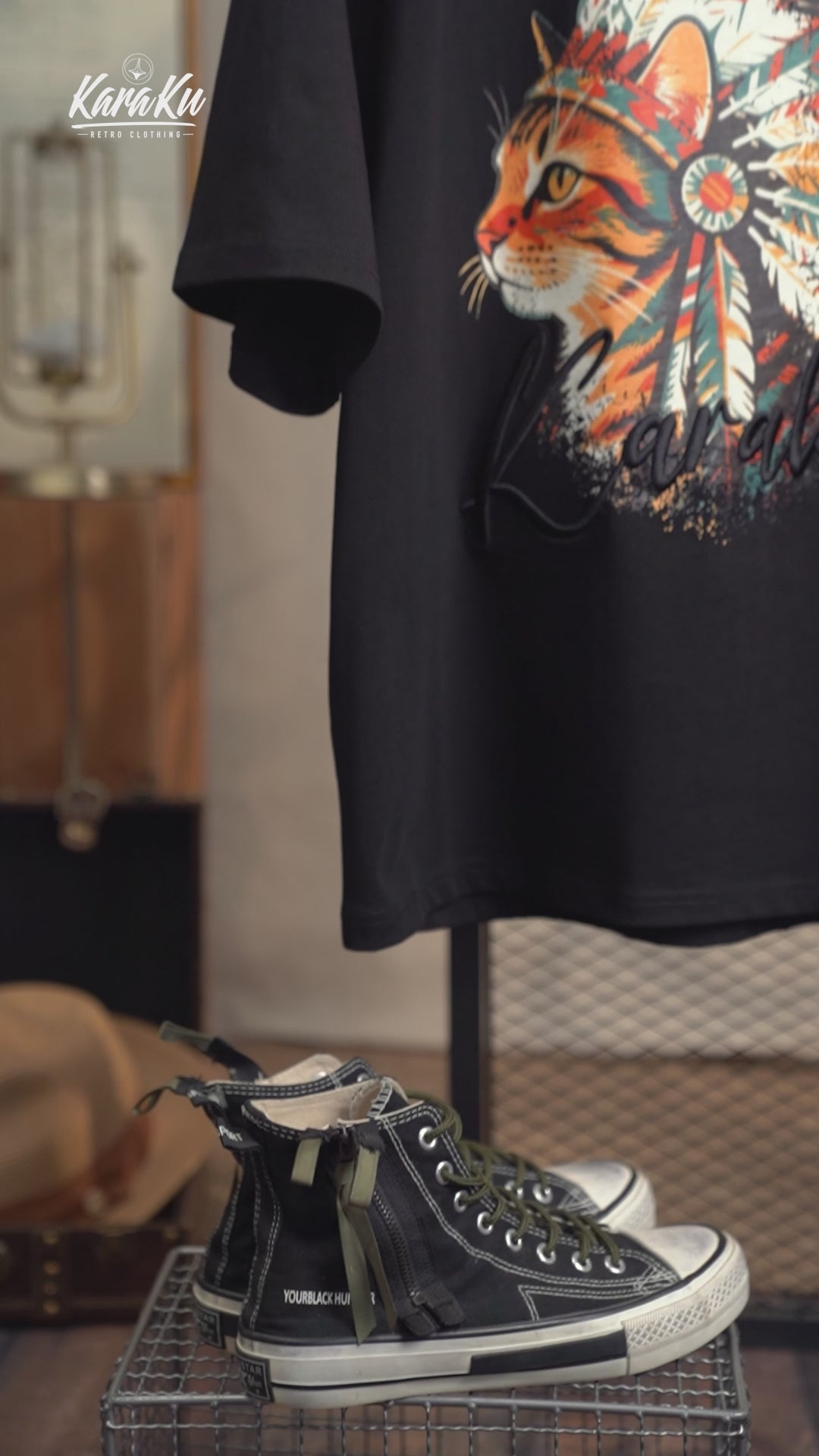 앞면에는 인디언 추장 깃털 장식을 한 ‘고양이’의 대담한 프린트가 있어, 자신감 있으면서도 진정한 표정이 눈길을 사로잡습니다.
