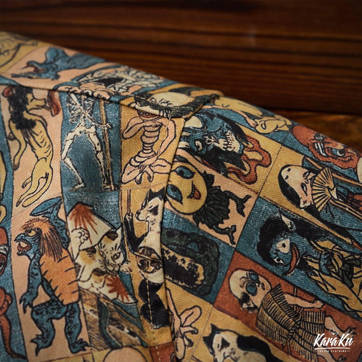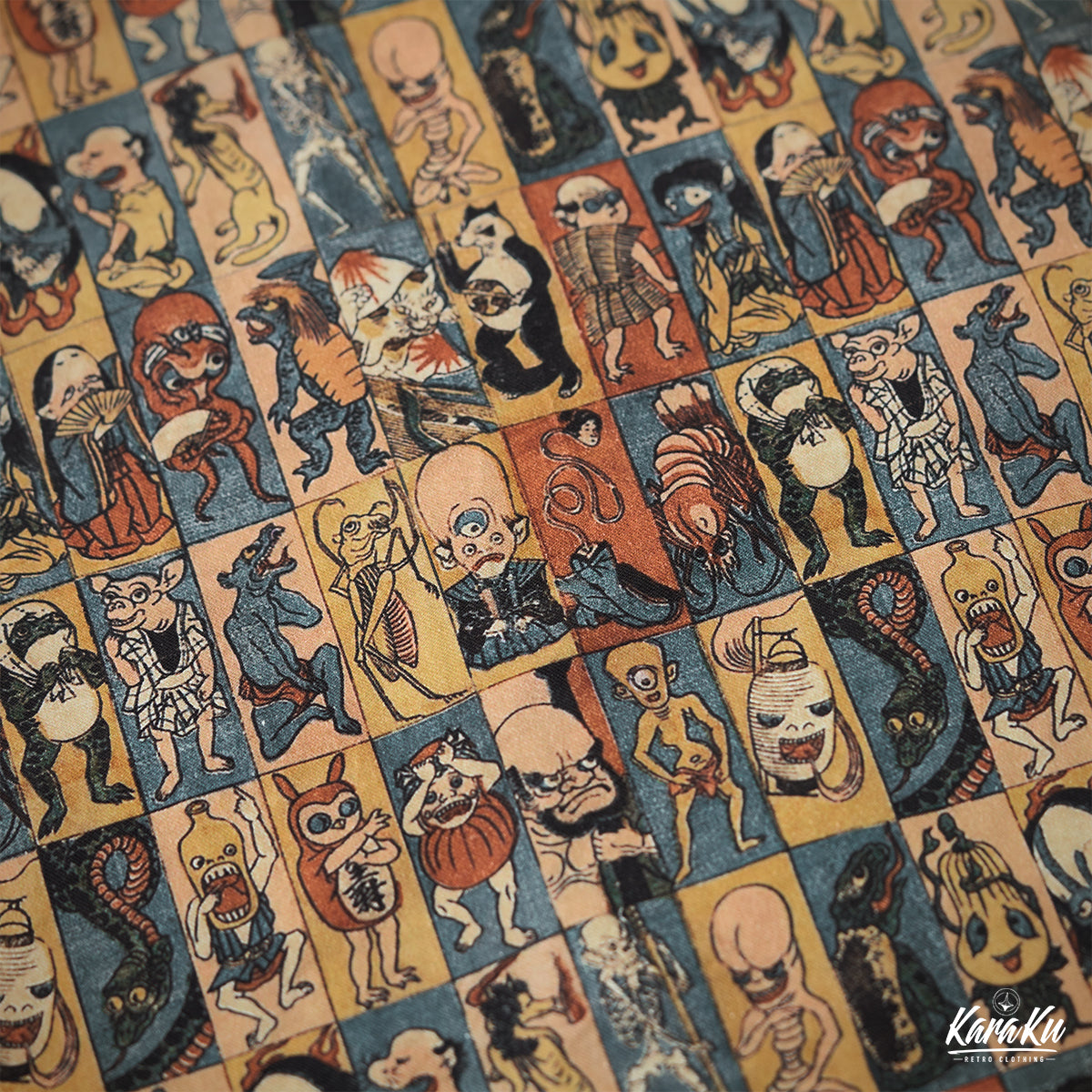 A design that captures the classic Japanese aesthetic with a uniform size and muted colors. The motifs of traditional Yokai are individually arranged, and the high-quality cotton material provides durability and softness. It is an ideal casual item for those interested in Japanese culture and those who love unique designs.