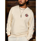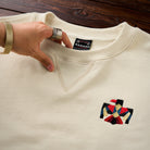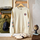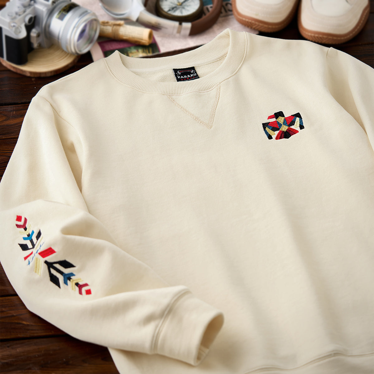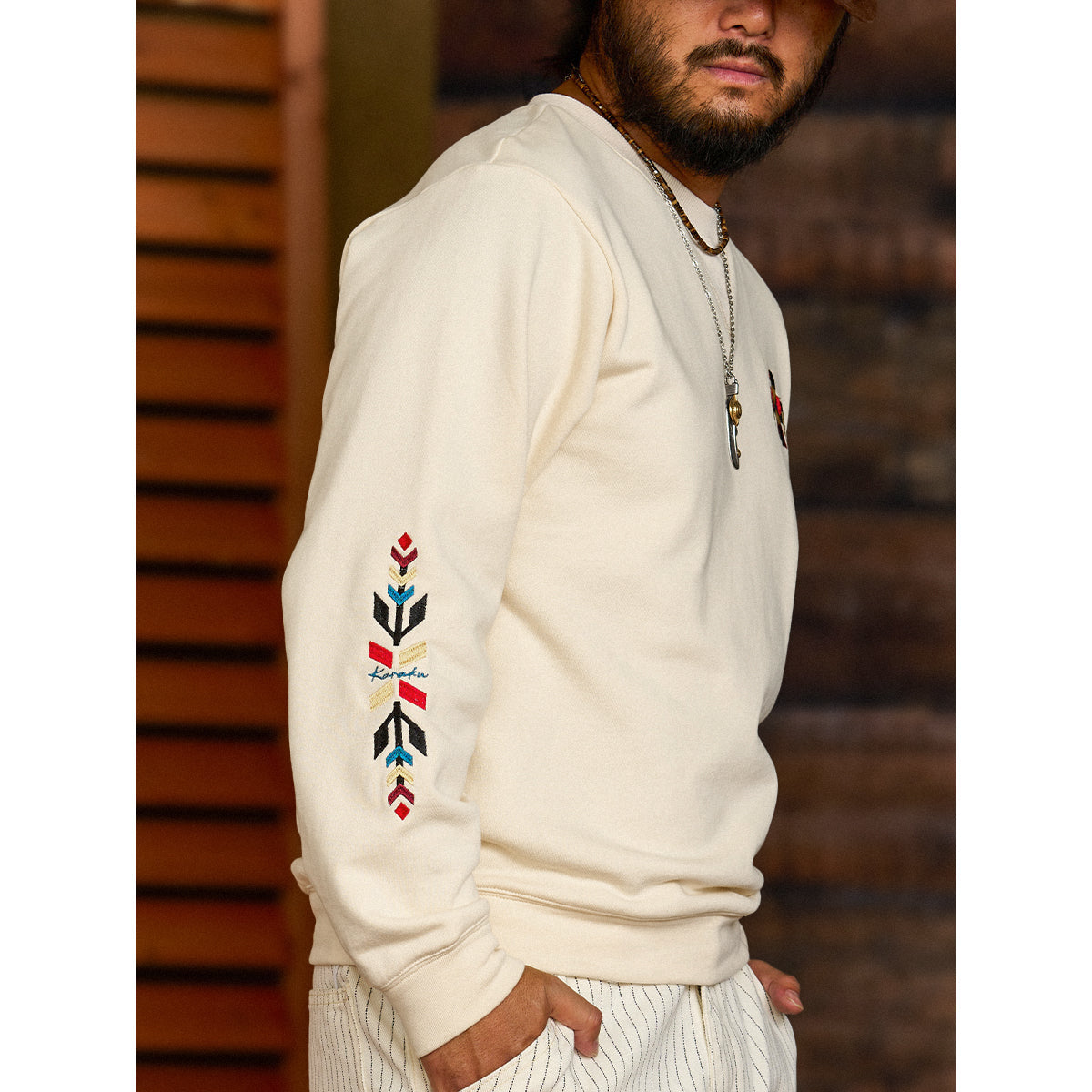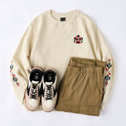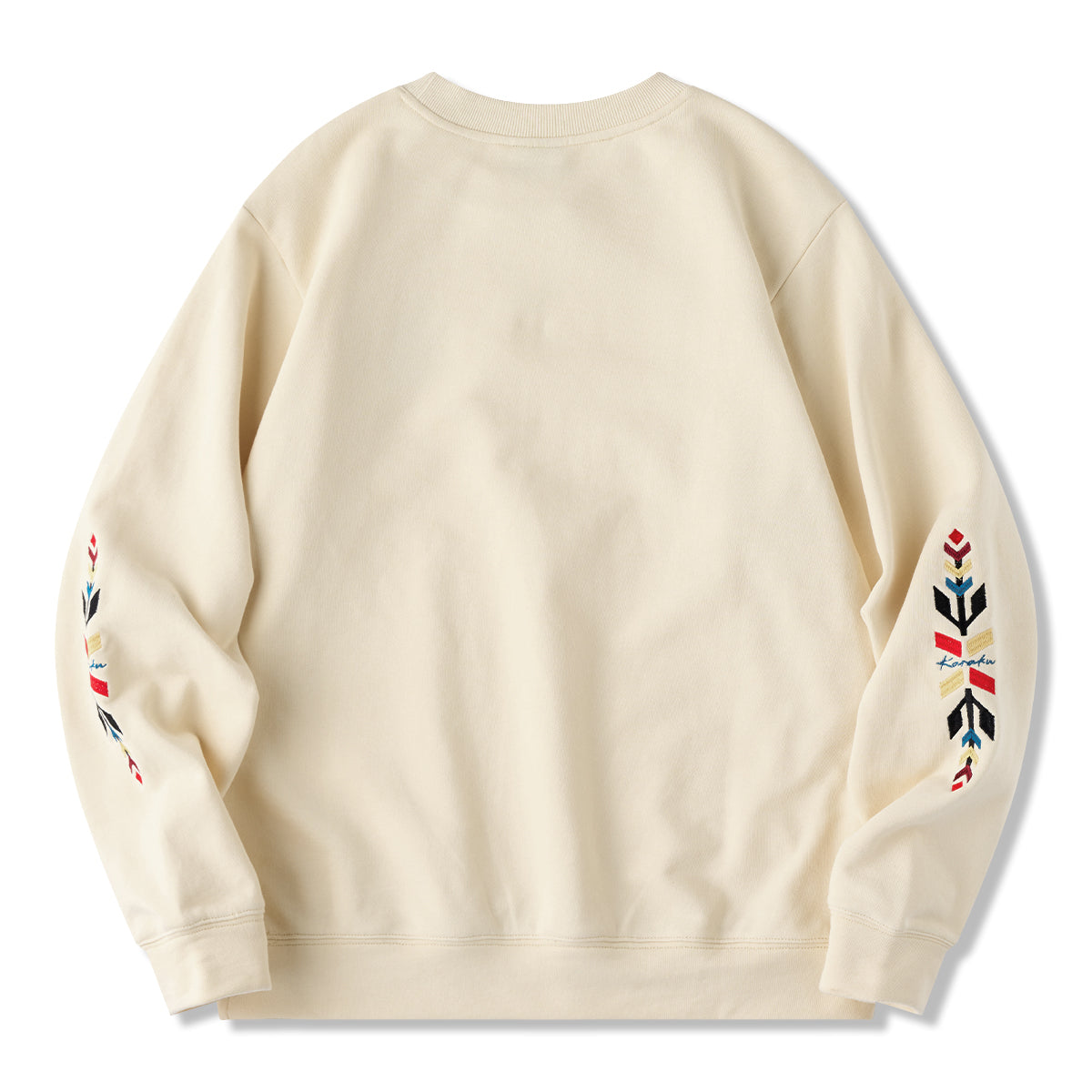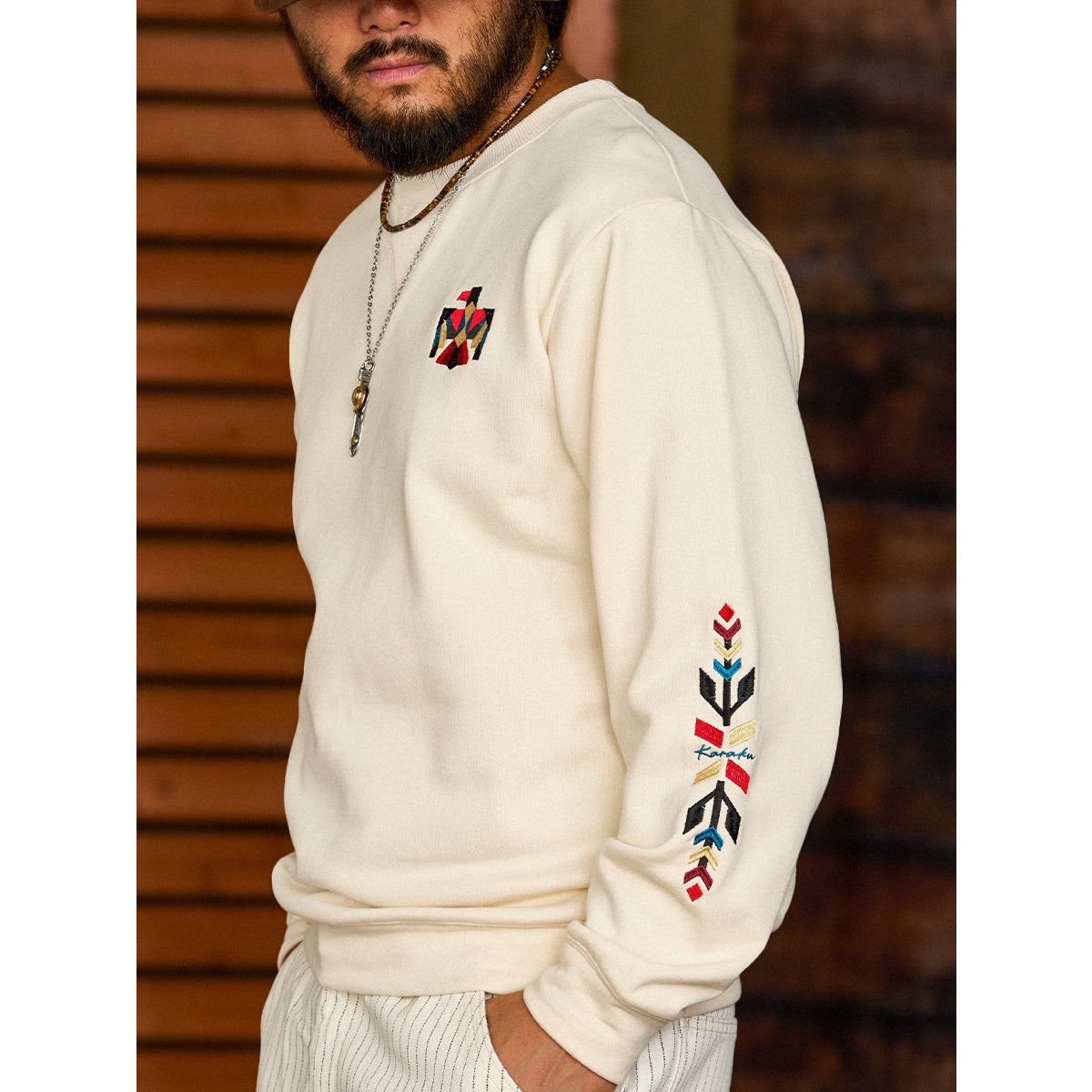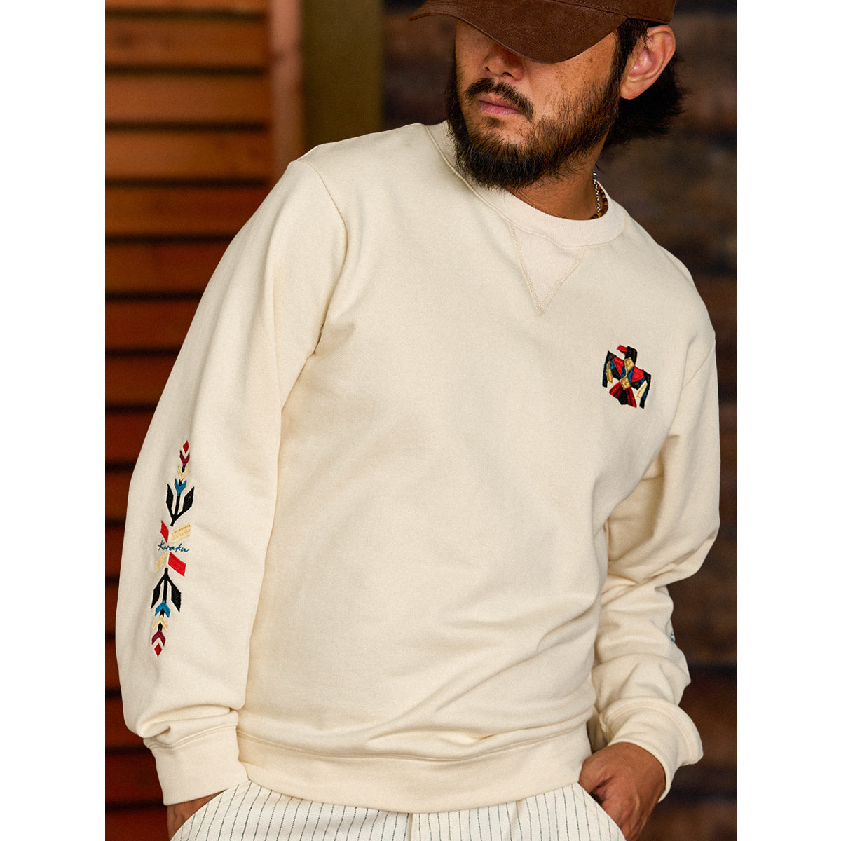 썬더버드와 나바호 패턴 자수로 강렬한 인상을 주는 스웨트셔츠. 입체 자수와 V거젯 디테일, 두툼한 립 마감으로 빈티지 감성과 스포티한 무드를 조화롭게 담아냈습니다.