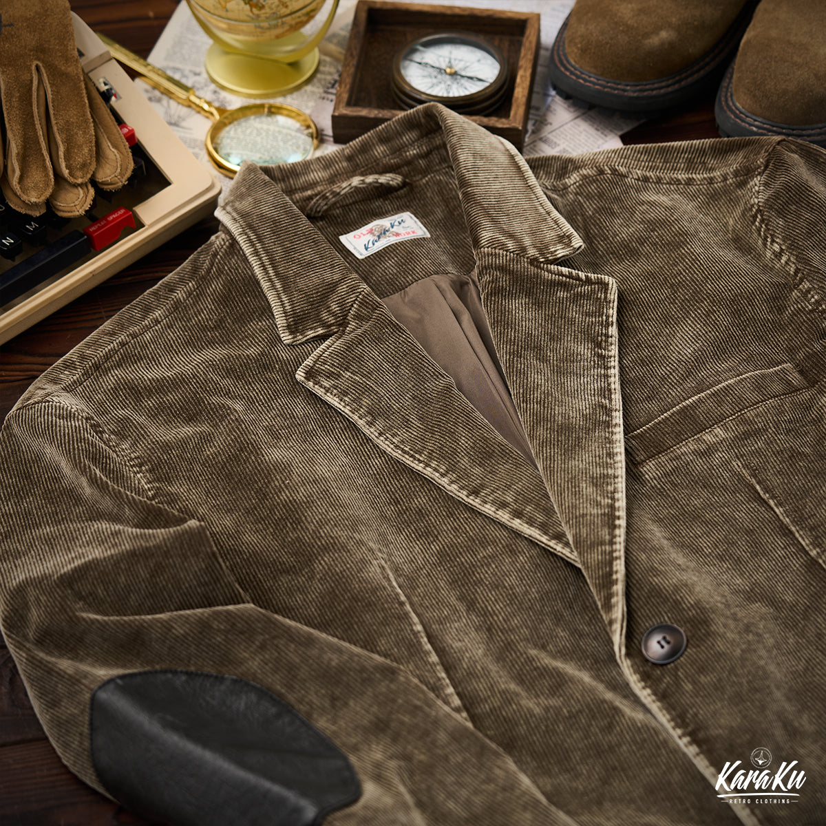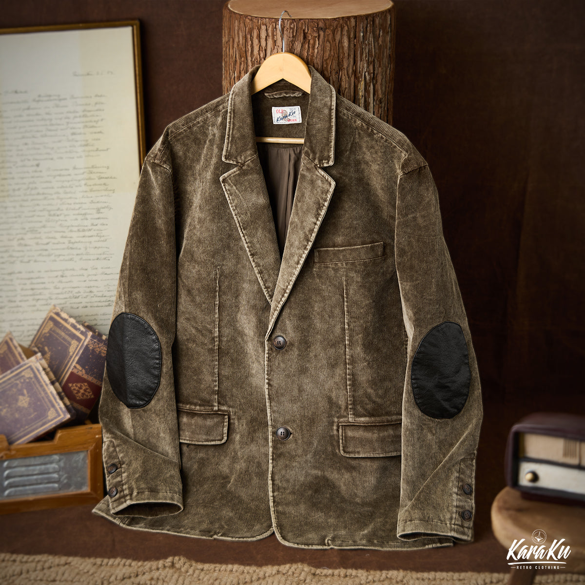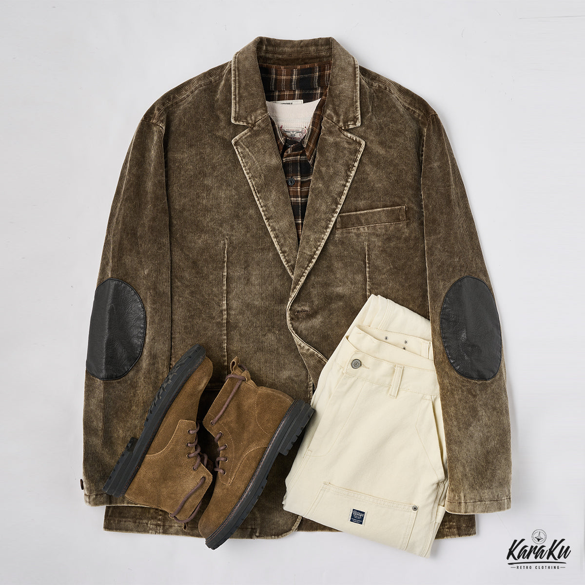 The washed corduroy tailored jacket has a luxurious feel, featuring leather patches and a simple design. It is suitable for fall and winter, and can be worn with both casual and semi-formal styles.
