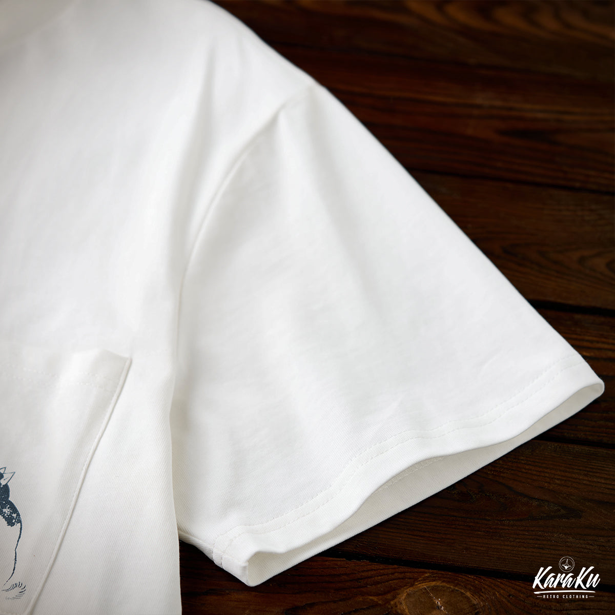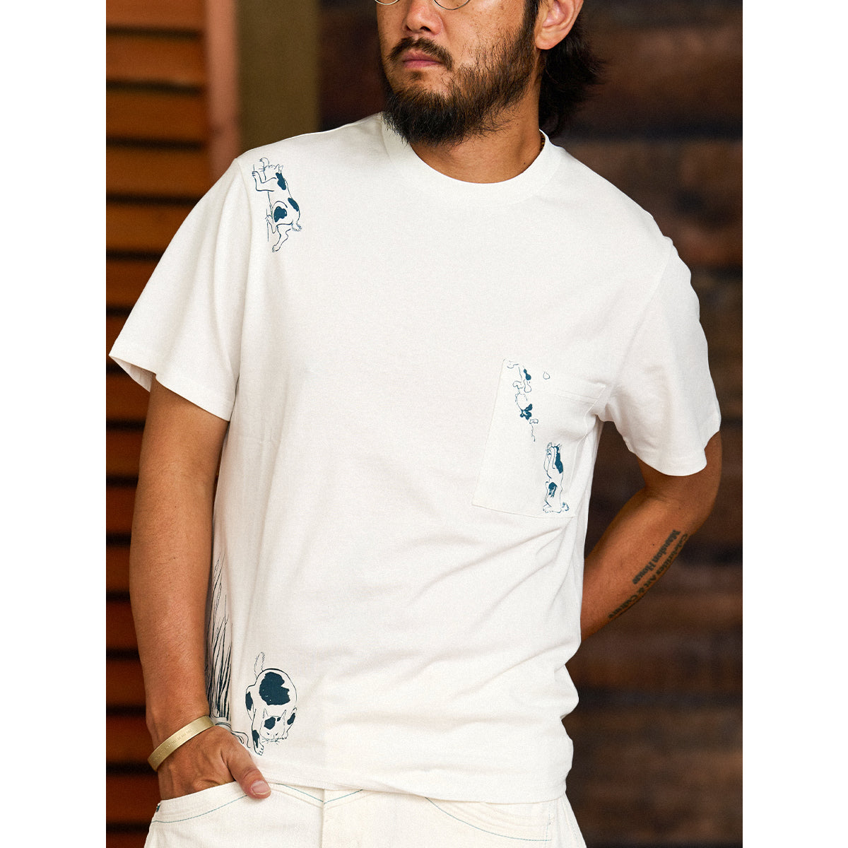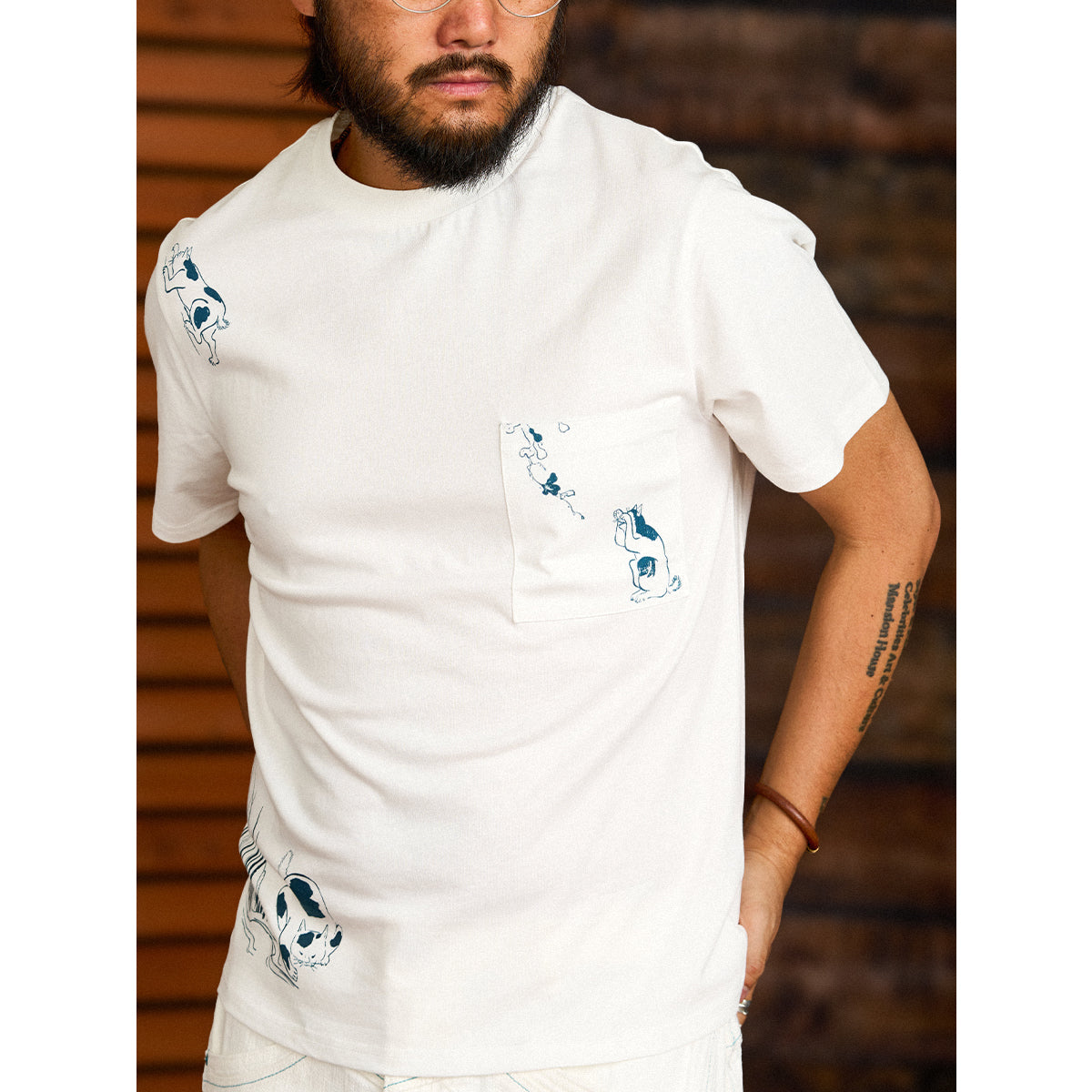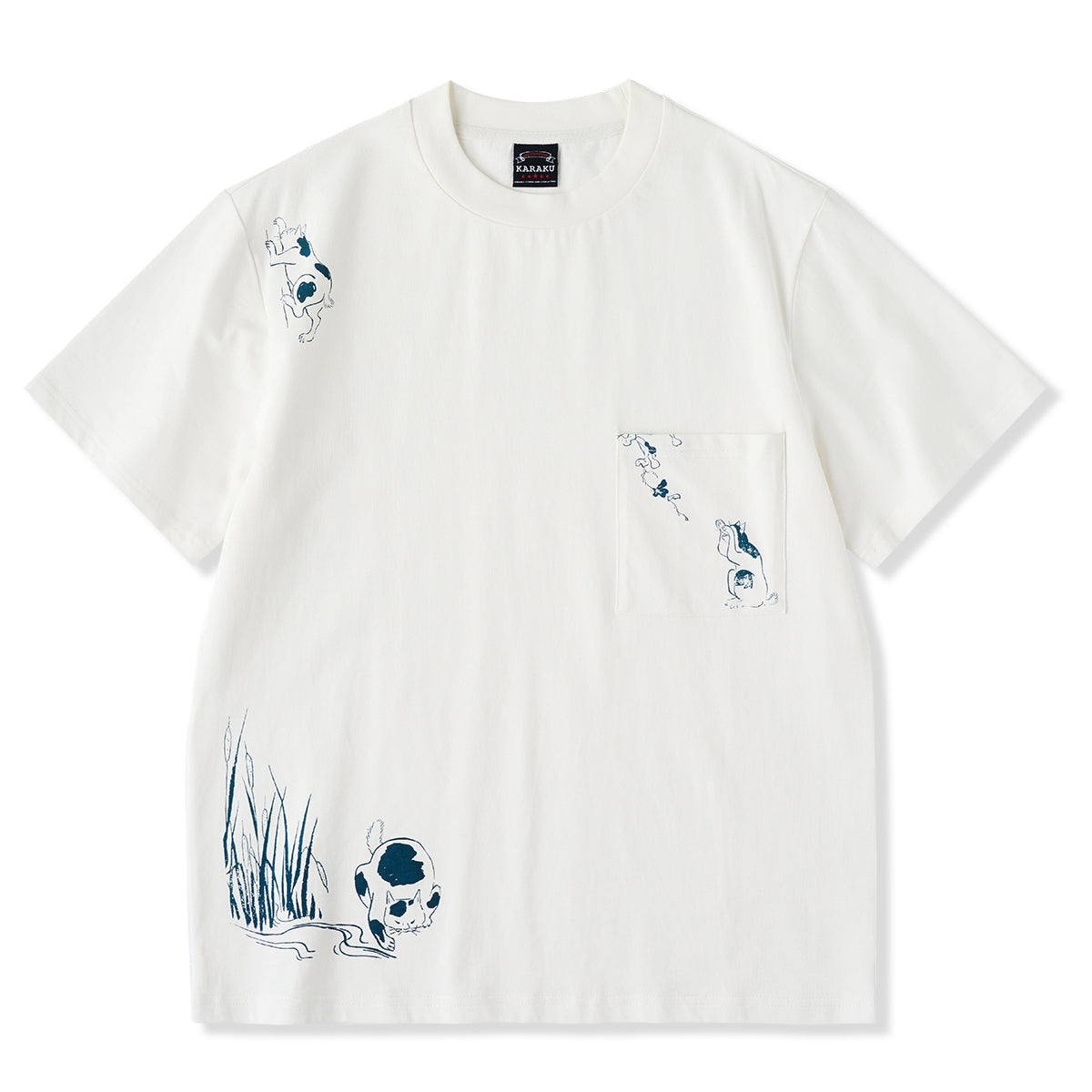 흰 바탕에 쪽빛 컬러로 그려진 고양이들이 유쾌한 분위기를 자아내며, 포켓에는 장난치는 고양이로 위트 있는 포인트를 더했습니다.